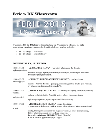 1 Ferie w DK Włoszczowa W dniach od 16 do 27 lutego w Domu Kultury we Włoszczowie odbywać się będą warsztatowe zajęcia artystyczne dla dzieci i młodzieży według podziału: • • 16 - 20 lutego 23 - 27 lutego - dla dzieci - dla młodzieży PONIEDZIAŁEK, 16 LUTEGO 10:00 - 11:00 wykorzystaniem „Z GRAFIKĄ NA TY” – warsztaty plastyczne dla dzieci z techniki frotage, wykonywanie indywidualnych, kolorowych pieczątek, tworzenie prac graficznych. 11:00 - 12:00 interesującymi „CIEKAWI LUDZIE, CIEKAWY ŚWIAT” – cykl spotkań z ludźmi – Marcin Robak – pedagog, miłośnik gier bez prądu, gier Fantazy, gry planszowe, karciane, bitewne, RPG. 12:00 - 13:00 wiedzy, „KIEDY KSIĄŻKI CZYTAM...” – zabawy z książką, drużynowy turniej zadania ze świata bajek. Zagadki, quizy, rebusy i gry rozwijające umiejętności logicznego myślenia, spostrzegawczość i wyobraźnię. 10:00 - 17:00 „FERIE Z EMISJĄ GŁOSU” (grupa dziecięca) – warsztaty wokalne wszystkich, którzy lubią śpiewać. Mogą uczestniczyć w nich osoby, które już uczęszczały na zajęcia wokalne, a także początkujący, którzy chcieliby zacząć przygodę ze śpiewem. Prowadzi: Adrianna BUJAK-CYRAN (Kraków) /CENA 50 zł za tygodniowy cykl zajęć/ str. 1 2 WTOREK, 17 LUTEGO 10:00 - 11:30 3D „SEANS W KINIE MUZA” – film „Dzwoneczek i Bestia z Nibylandii” /CENA 15 zł/ 10:00 - 11:00 zimowe „ZANIM WRÓCĄ BOCIANY” – konkurs plastyczny na najpiękniejsze krajobrazy, pejzaże ze śniegiem. Zabawy ruchowe na śniegu. 11:00 - 12:00 interesującymi „CIEKAWI LUDZIE, CIEKAWY ŚWIAT” – cykl spotkań z ludźmi – Justyna Pośpiech - studentka grafiki, członek Klubu Plastyka DeK-art. 12:00 - 13:00 „JAKA TO MELODIA?” śpiewamy przeboje, zajęcia wokalne i umuzykalniające, zabawy rytmiczno taneczne, usprawniające umiejętności wokalne i motoryczne. 10:00 - 17:00 „FERIE Z EMISJĄ GŁOSU” (grupa dziecięca) – warsztaty wokalne wszystkich, którzy lubią śpiewać. Mogą uczestniczyć w nich osoby, które już uczęszczały na zajęcia wokalne, a także początkujący, którzy chcieliby zacząć przygodę ze śpiewem. Prowadzi: Adrianna BUJAK-CYRAN (Kraków) /CENA 50 zł za tygodniowy cykl zajęć/ ŚRODA, 18 LUTEGO 10:00 - 11:30 zł/ „SEANS W KINIE MUZA” – film „Królowa Śniegu 2” 3D /CENA 15 11:30 - 12:00 wyświetlania „KINO OD KUCHNI” – zapoznanie dzieci z techniczną stroną filmów, obsługą projektora filmowego, zasadami zachowania się na sali kinowej oraz przy kasie biletowej /jak kupujemy bilety/ 12:00 - 13:00 w glinie, „GLINIANA RZECZYWISTOŚĆ ZACZAROWANA” – modelowanie tworzenie prac przestrzennych z masy papierowej, rozwój umiejętności plastycznych i manualnych. Poznawanie materiałów, poznawanie technik i narzędzi, zdobienie. 10:00 - 17:00 „FERIE Z EMISJĄ GŁOSU” (grupa dziecięca) – warsztaty wokalne wszystkich, którzy lubią śpiewać. Mogą uczestniczyć w nich str. 2 3 osoby, które już uczęszczały na zajęcia wokalne, a także początkujący, którzy chcieliby zacząć przygodę ze śpiewem. Prowadzi: Adrianna BUJAK-CYRAN (Kraków) /CENA 50 zł za tygodniowy cykl zajęć/ CZWARTEK, 19 LUTEGO 10:00 - 13:00 10:00 - 17:00 WYJŚCIE NA BASEN NEMO „FERIE Z EMISJĄ GŁOSU” (grupa dziecięca) – warsztaty wokalne wszystkich, którzy lubią śpiewać. Mogą uczestniczyć w nich osoby, które już uczęszczały na zajęcia wokalne, a także początkujący, którzy chcieliby zacząć przygodę ze śpiewem. Prowadzi: Adrianna BUJAK-CYRAN (Kraków) /CENA 50 zł za tygodniowy cykl zajęć/ PIĄTEK, 20 LUTEGO 10:00 - 11:30 /CENA 15 zł/ „SEANS W KINIE MUZA” – film „Pingwiny z Madagaskaru” 3D 10:00 - 11:00 akrylowych, „KARNAWAŁ” – warsztaty plastyczne z wykorzystaniem farb kolorowych i błyszczących dodatków, tworzenie masek karnawałowych. Praca z wykorzystaniem kolorów i faktur. 11:00 - 12:00 „W ZDROWYM CIELE ZDROWY DUCH” – gry i zabawy rekreacyjne, rozwijające i kształtujące sprawność ruchową dzieci, zabawy rytmiczno-taneczne. 12:00 - 13:00 „BAL KARNAWAŁOWY” - karnawałowy bal przebierańców. 10:00 - 17:00 „FERIE Z EMISJĄ GŁOSU” (grupa dziecięca) – warsztaty wokalne wszystkich, którzy lubią śpiewać. Mogą uczestniczyć w nich osoby, które już uczęszczały na zajęcia wokalne, a także początkujący, którzy chcieliby zacząć przygodę ze śpiewem. Prowadzi: Adrianna BUJAK-CYRAN (Kraków) /CENA 50 zł za tygodniowy cykl zajęć/ PONIEDZIAŁEK, 23 LUTEGO str. 3 4 10:00 - 17:00 „FERIE Z EMISJĄ GŁOSU” (grupa młodzieżowa) – warsztaty wokalne wszystkich, którzy lubią śpiewać. Mogą uczestniczyć w nich osoby, które już uczęszczały na zajęcia wokalne, a także początkujący, którzy chcieliby zacząć przygodę ze śpiewem. Prowadzi: Magdalena MICHALSKA (Kielce) /CENA 50 zł za tygodniowy cykl zajęć/ 17:00 - 20:00 „WARSZTATY TAŃCA BREAK DANCE” (grupa zaawansowana) – adresowane zarówno dla chłopców, jak i dziewcząt. Prowadzi: B-boy Kuza (Kickit Crew, Ukraina) WTOREK, 24 LUTEGO 10:00 - 17:00 „FERIE Z EMISJĄ GŁOSU” (grupa młodzieżowa) – warsztaty wokalne wszystkich, którzy lubią śpiewać. Mogą uczestniczyć w nich osoby, które już uczęszczały na zajęcia wokalne, a także początkujący, którzy chcieliby zacząć przygodę ze śpiewem. Prowadzi: Magdalena MICHALSKA (Kielce) /CENA 50 zł za tygodniowy cykl zajęć/ 10:00 - 13:00 „WARSZTATY TAŃCA BREAK DANCE” (grupa początkująca) – adresowane zarówno dla chłopców, jak i dziewcząt. Prowadzi: B-boy Kuza (Kickit Crew, Ukraina) 17:00 - 20:00 „WARSZTATY TAŃCA BREAK DANCE” (grupa zaawansowana) – adresowane zarówno dla chłopców, jak i dziewcząt. Prowadzi: B-boy Kuza (Kickit Crew, Ukraina) ŚRODA, 25 LUTEGO 10:00 - 17:00 „FERIE Z EMISJĄ GŁOSU” (grupa młodzieżowa) – warsztaty wokalne wszystkich, którzy lubią śpiewać. Mogą uczestniczyć w nich osob