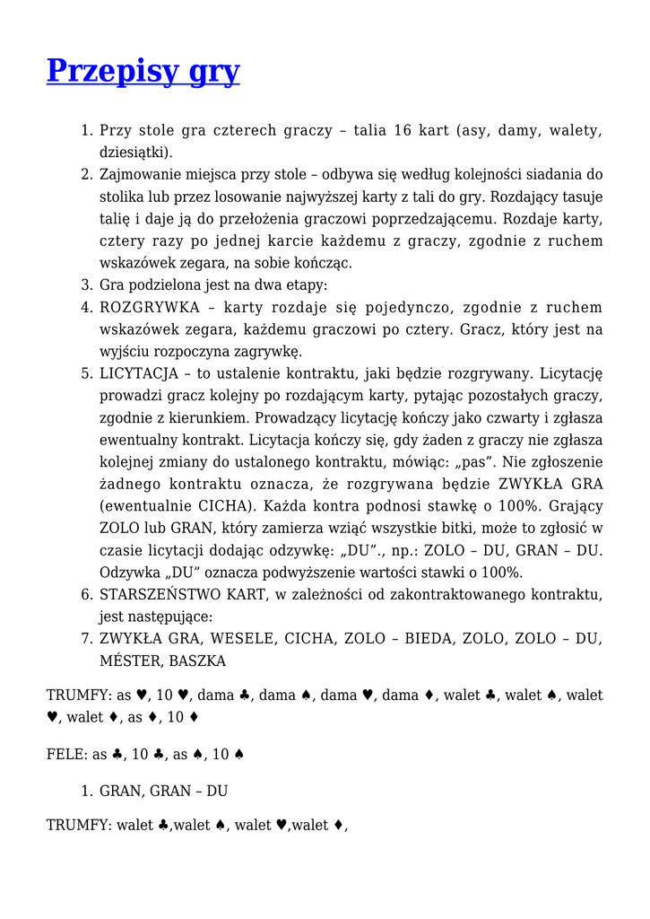 Przepisy gry 1. Przy stole gra czterech graczy – talia 16 kart (asy, damy, walety, dziesiątki). 2. Zajmowanie miejsca przy stole – odbywa się według kolejności siadania do stolika lub przez losowanie najwyższej karty z tali do gry. Rozdający tasuje talię i daje ją do przełożenia graczowi poprzedzającemu. Rozdaje karty, cztery razy po jednej karcie każdemu z graczy, zgodnie z ruchem wskazówek zegara, na sobie kończąc. 3. Gra podzielona jest na dwa etapy: 4. ROZGRYWKA – karty rozdaje się pojedynczo, zgodnie z ruchem wskazówek zegara, każdemu graczowi po cztery. Gracz, który jest na wyjściu rozpoczyna zagrywkę. 5. LICYTACJA – to ustalenie kontraktu, jaki będzie rozgrywany. Licytację prowadzi gracz kolejny po rozdającym karty, pytając pozostałych graczy, zgodnie z kierunkiem. Prowadzący licytację kończy jako czwarty i zgłasza ewentualny kontrakt. Licytacja kończy się, gdy żaden z graczy nie zgłasza kolejnej zmiany do ustalonego kontraktu, mówiąc: „pas”. Nie zgłoszenie żadnego kontraktu oznacza, że rozgrywana będzie ZWYKŁA GRA (ewentualnie CICHA). Każda kontra podnosi stawkę o 100%. Grający ZOLO lub GRAN, który zamierza wziąć wszystkie bitki, może to zgłosić w czasie licytacji dodając odzywkę: „DU”., np.: ZOLO – DU, GRAN – DU. Odzywka „DU” oznacza podwyższenie wartości stawki o 100%. 6. STARSZEŃSTWO KART, w zależności od zakontraktowanego kontraktu, jest następujące: 7. ZWYKŁA GRA, WESELE, CICHA, ZOLO – BIEDA, ZOLO, ZOLO – DU, MÉSTER, BASZKA TRUMFY: as ♥, 10 ♥, dama ♣, dama ♠, dama ♥, dama ♦, walet ♣, walet ♠, walet ♥, walet ♦, as ♦, 10 ♦ FELE: as ♣, 10 ♣, as ♠, 10 ♠ 1. GRAN, GRAN – DU TRUMFY: walet ♣,walet ♠, walet ♥,walet ♦, FELE: as ♥, 10 ♥, dama ♥, as ♣, 10 ♣, dama ♣, as ♠, 10 ♠, dama ♠, as ♦, 10 ♦, dama ♦, 5. Punktacja poszczególnych kart (oczek): as – 11 pkt, 10 – 10 pkt, dama -3 pkt. walet -2 pkt. 6. RODZAJE GIER: 7. ZWYKŁA GRA – ma miejsce wówczas, gdy żaden z licytujących nie zgłosił kontraktu (gry) indywidualnego i nie wystąpiła CICHA. W takim przypadku STARYMI zostają gracze, którzy posiadają: damę: ♣ i ♠, a dwaj pozostali są MŁODYMI. Podział na strony: STARYCH i MŁODYCH, ujawnia się dopiero podczas rozgrywki. STARZY wygrywają łącznie, gdy zdobędą minimum 53 pkt. Wyjście dla STARYCH wynosi 27 oczek. 8. WESELE – może zgłaszać ten gracz, który ma jednocześnie obie STARE DAMY: ♣ i ♠. Zgłoszenie w czasie licytacji kontraktu WESELE oznacza, że grają ze sobą zgłaszający WESELE i gracz, który ma w ręku waleta ♣ (ewentualnie w kolejności ♠ lub ♥, w przypadku, gdy określone walety ma również STARY. Kto jest drugim STARYM ujawni się dopiero podczas rozgrywki. WESELE wolno zgłosić tylko w pierwszym okrążeniu licytacji. WESELNICY traktowani są wówczas razem jak STARZY w ZWYKŁEJ GRZE. W celu wygrania muszą łącznie zdobyć ponad połowę oczek (co najmniej 53) w grze ze zwyczajnym porządkiem siły kart. 9. CICHA – gracz z CICHĄ jest pojedynczym STARYM, pozostali trzej są MŁODYMI. STARY rozgrywa grę indywidualnie przeciwko pozostałym, ale nie zgłasza tego faktu podczas licytacji. Liczy, że „po cichu” uda mu się zebrać ponad połowę oczek (co najmniej 53) i samodzielnie wygrać grę. 10. ZOLO-BIEDA – honorowe ZOLO, składające się z czterech 10 (dziesiątek). 11. GRAN – licytujący (pojedynczy zawodnik grający indywidualnie przeciwko trzem pozostałym) zobowiązuje się do wzięcia ponad połowy oczek (co najmniej 53), w grze z porządkiem siły kart właściwym dla GRANA. 12. ZOLO – licytujący (pojedynczy zawodnik grający indywidualnie przeciwko trzem pozostałym) zobowiązuje się do wzięcia ponad połowy oczek (co najmniej 53) w grze ze zwyczajnym porządkiem siły kart. 13. GRAN – DU – licytujący (pojedynczy zawodnik grający indywidualnie przeciwko trzem pozostałym) zobowiązuje się do wzięcia wszystkich czterech bitek w grze z porządkiem siły kart właściwym dla GRANA. 14. ZOLO-DU – licytujący (pojedynczy zawodnik grający indywidualnie przeciwko trzem pozostałym) zobowiązuje się do wzięcia wszystkich czterech bitek w grze ze zwyczajnym porządkiem siły kart. 15. MÉSTER – honorowe ZOLO – DU, składające się z 4 Asów. 16. BASZKA – honorowe ZOLO – DU, składające się z 4 dam – Korona BASZCZI – MÉSTER. 17. ZASADY OGÓLNE: 18. Kontry w kontrakcie liczymy tylko przeciwko przeciwnikowi tzn. w obliczeniu gry pominięte zostaną kolejne skontrowania zgłoszone przez tę samą stronę, 19. ZOLO ma pierwszeństwo przed GRANEM. 20. ZOLO – BIEDA jest niższym kontraktem od ZOLO i GRAN. 21. Nie można samemu dać sobie kontry na CICHĄ, ale można rekontrować. 22. Wyjście – dla MŁODYCH 26 oczek, dla STARYCH wynosi 27 oczek. 23. Bok – równa ilość oczek (po 52), wygrana MŁODYCH. 24. Gdy zawodnik popełni błąd (np. nie dołoży do koloru, nie przebije TRUMFA lub FELI) przegrywa na tyle ile był wylicytowany „kontrakt’’, np. ZOLO. 25. Można grać CICHA z damą karo na dobiciu, ale NIE PRZYJMUJE się KONTRY. 26. Nie wolno wychodzić kartą przed zamknięciem licytacji. 27. Obowiązuje „karta stół” i nie wolno obejrzeć bitki zabranej ze stołu. 28. Cztery D (damy) grają – BASZKA, cztery AS (asy) grają – MÉSTER, 29. 30. 31. 32. 33. cztery 10 (dziesiątki) grają ZOLO – BIEDA. Na wykładane kontrakty, np.: GRAN, ZOLO, GRAN – DU, ZOLO – DU przyjmuje się „KONTRY”. Czas na rozegranie jednej rundy to 55 min + 5 min przerwy. Po upływie 55 minut stolik, który nie dokończył gry przerywa ją – liczy się wynik w momencie przerwania. Wprowadzony zostanie zegar z sygnalizacją. Gramy 3 rundy po 40 rozdań Gramy tylko przy stolikach 4-osobowych – w przypadku większej ilości zawodników – zawodnik pauzujący (w pierwszej kolejności pauzują gracze grający indywidualnie) otr