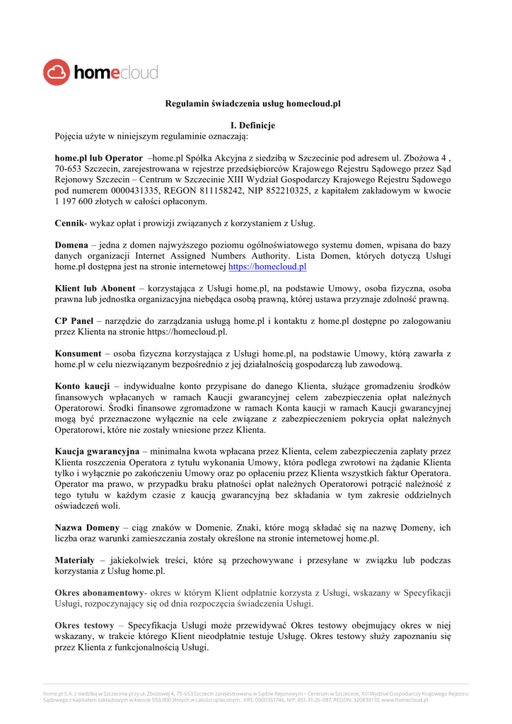Regulamin świadczenia usług homecloud.pl I. Definicje Pojęcia użyte w niniejszym regulaminie oznaczają: home.pl lub Operator –home.pl Spółka Akcyjna z siedzibą w Szczecinie pod adresem ul. Zbożowa 4 , 70-653 Szczecin, zarejestrowana w rejestrze przedsiębiorców Krajowego Rejestru Sądowego przez Sąd Rejonowy Szczecin – Centrum w Szczecinie XIII Wydział Gospodarczy Krajowego Rejestru Sądowego pod numerem 0000431335, REGON 811158242, NIP 852210325, z kapitałem zakładowym w kwocie 1 197 600 złotych w całości opłaconym. Cennik- wykaz opłat i prowizji związanych z korzystaniem z Usług. Domena – jedna z domen najwyższego poziomu ogólnoświatowego systemu domen, wpisana do bazy danych organizacji Internet Assigned Numbers Authority. Lista Domen, których dotyczą Usługi home.pl dostępna jest na stronie internetowej https://homecloud.pl Klient lub Abonent – korzystająca z Usługi home.pl, na podstawie Umowy, osoba fizyczna, osoba prawna lub jednostka organizacyjna niebędąca osobą prawną, której ustawa przyznaje zdolność prawną. CP Panel – narzędzie do zarządzania usługą home.pl i kontaktu z home.pl dostępne po zalogowaniu przez Klienta na stronie https://homecloud.pl. Konsument – osoba fizyczna korzystająca z Usługi home.pl, na podstawie Umowy, którą zawarła z home.pl w celu niezwiązanym bezpośrednio z jej działalnością gospodarczą lub zawodową. Konto kaucji – indywidualne konto przypisane do danego Klienta, służące gromadzeniu środków finansowych wpłacanych w ramach Kaucji gwarancyjnej celem zabezpieczenia opłat należnych Operatorowi. Środki finansowe zgromadzone w ramach Konta kaucji w ramach Kaucji gwarancyjnej mogą być przeznaczone wyłącznie na cele związane z zabezpieczeniem pokrycia opłat należnych Operatorowi, które nie zostały wniesione przez Klienta. Kaucja gwarancyjna – minimalna kwota wpłacana przez Klienta, celem zabezpieczenia zapłaty przez Klienta roszczenia Operatora z tytułu wykonania Umowy, która podlega zwrotowi na żądanie Klienta tylko i wyłącznie po zakończeniu Umowy oraz po opłaceniu przez Klienta wszystkich faktur Operatora. Operator ma prawo, w przypadku braku płatności opłat należnych Operatorowi potrącić należność z tego tytułu w każdym czasie z kaucją gwarancyjną bez składania w tym zakresie oddzielnych oświadczeń woli. Nazwa Domeny – ciąg znaków w Domenie. Znaki, które mogą składać się na nazwę Domeny, ich liczba oraz warunki zamieszczania zostały określone na stronie internetowej home.pl. Materiały – jakiekolwiek treści, które są przechowywane i przesyłane w związku lub podczas korzystania z Usług home.pl. Okres abonamentowy- okres w którym Klient odpłatnie korzysta z Usługi, wskazany w Specyfikacji Usługi, rozpoczynający się od dnia rozpoczęcia świadczenia Usługi. Okres testowy – Specyfikacja Usługi może przewidywać Okres testowy obejmujący okres w niej wskazany, w trakcie którego Klient nieodpłatnie testuje Usługę. Okres testowy służy zapoznaniu się przez Klienta z funkcjonalnością Usługi. Okres Trwania Umowy- okres od dnia zawarcia Umowy do dnia zakończenia Okresu abonamentowego. Oprogramowanie – oprogramowanie, które zostało dostarczone przez home.pl Klientowi niezależnie od sposobu i formy dostarczenia, w tym jego utrwalenie w pamięci urządzenia końcowego Klienta przez pobranie za pośrednictwem Internetu oraz aplikacje dostępne dla Klienta zdalnie, za pośrednictwem Internetu. Przedsiębiorca - osoba fizyczna, osoba prawna i jednostka organizacyjna niebędąca osobą prawną, której odrębna ustawa przyznaje zdolność prawną - wykonująca we własnym imieniu działalność gospodarczą lub zawodową. Regulamin – niniejszy Regulamin, dostępny na stronie https://homecloud.pl. Rejestr – podmiot zarządzający Domeną, wykonujący rejestrację i utrzymanie Nazw w tej Domenie lub inne czynności dotyczące Nazwy Domeny, opisane w regulaminach, którymi posługuje się Rejestr. Rejestracja – to jest dokonanie przez Klienta wszystkich czynności koniecznych do korzystania z CP Panelu i zawarcia umowy o świadczenie usług na rzecz Klienta przez home.pl. Siła wyższa – zdarzenie niezależne od Strony, zewnętrzne, niemożliwe do przewidzenia i do zapobieżenia nawet przy dochowaniu najwyższej staranności. Strony – home.pl oraz Klient. Specyfikacja Usługi - opis właściwości danej Usługi, w tym Okres abonamentowy, Okres testowy, moment rozpoczęcia świadczenia Usługi home.pl, parametry techniczne, warunki techniczne i sprzętowe. Umowa – umowa zawarta pomiędzy Stronami, której integralną część stanowi Regulamin. Urządzenia home.pl – urządzenia teleinformatyczne home.pl przeznaczone do świadczenia Usług home.pl, a w szczególności do przechowywania i transmisji danych oraz dostępu do Internetu. Usługi home.pl – usługi świadczone elektronicznie przez home.pl dla Klienta, zgodnie z treścią Regulaminu. Zawieszenie świadczenia Usługi home.pl – uniemożliwienie Klientowi dostępu do korzystania z Usługi home.pl świadczonej na rzecz Klienta. II. Postanowienia wspólne dla wszystkich Usług home.pl. 1. Postanowienia ogólne. 1. 2. Klient zobowiązuje się do przestrzegania postanowień Regulaminu oraz Umowy. Zawarcie Umowy poprzedza Rejestracja. Dane wymagane dla Rejestracji Klient podaje w formularzu rejestracyjnym znajdującym się na stronie internetowej https://homecloud.pl, zgodnie z zakresem określonym w tym formularzu. W szczególności Klient jest zobowiązany podać kraj i adres stałego zamieszkania lub zwykłego pobytu a nadto akceptując Regulamin Klient oświadcza, że wskazał te dane w sposób zgodny ze stanem faktycznym. W przypadku stwierdzenia przez właściwe organy podatkowe, że Klient dane, o których mowa w zdaniu 3. 4. 5. 6. 7. 8. 9. 10. 11. poprzednim, podał w skutek zawinionych przez niego działań lub zaniechań niezgodnie ze stanem 