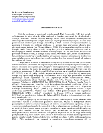 Dr Ryszard Szarfenberg Uniwersytet Warszawski Instytut Polityki Społecznej www.ips.uw.edu.pl/rszarf/ [email protected] Zamieszanie wokół EMS Polityka społeczna w państwach członkowskich Unii Europejskiej (UE) jest na tyle zróżnicowana, że mówi się o jej kilku modelach z charakterystycznymi dla nich krajami – Szwecją, Niemcami i Wielką Brytanią. Do tego można dodać odrębności charakterystyczne dla Europy Południowej oraz kolejne, dotyczące krajów postkomunistycznych. Z kolei, przy porównaniach modelowych Europy Zachodniej z USA różnice wewnątrzeuropejskie są pomijane i traktuje się politykę społeczną w krajach tego pierwszego obszaru jako niezróżnicowaną jedność (np. Alesina, Glaeser, 2004). W obu przypadkach (różne modele w Europie, model Europy a inne modele) mamy do czynienia z badaniami porównawczymi, w których pojęcie modelu nie ma charakteru normatywnego, tzn. nie jest istotne, który model powinien być naśladowany, a którego należy unikać. Określenia typu „model skandynawski” lub „model europejski” są w tym kontekście użytecznymi naukowo abstrakcjami, skrótowymi nazwami dla wzorów stwierdzonych w wyniku analizy danych z jednostek takich jak państwa lub większe ich zbiory. Z tego punktu widzenia europejski model społeczny (EMS) istnieje tam, gdzie da się stwierdzić różnice jakościowe lub stopnia między nim a modelami społecznymi związanymi z innymi obszarami czy organizacjami. Najpierw trzeba sprecyzować o jaką podstawę chodzi i najprościej przyjąć, że mamy do czynienia z organizacjami międzynarodowymi oraz ich wymiarem społecznym. Dyskusje wokół EMS prowadzone są w kontekście funkcjonowania UE (UEMS), a nie tak, jakby chodziło po prostu o kontynent, czy jakoś inaczej postrzeganą Europę czy cywilizację europejską. Przedmiotem badań mogą być porównania wymiaru społecznego takich organizacji, jak UE, Organizacja Państw Amerykańskich (OAS), Północnoamerykański Układ Wolnego Handlu (NAFTA), Wspólny Rynek Południa w Ameryce Południowej (MERCOSUR lub MERCOSUL), Strefa Wolnego Handlu Ameryk (FTAA), Stowarzyszenie Narodów Azji Południowo-Wschodniej (ASEAN), Układ o Współpracy Gospodarczej Azji i Pacyfiku (APEC), Unia Afrykańska (AU), Wspólnota Rozwoju Południowej Afryki (SADC) czy Wspólnota Gospodarcza Państw Afryki Zachodniej (ECOWAS). Wyniki tego rodzaju badań porównawczych dla organizacji MERCOSUR, SADC i ASEAN przedstawił B. Deacon (2001), a wymiar społeczny ECOWAS był przedmiotem badania R. Roberta (2004). Każda z tych organizacji ma więc swój model społeczny. Często przyjmuje się, że EMS dotyczy wartości, a nie instytucji. Moim zdaniem takie stanowisko wynika z pomieszania poziomów rozważań. Myśląc w kategoriach zbioru poszczególnych państw od razu widzimy, że ich polityki społeczne bardzo się różnią, a więc o wspólnym modelu można mówić ewentualnie tylko w sferze tego, co powinno być, a nie tego co jest (i tak jest to bardzo mocna teza, gdyż nawet bardzo różne narodowe polityki społeczne mogą mieć wspólne cechy). Co innego, gdy wchodzimy na poziom organizacji międzynarodowych, wówczas trudno od razu przyjąć za pewnik to, że nie mają one własnej polityki społecznej, która stanowi nową jakość w porównaniu ze zbiorem polityk społecznych państw członkowskich. Weźmy abstrakcyjny przykład, dwa kraje A i B z polityką społeczną PSA i PSB, postanowiły się połączyć w organizację gospodarczo-społeczną AB ze 1 wspólnymi instytucjami, które mają również pewne kompetencje w dziedzinie polityki społecznej. Wykonywanie tych kompetencji będzie więc PSAB, przy istnieniu nadal odrębnych PSA i PSB. Dlatego też nie ma sprzeczności między stwierdzeniem, że są różne modele polityki społecznej w państwach europejskich i jest też jej model europejski, który nie sprowadza się do kilku ogólnych haseł, co do których wszyscy się zgadzają. Drugie źródło zamieszania związane jest z normatywną stroną całej dyskusji. Stwierdzenie o nieistnieniu lub istnieniu EMS to jedno, ale gdy już zgodzimy się, że EMS jednak istnieje (część dyskutantów odpada upierając się, że nie), pojawiają się interesujące pytania o to, jaki on jest, jak się zmieniał, jaki może być oraz w końcu o to, jaki być powinien. W tym ostatnim przypadku spektrum możliwych stanowisk należy rozpatrywać w różnych wymiarach, np. mniej czy więcej kompetencji wspólnotowych; mniej lub bardziej pośrednie formy ich realizacji; mniej czy więcej redystrybucji za pomocą funduszy unijnych itd. Można zebrać wszystkie „mniej” i ulepić z nich stanowisko minimalistyczne oraz zrobić to samo z „więcej”, żeby uzyskać przeciwstawne do niego podejście maksymalistyczne. Minimalistami będą zapewne euro-liberałowie i zwolennicy jednolitego wspólnego wolnokonkurencyjnego rynku a maksymalistami euro-socjaliści zapewne bardziej sceptyczni co do dobroczynnych skutków strategii rynkowej, a więc cała ideologicznie uwarunkowana dyskusja wokół polityki społecznej toczona dotychczas na scenie krajowej lub w sferze ogólnej teorii przenosi się na poziom europejski. Ujmując sprawę dynamicznie, minimalistami byli zapewne twórcy Europejskiej Wspólnoty Gospodarczej (EWG), niemniej poparcie dla rozwijania wymiaru społecznego wspólnoty rosło wraz z pogarszającą się sytuacją gospodarczą w Europie co miało również instytucjonalny wyraz od 1975 (pierwszy wspólnotowy Social Action Programme). Torpedowanie tego trendu przez brytyjskich konserwatystów było dość skuteczne (tylko deklaratywna Wspólnotowa Karta Podstawowych Praw Socjalnych Pracowników, Traktat z Maastricht z deklaratywnym protokołem dotyczącym spraw społecznych, zakwestionowanie programu Poverty IV), ale skończyło się to wraz z oddaniem przez nich władzy w 1997 roku (Traktat Amsterdamski dający podstawy do prowadzenia wspólnej Europejski