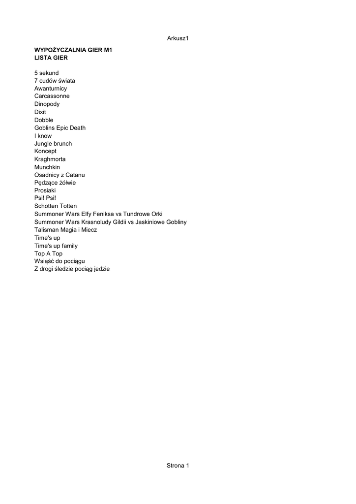 Arkusz1 WYPOŻYCZALNIA GIER M1 LISTA GIER 5 sekund 7 cudów świata Awanturnicy Carcassonne Dinopody Dixit Dobble Goblins Epic Death I know Jungle brunch Koncept Kraghmorta Munchkin Osadnicy z Catanu Pędzące żółwie Prosiaki Psi! Psi! Schotten Totten Summoner Wars Elfy Feniksa vs Tundrowe Orki Summoner Wars Krasnoludy Gildii vs Jaskiniowe Gobliny Talisman Magia i Miecz Time's up Time's up family Top A Top Wsiąść do pociągu Z drogi śledzie pociąg jedzie Strona 1