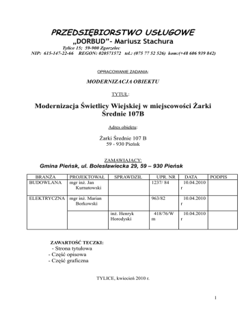 PRZEDSIĘBIORSTWO USŁUGOWE „DORBUD”- Mariusz Stachura Tylice 15; 59-900 Zgorzelec NIP: 615-147-22-66 REGON: 020571572 tel.: (075 77 52 526) kom:(+48 606 939 842) OPRACOWANIE ZADANIA: MODERNIZACJA OBIEKTU TYTUŁ: Modernizacja Świetlicy Wiejskiej w miejscowości Żarki Średnie 107B Adres obiektu: Żarki Średnie 107 B 59 - 930 Pieńsk ZAMAWIAJĄCY: Gmina Pieńsk, ul. Bolesławiecka 29, 59 – 930 Pieńsk BRANŻA BUDOWLANA PROJEKTOWAŁ mgr inż. Jan Kurnatowski SPRAWDZIŁ UPR. NR 1237/ 84 DATA PODPIS 10.04.2010 r ELEKTRYCZNA mgr inż. Marian Borkowski 963/82 10.04.2010 r inż. Henryk Horodyski 418/76/W m 10.04.2010 r ZAWARTOŚĆ TECZKI: - Strona tytułowa - Część opisowa - Część graficzna TYLICE, kwiecień 2010 r. 1 Modernizacja Świetlicy Wiejskiej w miejscowości Żarki Średnie 107B 1. DANE OGÓLNE 1.1. PODSTAWA OPRACOWANIA a) umowa zawarta między Inwestorem – Burmistrzem Miasta i Gminy Pieńsk, z siedzibą przy ulicy Bolesławieckiej 29 w Pieńsku a Wykonawcą opracowania, Przedsiębiorstwem Usługowym DORBUD - Mariusz Stachura, Tylice 15; 59-900 Zgorzelec b) uzgodnienia projektowe z inwestorem 1.2. PRZEDMIOT I ZAKRES OPRACOWANIA Przedmiot opracowania stanowi projekt koncepcji przebudowy, modernizacji i remontu obiektu ŚWIETLICY WIEJSKIEJ w miejscowości Żarki Średnie. Zakres opracowania obejmuje wykonanie koncepcji przedstawiającej rozwiązania: a)instalacji wewnętrznych – wodnej i kanalizacyjnej, elektrycznej i ogrzewania, b)propozycję wykończenia wykładzin i okładzin wewnętrznych, wykonanych w obecnych technologiach, c)modernizacji ciągu komunikacyjnego wewnątrz budynku, d)adaptacji części parteru na pomieszczenia biblioteki wiejskiej, e)wykonania ocieplenia budynku i izolacji przeciwwilgociowych, f)zmianę funkcjonalności niektórych pomieszczeń, 2 I. Opis techniczny stanu istniejącego 1. Fundamenty Ściany fundamentowe z cegły i kamienia wybudowane metodą tradycyjna na zaprawie cementowo-wapiennej grubości 46 cm. Widoczne zawilgocenia i korozje biologiczne odparzenia miejscowe tynków. Brak zabezpieczenia przeciwwilgociowego i przeciwwodnego oraz izolacji termicznej. 2. Ściany zewnętrzne Ściany zewnętrzne parteru z cegły i kamienia grubości 50 - 70 cm na zaprawie cementowo wapiennej pokryte obustronnie tynkiem cem.-wap. gr. 2,0 – 2,5 cm. Ściany piętra z cegły grubości 38 cm na zaprawie cem.-wap. pokryte tynkiem obustronnie. Widoczne na ścianach są liczne ubytki, spękania i odparzenia tynków, miejscowe zawilgocenia oraz niewielkie zarysowania na konstrukcji muru. 3. Ściany wewnętrzne Ściany wewnętrzne wykonane metodą tradycyjną murowane z cegły na zaprawie cem.-wap. Pokryte tynkami cem.-wap. gr. 2,0 -2,5 cm, niewielkie ubytki, spękania i zarysowania tynków. 4. Stropy i schody Częściowo stropy wykonano jako sklepienia odcinkowe i łukowe (parter, piwnica) i drewniane (piętro i dach) pokryte tynkiem cem.-wap. grubości 1,5 – 2,0 cm częściowo na podsufitkach trzcinowych. Schody klatki schodowej betonowe i wyjścia ewakuacyjnego także. Schody wejścia na scenę drewniane. Elementy stropów zarysowane, widoczne ślady eksploatacji i wcześniejszego zalewania pomieszczeń od dachu 5. Dach Dach płaski, dwuspadowy konstrukcji drewnianej wyremontowany pokryty dwoma warstwami papy termozgrzewalnej na zakład wraz z nowo wyremontowanym systemem odwodnienia: rynny, rury spustowe i obróbki blacharskie (opierzenia, ogniomury i pasy nadrynnowe) wykonane i zamontowane z blachy tytan-cynk gr. 0,6 mm. Kominy przemurowane ponad dachem z cegły klinkierowej pełnej. Nowa instalacja odgromowa – wykonana zgodnie z odrębnym projektem wraz z pomiarami i badaniami powykonawczymi oraz protokołami odbiorowymi. Stan techniczny dachu: dobry. 3 6. Stolarka okienna i drzwiowa Okna drewniane skrzynkowe, podwójne w większości skorodowane biologicznie, przegniłe ościeżnice, ramy, podokienniki. Widoczne liczne odkształcenia i nieszczelności nie spełniają wymogów i norm izolacyjności cieplnej. Drzwi wejściowe drewniane dwu i jednoskrzydłowe, skorodowane dolne części skrzydeł i ram. Widoczne liczne odkształcenia i nieszczelności nie spełniają wymogów i norm izolacyjności cieplnej. Stolarka okienna w całym obiekcie podlega wymianie, stolarka drzwiowa w większości do wymiany. 7. Podłogi i posadzki Podłogi piętra drewniane na legarach częściowo pokryte wykładzinami PCV typu Gumolit. W pomieszczeniu sali widowiskowej występują liczne uszkodzenia przez szkodniki (korniki) zwłaszcza przy ścianach i listwach podłogowych, podłoga wymaga remontu. Podłoga sceny i sala spotkań w dobrym stanie. Posadzki parteru wykonane z płytek terakotowych na podkładzie betonowym bez izolacji przeciwwilgociowych i termicznych wymagają gruntownego remontu. 8. Powłoki malarskie Stan techniczny powłok malarskich ścian i sufitów. Liczne odparzenia farby, zarysowania, spękania powłok z licznie miejsca z występującymi starymi zawilgoceniami. Powłoki malarskie wymagają gruntownego remontu. 9. Instalacja elektryczna Wymaga remontu (wymiany) z uwagi na zły stan techniczny. 10. Instalacje sanitarne wod-kan. W stanie złym wymagają remontu. 11. Zaopatrzenie w energie cieplną. W obecnym stanie w obiekcie brak jest stałego źródła ciepła. W budynku znajdują się jedynie piece kaflowe (sala widowiskowa) w złym stanie technicznym. Dodatkowo dwa pomieszczenia ogrzewane są za pomocą przenośnych ogrzewaczy elektrycznych o niskiej wydajności cieplnej. Obecne źródła ciepła nie zapewniają dostarczania wymaganej ilości energii cieplnej, co w znacznym stopniu przyczyniło się do zawilgocenia budynku i pogorszenia jego stanu technicznego. W ogólnej ocenie budynek wymaga gruntownego remontu i modernizacji systemu grzewczego. 4 Z uwagi na brak ogrzewania, zły stan techniczny ścian zewnętrznych, ścian fundamentowych oraz stolarki okiennej i drzwiowej cały budynek narażony jest na coraz większy proces niszczenia zaró