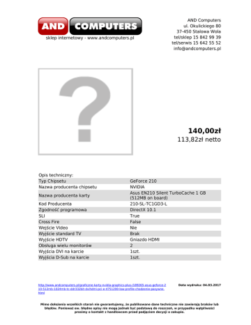 sklep internetowy - www.andcomputers.pl AND Computers ul. Okulickiego 80 37-450 Stalowa Wola tel/sklep 15 842 99 39 tel/serwis 15 642 55 52 [email protected] 140,00zł 113,82zł netto Opis techniczny: Typ Chipsetu Nazwa producenta chipsetu Nazwa producenta karty Kod Producenta Zgodność programowa SLI Cross Fire Wejście Video Wyjście standard TV Wyjście HDTV Obsługa wielu monitorów Wyjścia DVI na karcie Wyjścia D-Sub na karcie GeForce 210 NVIDIA Asus EN210 Silent TurboCache 1 GB (512MB on board) 210-SL-TC1GD3-L DirectX 10.1 True False Nie Brak Gniazdo HDMI 2 1szt. 1szt. http://www.andcomputers.pl/graficzne-karty-nvidia-graphics-plus-/189265-asus-geforce-2 10-512mb-1024mb-tc-ddr332bit-dvihdmi-pci-e-4751200-low-profile-chodzenie-pasywne. html Data wydruku: 04.03.2017 Mimo dołożenia wszelkich starań nie gwarantujemy, że publikowane dane techniczne nie zawierają braków lub błędów. Ponieważ ew. błędne opisy nie mogą jednak być podstawą do roszczeń, w przypadku wątpliwości prosimy o kontakt z handlowcem przed podjęciem decyzji o zakupie. Chłodzenie (opis) Chłodzenie chipsetu Low Profile RAMDAC Efektywne taktowanie pamięci w 3D Taktowanie procesora Procesory strumieniowe Typ pamięci Wielkość pamięci Złącze Ilość w opakowaniu zbiorczym orientacyjnie Orientacyjna waga brutto opak. zbior. Orientacyjna waga brutto www Wyposażenie Dodatkowe oprogramowanie Radiator Pasywne True 400MHz 1200MHz 475MHz 16 DDR 3 512MB PCI-Express 2.0 x 16 20szt. 11100g 502g http:::://www.asus.comwww Driver CD brak http://www.andcomputers.pl/graficzne-karty-nvidia-graphics-plus-/189265-asus-geforce-2 10-512mb-1024mb-tc-ddr332bit-dvihdmi-pci-e-4751200-low-profile-chodzenie-pasywne. html Data wydruku: 04.03.2017 Mimo dołożenia wszelkich starań nie gwarantujemy, że publikowane dane techniczne nie zawierają braków lub błędów. Ponieważ ew. błędne opisy nie mogą jednak być podstawą do roszczeń, w przypadku wątpliwości prosimy o kontakt z handlowcem przed podjęciem decyzji o zakupie.