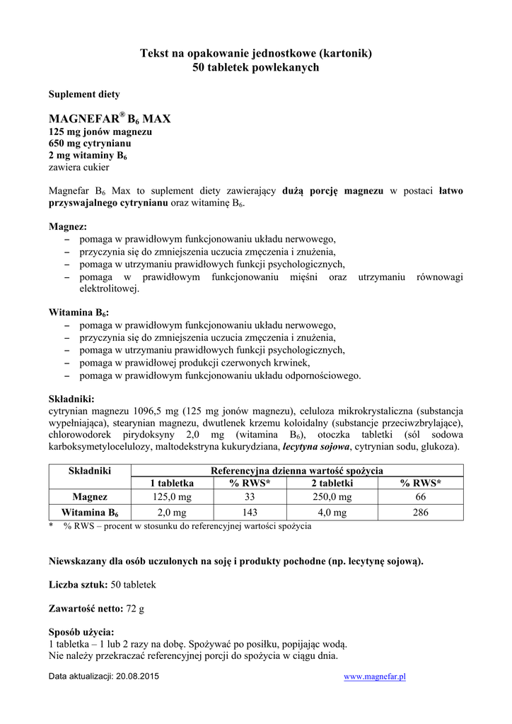 Tekst na opakowanie jednostkowe (kartonik) 50 tabletek powlekanych Suplement diety MAGNEFAR® B6 MAX 125 mg jonów magnezu 650 mg cytrynianu 2 mg witaminy B6 zawiera cukier Magnefar B6 Max to suplement diety zawierający dużą porcję magnezu w postaci łatwo przyswajalnego cytrynianu oraz witaminę B6. Magnez: − pomaga w prawidłowym funkcjonowaniu układu nerwowego, − przyczynia się do zmniejszenia uczucia zmęczenia i znużenia, − pomaga w utrzymaniu prawidłowych funkcji psychologicznych, − pomaga w prawidłowym funkcjonowaniu mięśni oraz elektrolitowej. utrzymaniu równowagi Witamina B6: − pomaga w prawidłowym funkcjonowaniu układu nerwowego, − przyczynia się do zmniejszenia uczucia zmęczenia i znużenia, − pomaga w utrzymaniu prawidłowych funkcji psychologicznych, − pomaga w prawidłowej produkcji czerwonych krwinek, − pomaga w prawidłowym funkcjonowaniu układu odpornościowego. Składniki: cytrynian magnezu 1096,5 mg (125 mg jonów magnezu), celuloza mikrokrystaliczna (substancja wypełniająca), stearynian magnezu, dwutlenek krzemu koloidalny (substancje przeciwzbrylające), chlorowodorek pirydoksyny 2,0 mg (witamina B6), otoczka tabletki (sól sodowa karboksymetylocelulozy, maltodekstryna kukurydziana, lecytyna sojowa, cytrynian sodu, glukoza). Składniki * Magnez 1 tabletka 125,0 mg Witamina B6 2,0 mg Referencyjna dzienna wartość spożycia % RWS* 2 tabletki 33 250,0 mg 143 % RWS* 66 4,0 mg 286 % RWS – procent w stosunku do referencyjnej wartości spożycia Niewskazany dla osób uczulonych na soję i produkty pochodne (np. lecytynę sojową). Liczba sztuk: 50 tabletek Zawartość netto: 72 g Sposób użycia: 1 tabletka – 1 lub 2 razy na dobę. Spożywać po posiłku, popijając wodą. Nie należy przekraczać referencyjnej porcji do spożycia w ciągu dnia. Data aktualizacji: 20.08.2015 www.magnefar.pl Warunki przechowywania: Suplement diety powinien być przechowywany w temperaturze pokojowej, poniżej 25°C, w sposób niedostępny dla małych dzieci. Kobiety w ciąży oraz karmiące piersią przed zastosowaniem powinny skonsultować się z lekarzem. Niezalecany dla osób wrażliwych i uczulonych na składniki tabletki. Suplement diety nie może być stosowany jako substytut zróżnicowanej diety. Należy prowadzić zdrowy tryb życia i stosować zróżnicowaną dietę dostarczającą organizmowi wystarczającej ilości składników odżywczych. Korzystne działanie suplementu diety występuje już po zastosowaniu 1 tabletki na dobę. Producent: BIOFARM® Sp. z o.o., ul. Wałbrzyska 13, 60-198 Poznań, Polska Data aktualizacji: 20.08.2015 www.magnefar.pl