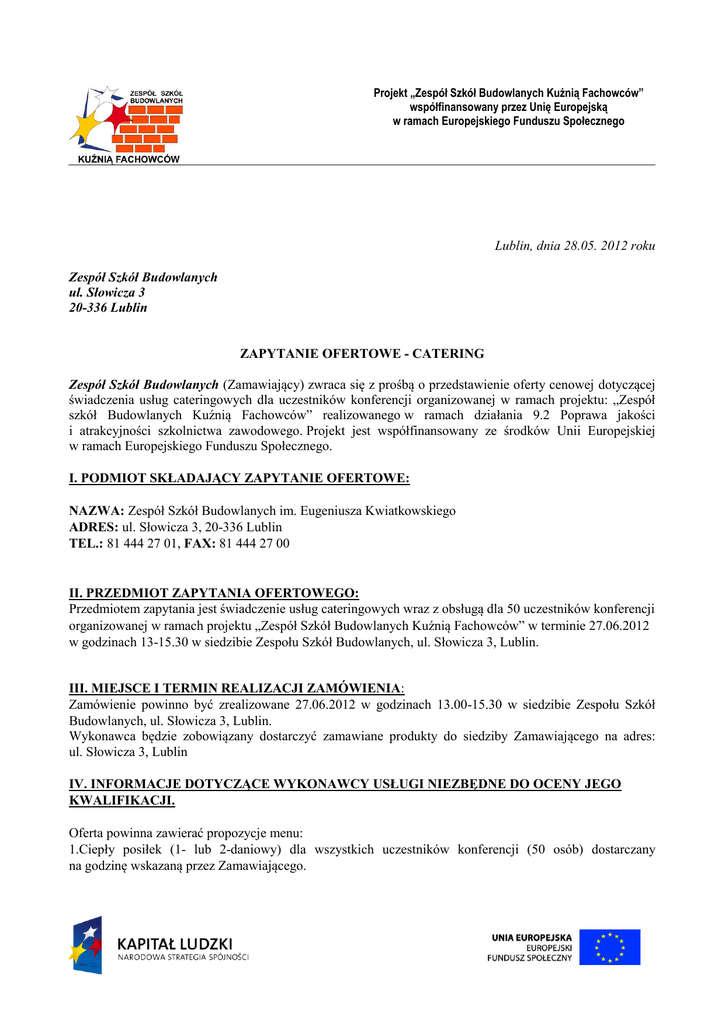 Projekt „Zespół Szkół Budowlanych Kuźnią Fachowców” współfinansowany przez Unię Europejską w ramach Europejskiego Funduszu Społecznego Lublin, dnia 28.05. 2012 roku Zespół Szkół Budowlanych ul. Słowicza 3 20-336 Lublin ZAPYTANIE OFERTOWE - CATERING Zespół Szkół Budowlanych (Zamawiający) zwraca się z prośbą o przedstawienie oferty cenowej dotyczącej świadczenia usług cateringowych dla uczestników konferencji organizowanej w ramach projektu: „Zespół szkół Budowlanych Kuźnią Fachowców” realizowanego w ramach działania 9.2 Poprawa jakości i atrakcyjności szkolnictwa zawodowego. Projekt jest współfinansowany ze środków Unii Europejskiej w ramach Europejskiego Funduszu Społecznego. I. PODMIOT SKŁADAJĄCY ZAPYTANIE OFERTOWE: NAZWA: Zespół Szkół Budowlanych im. Eugeniusza Kwiatkowskiego ADRES: ul. Słowicza 3, 20-336 Lublin TEL.: 81 444 27 01, FAX: 81 444 27 00 II. PRZEDMIOT ZAPYTANIA OFERTOWEGO: Przedmiotem zapytania jest świadczenie usług cateringowych wraz z obsługą dla 50 uczestników konferencji organizowanej w ramach projektu „Zespół Szkół Budowlanych Kuźnią Fachowców” w terminie 27.06.2012 w godzinach 13-15.30 w siedzibie Zespołu Szkół Budowlanych, ul. Słowicza 3, Lublin. III. MIEJSCE I TERMIN REALIZACJI ZAMÓWIENIA: Zamówienie powinno być zrealizowane 27.06.2012 w godzinach 13.00-15.30 w siedzibie Zespołu Szkół Budowlanych, ul. Słowicza 3, Lublin. Wykonawca będzie zobowiązany dostarczyć zamawiane produkty do siedziby Zamawiającego na adres: ul. Słowicza 3, Lublin IV. INFORMACJE DOTYCZĄCE WYKONAWCY USŁUGI NIEZBĘDNE DO OCENY JEGO KWALIFIKACJI. Oferta powinna zawierać propozycje menu: 1.Ciepły posiłek (1- lub 2-daniowy) dla wszystkich uczestników konferencji (50 osób) dostarczany na godzinę wskazaną przez Zamawiającego. Projekt „Zespół Szkół Budowlanych Kuźnią Fachowców” współfinansowany przez Unię Europejską w ramach Europejskiego Funduszu Społecznego 2.Zimny bufet (przekąski, sałatki, ciastka/ciasto) wraz z napojami (woda, soki) dostarczony na godzinę wskazaną przez Zamawiającego. 3.Barek kawowy (dostarczenie termosów z wrzątkiem, kawy rozpuszczalnej oraz herbaty expressowej czarnej i owocowej) 4.Zamówienie obejmuje również przygotowanie stołów, naczynia, obsługę. 5.Wykonawca zobowiązuje się do zabrania swoich rzeczy w dniu świadczenia usługi zaraz po jej zakończeniu. V. DOKUMENTY WYMAGANE OD OFERENTA 1. Formularz oferty wraz ze szczegółową kalkulacją ceny oferty zgodny ze wzorem stanowiącym Załącznik nr 1 do niniejszego Zapytania Ofertowego oraz załącznik nr 2 Formularz oferty. VI. OSOBA ZE STRONY ZAMAWIAJĄCEGO UPRAWNIONA DO KONTAKTU: Anna Konderak, tel. kom. 603 228 933, adres email: [email protected] VII. MIEJSCE I TERMIN ZŁOŻENIA OFERTY: Ofertę należy przekazać w terminie do dnia: 10.06.2012 r. na formularzu stanowiącym Załącznik nr 1 i nr 2 do niniejszego Zapytania Ofertowego. O ważności oferty decyduje data wpłynięcia dokumentów . Ofertę można: a) przesłać e-mailem (skan oferty z podpisami osób upoważnionych do reprezentacji) na adres: [email protected] b) przesłać na adres biura Projektu: Biuro Projektu „Zespół Szkół Budowlanych Kuźnią Fachowców” Zespół Szkół Budowlanych , ul. Słowicza 3, 20-336 Lublin c) przesłać faksem: 81 444 27 00 VIII. KRYTERIA WYBORU OFERTY NAJKORZYSTNIEJSZEJ OFERTY; Zamawiający dokona wyboru oferty najkorzystniejszej w oparciu o następujące kryteria: -cena za wykonanie całości zamówienia składającego się z produktów wybranych przez Zamawiającego oraz obsługi (50%) -jakość menu – jej zgodność z zapisami w punkcie IV (50%) Zamawiający udzieli zamówienia temu wykonawcy, który zaproponuje najkorzystniejszą ofertę. IX. INFORMACJE DOTYCZĄCE WYBORU NAJKORZYSTNIEJSZEJ OFERTY: Uprzejmie informujemy, że zastrzegamy sobie prawo kontaktu wyłącznie z wybranym Wykonawcą. Po wyborze Wykonawcy zastrzegamy sobie prawo negocjacji warunków zamówienia. Projekt „Zespół Szkół Budowlanych Kuźnią Fachowców” współfinansowany przez Unię Europejską w ramach Europejskiego Funduszu Społecznego X. WARUNKI PŁATNOŚCI: Wynagrodzenie będzie płatne Wykonawcy w ciągu 21 dni od daty dostarczenia Zamawiającemu poprawnie wykonanego dokumentu księgowego w postaci rachunku/Faktury VAT przedłożonego i zaakceptowanego przez osobę upoważnioną. 10. .ZAŁĄCZNIKI: 1) Formularz oferty 2) Szczegółowa Kalkulacja Ceny Oferty Niniejsze zapytanie ofertowe nie stanowi zobowiązania ZSB do zawarcia umowy. Anna Konderak specjalista ds. promocji i ewaluacji Projekt „Zespół Szkół Budowlanych Kuźnią Fachowców” współfinansowany przez Unię Europejską w ramach Europejskiego Funduszu Społecznego załącznik nr 1 Szczegółowa Kalkulacja Ceny Oferty Usługa cateringowa dla uczestników konferencji organizowanej w ramach projektu: „Zespół szkół Budowlanych Kuźnią Fachowców” realizowanego w ramach działania 9.2 Poprawa jakości i atrakcyjności szkolnictwa zawodowego. Projekt jest współfinansowany ze środków Unii Europejskiej w ramach Europejskiego Funduszu Społecznego. Lp. 1. 2. 3. Przedmiot zamówienia Menu (nazwa potrawy i gramatura/ilość) Cena …...................................................... .......................... ......................... …...................................................... .......................... ......................... …...................................................... .......................... .......................... …...................................................... .......................... .......................... …...................................................... .......................... .......................... …...................................................... .......................... .......................... …...........................................