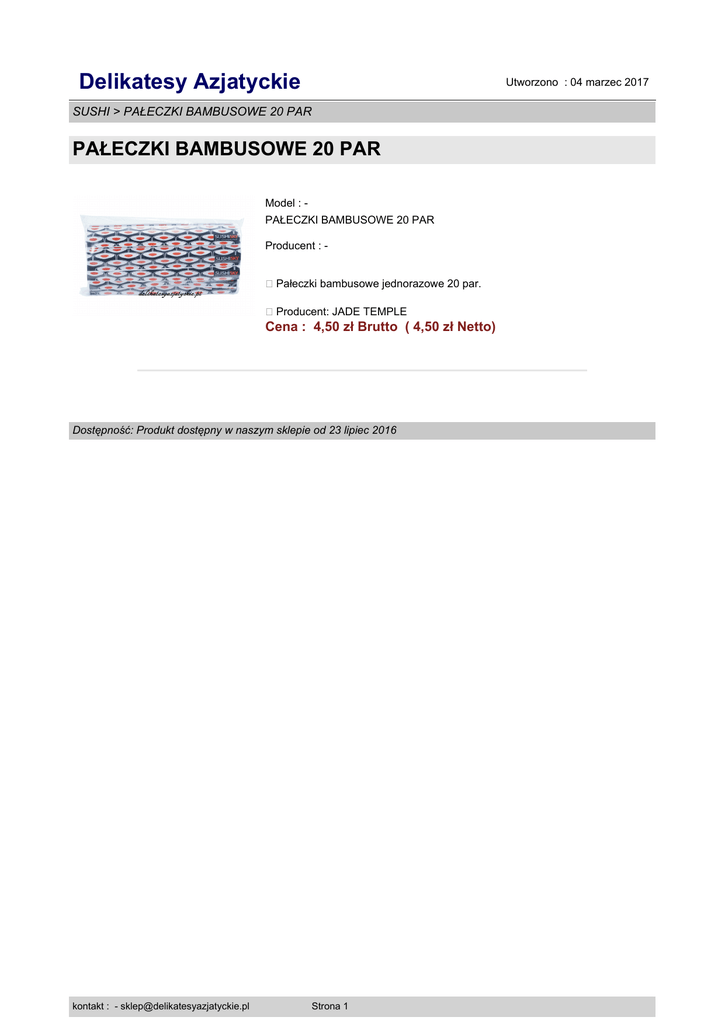 Delikatesy Azjatyckie Utworzono : 04 marzec 2017 SUSHI > PAŁECZKI BAMBUSOWE 20 PAR PAŁECZKI BAMBUSOWE 20 PAR Model : PAŁECZKI BAMBUSOWE 20 PAR Producent : Pałeczki bambusowe jednorazowe 20 par. Producent: JADE TEMPLE Cena : 4,50 zł Brutto ( 4,50 zł Netto) Dostępność: Produkt dostępny w naszym sklepie od 23 lipiec 2016 kontakt : - [email protected] Strona 1