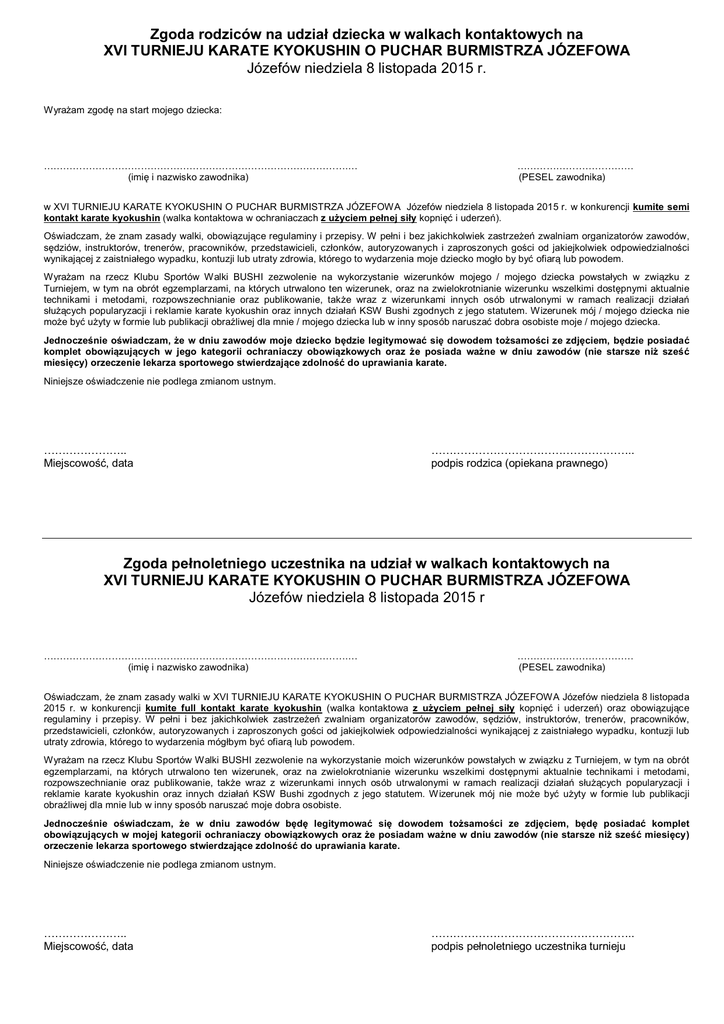 Zgoda rodziców na udział dziecka w walkach kontaktowych na XVI TURNIEJU KARATE KYOKUSHIN O PUCHAR BURMISTRZA JÓZEFOWA Józefów niedziela 8 listopada 2015 r. Wyrażam zgodę na start mojego dziecka: ………………………………………………………………………………….… (imię i nazwisko zawodnika) ……………………………… (PESEL zawodnika) w XVI TURNIEJU KARATE KYOKUSHIN O PUCHAR BURMISTRZA JÓZEFOWA Józefów niedziela 8 listopada 2015 r. w konkurencji kumite semi kontakt karate kyokushin (walka kontaktowa w ochraniaczach z użyciem pełnej siły kopnięć i uderzeń). Oświadczam, że znam zasady walki, obowiązujące regulaminy i przepisy. W pełni i bez jakichkolwiek zastrzeżeń zwalniam organizatorów zawodów, sędziów, instruktorów, trenerów, pracowników, przedstawicieli, członków, autoryzowanych i zaproszonych gości od jakiejkolwiek odpowiedzialności wynikającej z zaistniałego wypadku, kontuzji lub utraty zdrowia, którego to wydarzenia moje dziecko mogło by być ofiarą lub powodem. Wyrażam na rzecz Klubu Sportów Walki BUSHI zezwolenie na wykorzystanie wizerunków mojego / mojego dziecka powstałych w związku z Turniejem, w tym na obrót egzemplarzami, na których utrwalono ten wizerunek, oraz na zwielokrotnianie wizerunku wszelkimi dostępnymi aktualnie technikami i metodami, rozpowszechnianie oraz publikowanie, także wraz z wizerunkami innych osób utrwalonymi w ramach realizacji działań służących popularyzacji i reklamie karate kyokushin oraz innych działań KSW Bushi zgodnych z jego statutem. Wizerunek mój / mojego dziecka nie może być użyty w formie lub publikacji obraźliwej dla mnie / mojego dziecka lub w inny sposób naruszać dobra osobiste moje / mojego dziecka. Jednocześnie oświadczam, że w dniu zawodów moje dziecko będzie legitymować się dowodem tożsamości ze zdjęciem, będzie posiadać komplet obowiązujących w jego kategorii ochraniaczy obowiązkowych oraz że posiada ważne w dniu zawodów (nie starsze niż sześć miesięcy) orzeczenie lekarza sportowego stwierdzające zdolność do uprawiania karate. Niniejsze oświadczenie nie podlega zmianom ustnym. ………………….. Miejscowość, data ……………………………………………….. podpis rodzica (opiekana prawnego) Zgoda pełnoletniego uczestnika na udział w walkach kontaktowych na XVI TURNIEJU KARATE KYOKUSHIN O PUCHAR BURMISTRZA JÓZEFOWA Józefów niedziela 8 listopada 2015 r ………………………………………………………………………………….… (imię i nazwisko zawodnika) ……………………………… (PESEL zawodnika) Oświadczam, że znam zasady walki w XVI TURNIEJU KARATE KYOKUSHIN O PUCHAR BURMISTRZA JÓZEFOWA Józefów niedziela 8 listopada 2015 r. w konkurencji kumite full kontakt karate kyokushin (walka kontaktowa z użyciem pełnej siły kopnięć i uderzeń) oraz obowiązujące regulaminy i przepisy. W pełni i bez jakichkolwiek zastrzeżeń zwalniam organizatorów zawodów, sędziów, instruktorów, trenerów, pracowników, przedstawicieli, członków, autoryzowanych i zaproszonych gości od jakiejkolwiek odpowiedzialności wynikającej z zaistniałego wypadku, kontuzji lub utraty zdrowia, którego to wydarzenia mógłbym być ofiarą lub powodem. Wyrażam na rzecz Klubu Sportów Walki BUSHI zezwolenie na wykorzystanie moich wizerunków powstałych w związku z Turniejem, w tym na obrót egzemplarzami, na których utrwalono ten wizerunek, oraz na zwielokrotnianie wizerunku wszelkimi dostępnymi aktualnie technikami i metodami, rozpowszechnianie oraz publikowanie, także wraz z wizerunkami innych osób utrwalonymi w ramach realizacji działań służących popularyzacji i reklamie karate kyokushin oraz innych działań KSW Bushi zgodnych z jego statutem. Wizerunek mój nie może być użyty w formie lub publikacji obraźliwej dla mnie lub w inny sposób naruszać moje dobra osobiste. Jednocześnie oświadczam, że w dniu zawodów będę legitymować się dowodem tożsamości ze zdjęciem, będę posiadać komplet obowiązujących w mojej kategorii ochraniaczy obowiązkowych oraz że posiadam ważne w dniu zawodów (nie starsze niż sześć miesięcy) orzeczenie lekarza sportowego stwierdzające zdolność do uprawiania karate. Niniejsze oświadczenie nie podlega zmianom ustnym. ………………….. Miejscowość, data ……………………………………………….. podpis pełnoletniego uczestnika turnieju