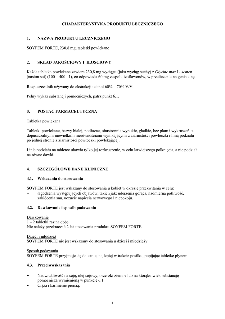 CHARAKTERYSTYKA PRODUKTU LECZNICZEGO 1. NAZWA PRODUKTU LECZNICZEGO SOYFEM FORTE, 230,8 mg, tabletki powlekane 2. SKŁAD JAKOŚCIOWY I ILOŚCIOWY Każda tabletka powlekana zawiera 230,8 mg wyciągu (jako wyciąg suchy) z Glycine max L. semen (nasion soi) (100 – 400 : 1), co odpowiada 60 mg zespołu izoflawonów, w przeliczeniu na genisteinę. Rozpuszczalnik używany do ekstrakcji: etanol 60% – 70% V/V. Pełny wykaz substancji pomocniczych, patrz punkt 6.1. 3. POSTAĆ FARMACEUTYCZNA Tabletka powlekana Tabletki powlekane, barwy białej, podłużne, obustronnie wypukłe, gładkie, bez plam i wykruszeń, z dopuszczalnymi niewielkimi nierównościami wynikającymi z ziarnistości powłoczki i linią podziału po jednej stronie z ziarnistości powłoczki powlekającej. Linia podziału na tabletce ułatwia tylko jej rozkruszenie, w celu łatwiejszego połknięcia, a nie podział na równe dawki. 4. SZCZEGÓŁOWE DANE KLINICZNE 4.1. Wskazania do stosowania SOYFEM FORTE jest wskazany do stosowania u kobiet w okresie przekwitania w celu: łagodzenia występujących objawów, takich jak: uderzenia gorąca, nadmierna potliwość, zakłócenia snu, uczucie napięcia nerwowego i niepokoju. 4.2. Dawkowanie i sposób podawania Dawkowanie 1 – 2 tabletki raz na dobę Nie należy przekraczać 2 lat stosowania produktu SOYFEM FORTE. Dzieci i młodzież SOYFEM FORTE nie jest wskazany do stosowania u dzieci i młodzieży. Sposób podawania SOYFEM FORTE przyjmuje się doustnie, najlepiej w trakcie posiłku, popijając tabletkę płynem. 4.3. Przeciwwskazania Nadwrażliwość na soję, olej sojowy, orzeszki ziemne lub na którąkolwiek substancję pomocniczą wymienioną w punkcie 6.1. Ciąża i karmienie piersią. 1 4.4. Specjalne ostrzeżenia i środki ostrożności dotyczące stosowania Należy zachować ostrożność u kobiet z nowotworami piersi i przerostem endometrium w wywiadzie. 4.5. Interakcje z innymi produktami leczniczymi i inne rodzaje interakcji Nie zaobserwowano. 4.6. Wpływ na płodność, ciążę i laktację Produkt SOYFEM FORTE jest przeciwwskazany do stosowania w okresie ciąży i karmienia piersią. 4.7. Wpływ na zdolność prowadzenia pojazdów i obsługiwania maszyn SOYFEM FORTE nie ma wpływu lub wywiera nieistotny wpływ na zdolność prowadzenia pojazdów i obsługiwania maszyn. 4.8. Działania niepożądane Dotychczas nie stwierdzono. Zgłaszanie podejrzewanych działań niepożądanych Po dopuszczeniu produktu leczniczego do obrotu istotne jest zgłaszanie podejrzewanych działań niepożądanych. Umożliwia to nieprzerwane monitorowanie stosunku korzyści do ryzyka stosowania produktu leczniczego. Osoby należące do fachowego personelu medycznego powinny zgłaszać wszelkie podejrzewane działania niepożądane za pośrednictwem Departamentu Monitorowania Niepożądanych Działań Produktów Leczniczych Urzędu Rejestracji Produktów Leczniczych, Wyrobów Medycznych i Produktów Biobójczych Al. Jerozolimskie 181C, 02-222 Warszawa tel.: +48 22 49 21 301, faks: +48 22 49 21 309 e-mail: [email protected] Działania niepożądane można zgłaszać również podmiotowi odpowiedzialnemu. 4.9. Przedawkowanie Nie zgłoszono żadnego przypadku przedawkowania. 5. WŁAŚCIWOŚCI FARMAKOLOGICZNE 5.1. Właściwości farmakodynamiczne Grupa farmakoterapeutyczna: Inne leki ginekologiczne, pozostałe leki Kod ATC: nie przyznano kodu ATC Wyciąg z nasion soi zawiera w swoim składzie głównie izoflawony oraz białka sojowe. Mechanizm działania Przypuszczalny mechanizm działania zakłada, że izoflawony sojowe (m.in. genisteina, daidzeina) posiadają zdolność wiązania z receptorami estrogenowymi (w szczególności ER beta). Działanie estrogenne jest słabsze o około 2000 – 10 000 razy w porównaniu do 17-β-estradiolu. Uzyskane dane pochodzą z badań in vitro, w których użyto wyizolowanej genisteiny. 2 Działanie farmakodynamiczne Przyjmowanie produktu przez kobiety w okresie przekwitania, zmniejsza nasilenie dolegliwości występujących w tym okresie, takich jak uderzenia gorąca, nadmierne pocenie się, zakłócenia snu, uczucie napięcia nerwowego i niepokoju. Stosowanie produktu wraz z zachowaniem odpowiedniej diety działa ochronnie na układ sercowonaczyniowy. 5.2. Właściwości farmakokinetyczne Brak danych na temat farmakokinetyki produktu SOYFEM FORTE. Farmakokinetyka wchodzących w skład produktu izoflawonów sojowych w dużej mierze jest zależna od flory bakteryjnej jelit i jest różna w zależności od właściwości osobniczych. Glikozydy są hydrolizowane przez enzymy jelitowe -glukozydazy (wytwarzane przez bakterie jelitowe) do form aktywnych – aglikonów najpierw w jelicie cienkim, a następnie w jelicie grubym. Poniżej przedstawiono wyniki badania, w którym podawano produkt zawierający 17,24 mg izoflawonów (glikozydów) w 1 tabletce. Jednorazowo podano 3 tabletki tj. 51,7 mg izoflawonów w tym 27 mg genistyny i 21 mg daidzyny. Uzyskano następujące wyniki: Cmax (genistyna): 0,569 ± 0,294 mol/L Cmax (daidzyna): 0,396 ± 0,104 mol/L AUC (genisteina): 8,9 ± 4,7 mol 48 h/L 217 ± 103 mol 48 h/L x BMI AUC (daidzeina): 6,2 ± 1,7 mol 48 h/L 152 ± 34 mol 48 h/L x BMI AUC (equol): 9,0 ± 7,4 mol 48 h/L 222 ± 103 mol 48 h/L x BMI Tmax (daidzeina): 4–7 h T max (genisteina): 5–9 h Zhydrolizowane w jelitach glikozydy do form aktywnych biologicznie – aglikonów ulegają absorpcji, wchodzą w obieg krążenia jelitowo-wątrobowego i ostatecznie w wątrobie ulegają sprzężeniu z kwasem glukuronowym (95%), niektóre z nich wchodzą w ponowny obieg jelitowo-wątrobowy, a pozostałe w tej formie zostają wydalone z moczem i kałem w ciągu 24 godzin. 5.3. Przedkliniczne dane o bezpieczeństwie Toksyczność przewlekła W 13-tygodniowej próbie stwierdzono, iż do dawki 100 mg/kg/dobę izoflawonów sojowych (mieszanina aglikonów) nie występowały żadne zmiany czynnościowe lub anatomiczne. Po dawce 500 mg/kg/dobę stwierdzono hiperplazję nadnerczy i zmi