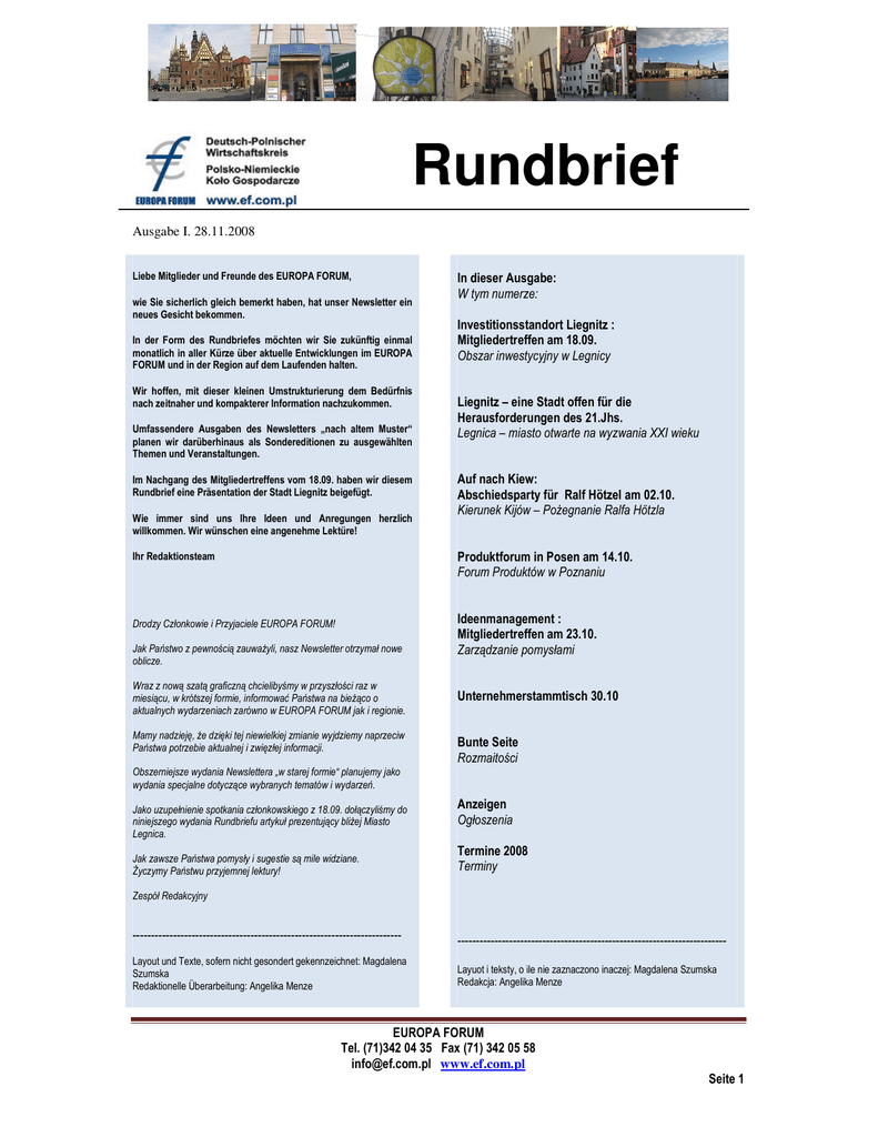 Rundbrief Ausgabe I. 28.11.2008 Liebe Mitglieder und Freunde des EUROPA FORUM, wie Sie sicherlich gleich bemerkt haben, hat unser Newsletter ein neues Gesicht bekommen. In der Form des Rundbriefes möchten wir Sie zukünftig einmal monatlich in aller Kürze über aktuelle Entwicklungen im EUROPA FORUM und in der Region auf dem Laufenden halten. Wir hoffen, mit dieser kleinen Umstrukturierung dem Bedürfnis nach zeitnaher und kompakterer Information nachzukommen. Umfassendere Ausgaben des Newsletters „nach altem Muster“ planen wir darüberhinaus als Sondereditionen zu ausgewählten Themen und Veranstaltungen. Im Nachgang des Mitgliedertreffens vom 18.09. haben wir diesem Rundbrief eine Präsentation der Stadt Liegnitz beigefügt. Wie immer sind uns Ihre Ideen und Anregungen herzlich willkommen. Wir wünschen eine angenehme Lektüre! In dieser Ausgabe: W tym numerze: Investitionsstandort Liegnitz : Mitgliedertreffen am 18.09. Obszar inwestycyjny w Legnicy Liegnitz – eine Stadt offen für die Herausforderungen des 21.Jhs. Legnica – miasto otwarte na wyzwania XXI wieku Auf nach Kiew: Abschiedsparty für Ralf Hötzel am 02.10. Kierunek Kijów – Pożegnanie Ralfa Hötzla Produktforum in Posen am 14.10. Forum Produktów w Poznaniu Ihr Redaktionsteam Drodzy Członkowie i Przyjaciele EUROPA FORUM! Jak Państwo z pewnością zauważyli, nasz Newsletter otrzymał nowe oblicze. Wraz z nową szatą graficzną chcielibyśmy w przyszłości raz w miesiącu, w krótszej formie, informować Państwa na bieżąco o aktualnych wydarzeniach zarówno w EUROPA FORUM jak i regionie. Mamy nadzieję, że dzięki tej niewielkiej zmianie wyjdziemy naprzeciw Państwa potrzebie aktualnej i zwięzłej informacji. Ideenmanagement : Mitgliedertreffen am 23.10. Zarządzanie pomysłami Unternehmerstammtisch 30.10 Bunte Seite Rozmaitości Obszerniejsze wydania Newslettera „w starej formie“ planujemy jako wydania specjalne dotyczące wybranych tematów i wydarzeń. Jako uzupełnienie spotkania członkowskiego z 18.09. dołączyliśmy do niniejszego wydania Rundbriefu artykuł prezentujący bliżej Miasto Legnica. Jak zawsze Państwa pomysły i sugestie są mile widziane. Życzymy Państwu przyjemnej lektury! Anzeigen Ogłoszenia Termine 2008 Terminy Zespół Redakcyjny ------------------------------------------------------------------------Layout und Texte, sofern nicht gesondert gekennzeichnet: Magdalena Szumska Redaktionelle Überarbeitung: Angelika Menze ------------------------------------------------------------------------Layuot i teksty, o ile nie zaznaczono inaczej: Magdalena Szumska Redakcja: Angelika Menze EUROPA FORUM Tel. (71)342 04 35 Fax (71) 342 05 58 [email protected] www.ef.com.pl Seite 1 Investitionsstandort Liegnitz - Mitgliedertreffen im September Obszar inwestycyjny w Legnicy - Spotkanie Członkowskie we wrześniu Michael Korff, Tadeusz Krzakowski, Artur Matwijow Die erste EF-Veranstaltung nach der Sommerpause am 18. September war dem Investitionsstandort in der Liegnitzer Wirtschaftszone gewidmet. Der Stadtpräsident, Tadeusz Krzakowski, im Gespräch mit Artur Matwijow, präsentierte die Stadt Legnica mit ihrem umfangreichen Angebot für Investoren. Das Interesse der Unternehmer erweckten insbesondere Informationen über aktuelle und zukünftige Bebauungspläne, Genehmigungsverfahren sowie das System der Betreuung neuer Investoren. Große Emotionen löste die Diskussion über Bodenpreise aus, die in der genannten Region deutlich über denen in vergleichbaren Standorten Ostdeutschlands liegen. Nach freundlichem Händeschütteln und der Überreichung eines Geschenkes des Stadtpräsidenten an den Präsidenten des EUROPA FORUM Michael Korff ging es weiter mit einem kurzen Erfahrungsbericht aus Sicht eines Unternehmens, das in der Liegnitzer Sonderwirtschaftszone tätig ist. Pierwsze spotkanie EF 18 września po letniej przerwie poświęcone było Legnickiej Specjalnej Strefie Ekonomicznej. Prezydent miasta, Tadeusz Krzakowski, w rozmowie z Arturem Matwijowem przedstawił miasto Legnica z jego bogatą oferta dla inwestorów. Zainteresowanie przedsiębiorców wzbudziły szczególnie informacje o aktualnych i przyszłych planach zagospodarowania przestrzennego, procedurach uzyskiwania pozwoleń jak i o systemie wsparcia dla nowych inwestorów. Spore emocje wywołała dyskusja o cenach gruntów, które w tym regionie kształtują się na zdecydowanie wyższym poziomie niż porównywalnych miejscowościach Wschodnich Niemiec. Po przyjacielskim uścisku dłoni i wręczeniu przez Prezydenta Miasta upominku Prezydentowi EUROPA FORUM Michaelowi Korffowi Tadeusz Krzakowski, Michael Korff nastąpiła krótka prezentacja firmy Matec Sp. z o.o., która działa w Legnickiej Strefie Ekonomicznej. Praktyczne uwagi oraz zdobyte doświadczenie Pana dr Müllera wzbogaciły temat wieczoru o punkt widzenia z perspektywy przedsiębiorcy. Oficjalna część spotkania została ukoronowana przywitaniem nowych Członków: EBM DRUK (Maciej Błęcki), Imtech Polska Sp. z o.o. (Thorsten Klee), Spectrum Development Sp. z o.o. (Bartosz Szczap). Dr. Lutz Müller, Matec Sp. z o.o. Der offizielle Teil wurde durch die Begrüßung neuer Mitgliedsfirmen „gekrönt“: EBM DRUK (Maciej Błęcki), Imtech Polska Sp. z o.o. (Thorsten Klee), Spectrum Development Sp. z o.o. (Bartosz Szczap). Eine kurze Präsentation des neuen Mitgliedsunternehmens, IATT TRATTNER Polska Sp. z o.o., leistete der Firmenvertreter Paweł Daniłów. Im Anschluss an den offiziellen Teil des Treffens lud der Präsident der Stadt Legnica zu einem Glas Wein. Während des Abends konnten die Gäste einheimische Spezialitäten der Firma PW „Kampol“ kosten Paweł Daniłów Przedstawiciel IATT TRATTNER Polska Sp. z o.o, Paweł Daniłów, w kilku słowach przedstawił swoją firmę. Na zakończenie oficjalnej części Prezydent Legnicy EUROPA FORUM Tel. (71)342 04 35 Fax (71) 342 05 58 [email protected] www.ef.com.pl Seite 2 zaprosił uczestników na lampkę wi