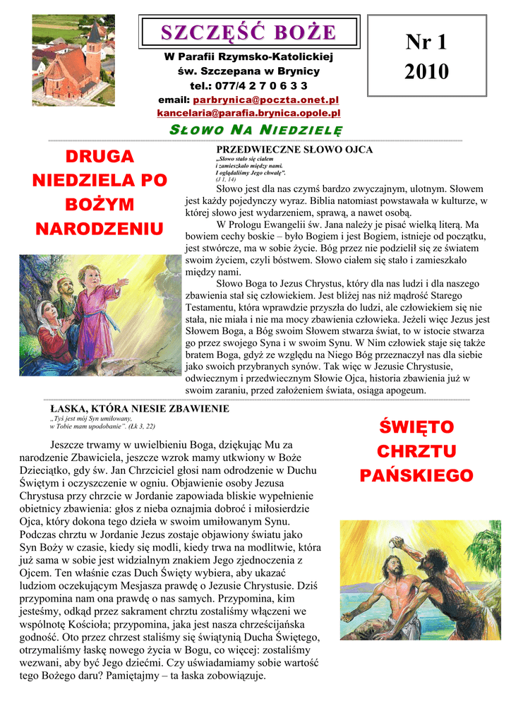 SZCZĘŚĆ BOśE Nr 1 2010 W Parafii Rzymsko-Katolickiej św. Szczepana w Brynicy tel.: 077/4 2 7 0 6 3 3 email: [email protected] [email protected] SŁOWO NA NIEDZIELĘ =========================================================================================================================================================================== DRUGA NIEDZIELA PO BOśYM NARODZENIU PRZEDWIECZNE SŁOWO OJCA „Słowo stało się ciałem i zamieszkało między nami. I oglądaliśmy Jego chwałę”. (J 1, 14) Słowo jest dla nas czymś bardzo zwyczajnym, ulotnym. Słowem jest kaŜdy pojedynczy wyraz. Biblia natomiast powstawała w kulturze, w której słowo jest wydarzeniem, sprawą, a nawet osobą. W Prologu Ewangelii św. Jana naleŜy je pisać wielką literą. Ma bowiem cechy boskie – było Bogiem i jest Bogiem, istnieje od początku, jest stwórcze, ma w sobie Ŝycie. Bóg przez nie podzielił się ze światem swoim Ŝyciem, czyli bóstwem. Słowo ciałem się stało i zamieszkało między nami. Słowo Boga to Jezus Chrystus, który dla nas ludzi i dla naszego zbawienia stał się człowiekiem. Jest bliŜej nas niŜ mądrość Starego Testamentu, która wprawdzie przyszła do ludzi, ale człowiekiem się nie stała, nie miała i nie ma mocy zbawienia człowieka. JeŜeli więc Jezus jest Słowem Boga, a Bóg swoim Słowem stwarza świat, to w istocie stwarza go przez swojego Syna i w swoim Synu. W Nim człowiek staje się takŜe bratem Boga, gdyŜ ze względu na Niego Bóg przeznaczył nas dla siebie jako swoich przybranych synów. Tak więc w Jezusie Chrystusie, odwiecznym i przedwiecznym Słowie Ojca, historia zbawienia juŜ w swoim zaraniu, przed załoŜeniem świata, osiąga apogeum. ================================================================================================================================================================================ ŁASKA, KTÓRA NIESIE ZBAWIENIE „Tyś jest mój Syn umiłowany, w Tobie mam upodobanie”. (Łk 3, 22) Jeszcze trwamy w uwielbieniu Boga, dziękując Mu za narodzenie Zbawiciela, jeszcze wzrok mamy utkwiony w BoŜe Dzieciątko, gdy św. Jan Chrzciciel głosi nam odrodzenie w Duchu Świętym i oczyszczenie w ogniu. Objawienie osoby Jezusa Chrystusa przy chrzcie w Jordanie zapowiada bliskie wypełnienie obietnicy zbawienia: głos z nieba oznajmia dobroć i miłosierdzie Ojca, który dokona tego dzieła w swoim umiłowanym Synu. Podczas chrztu w Jordanie Jezus zostaje objawiony światu jako Syn BoŜy w czasie, kiedy się modli, kiedy trwa na modlitwie, która juŜ sama w sobie jest widzialnym znakiem Jego zjednoczenia z Ojcem. Ten właśnie czas Duch Święty wybiera, aby ukazać ludziom oczekującym Mesjasza prawdę o Jezusie Chrystusie. Dziś przypomina nam ona prawdę o nas samych. Przypomina, kim jesteśmy, odkąd przez sakrament chrztu zostaliśmy włączeni we wspólnotę Kościoła; przypomina, jaka jest nasza chrześcijańska godność. Oto przez chrzest staliśmy się świątynią Ducha Świętego, otrzymaliśmy łaskę nowego Ŝycia w Bogu, co więcej: zostaliśmy wezwani, aby być Jego dziećmi. Czy uświadamiamy sobie wartość tego BoŜego daru? Pamiętajmy – ta łaska zobowiązuje. ŚWIĘTO CHRZTU PAŃSKIEGO Statystyka sakramentalna za 2009 rok Sakrament chrztu świętego 1. 2. 3. 4. 5. 6. 7. 8. 9. 10. 11. 12. 13. 14. 15. 16. 17. Imiona i nazwisko Dominik Paweł Sumliński Wiktoria Sara Pikos Emilia Adela Drost Denis Jerzy Kuka Hicham Tomasz Kania Dominik Aleksander Tkocz Zuzanna Wierszak Justyna Paulina Pacak Łukasz Michał Cebula Laura Anna Czech Olivier Krzysztof Pek Olivier Franciszek Michaś Antoni Miłosz Gleń Julia Wiktoria Gładki Bartłomiej Michał Marynik Dawid Karol Wierzgała Karolina Górecka Data ur. 03.12.2008 20.02.2009 08.03.2009 16.03.2009 18.04.2008 31.03.2009 27.03.2009 02.03.2009 14.04.2009 28.05.2009 08.07.2009 10.08.2009 01.07.2009 12.09.2009 16.10.2009 05.11.2009 15.05.2009 Data chrztu 17.01.2009 14.03.2009 18.04.2009 04.04.2009 04.04.2009 18.04.2009 09.05.2009 07.05.2009 10.05.2009 08.08.2009 22.08.2009 21.08.2009 26.09.2009 11.10.2009 24.10.2009 05.12.2009 16.05.2009 Sakrament bierzmowania - 27.04.2009 r. ks. Bp Jan Kopiec 1. 2. 3. 4. 5. 6. 7. 8. 9. 10. 11. 12. 13. 14. 15. 16. 17. Ciernia Cossbau Dendera Firlus Górska Imiełowski Jędrzejczyk Jędrzejczyk Jędrzejczyk Kandzia Klimek Niemiec Spyra Staś Wiench Wiench Wiesner Nicola Elwira śaneta Denis Daniela Tomasz Sandra Sabina Beata Sebastian Marcel Kamil Sandra Mateusz Aneta Alina Anita Pierwsza komunia święta – 7 czerwiec 2009 roku 1. 2. 3. 4. 5. 6. 7. 8. Ciernia Dajewski Emmerling Emmerling Koch Krupa Napolski Polok Mirela Dominik Waldemar Weronika Adrian Fabian Dawid Daniel 9. 10. 11. Polok Świerc Wiesner Kamil Monika Kamil Sakrament małŜeństwa Data sakramentu 1. 2. 3. 4. 5. 6. 7. 8. 9. 10. Radosław Papiewis Radosław Pawlus Mariusz Imiełowski Piotr Stiller Andrzej Richter Martin Weismann Dominik Sochor Waldemar Wiersgalla Tomasz Kremer Robert Stenzel Agnieszka Ziarko Agnieszka Pawlus Joanna Napolska Justyna Kurc Aldona Omylanowska Magdalena Weismann Iwetta Dudek Anita Widera Ewa śołneczko GraŜyna Resel 29.04.2009 26.05.2009 02.06.2009 06.06.2009 20.06.2009 27.07.2009 29.07.2009 04.08.2009 08.08.2009 25.08.2009 Odwołanie do wieczności – zmarli 1. 2. 3. 4. 5. 6. 7. 8. 9. 10. 11. 12. 13. Imię i nazwisko Maria Marsollek Reinhold Wierzgała Maria Czech Gertruda Nanko Hubert Patrzek Agnieszka Moczko Zofia Kansy Otto Pogrzeba Józef Marsollek Gerard Kowalczyk Antoni Cebula Walter Sowa Alfons Szumilas Data ur. 03.12.1927 16.05.1936 12.11.1933 08.10.1933 06.12.1929 11.04.1923 15.05.1923 18.11.1931 16.02.1947 01.10.1937 05.06.1946 28.04.1933 03.06.1934 Data śm. 02.01.2009 01.01.2009 17.01.2009 20.02.2009 25.03.2009 05.04.2009 30.05.2009 12.08.2009 28.08.2009 27.09.2009 14.10.2009 10.11.2009 28.12.2009 Wieczny odpoczynek racz im dać Panie. A światłość wiekuista niechaj im świeci. Niech odpoczywają w pokoju wiecznym. 