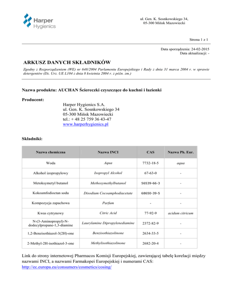 ul. Gen. K. Sosnkowskiego 34, 05-300 Mińsk Mazowiecki Strona 1 z 1 Data sporządzenia: 24-02-2015 Data aktualizacji: - ARKUSZ DANYCH SKŁADNIKÓW Zgodny z Rozporządzeniem (WE) nr 648/2004 Parlamentu Europejskiego i Rady z dnia 31 marca 2004 r. w sprawie detergentów (Dz. Urz. UE L104 z dnia 8 kwietnia 2004 r. z późn. zm.) Nazwa produktu: AUCHAN Ściereczki czyszczące do kuchni i łazienki Producent: Harper Hygienics S.A. ul. Gen. K. Sosnkowskiego 34 05-300 Mińsk Mazowiecki tel.: + 48 25 759 36 43-47 www.harperhygienics.pl Składniki: Nazwa chemiczna Nazwa INCI CAS Nazwa Ph. Eur. Woda Aqua 7732-18-5 aqua Alkohol izopropylowy Isopropyl Alcohol 67-63-0 - Metoksymetyl butanol Methoxymethylbutanol 56539-66-3 - Kokoamfodioctan sodu Disodium Cocoamphodiacetate 68650-39-5 - Kompozycja zapachowa Parfum - - Kwas cytrynowy Citric Acid 77-92-9 acidum citricum N-(3-Aminopropyl)-Ndodecylpropane-1,3-diamine Laurylamine Dipropylenediamine 2372-82-9 - 1,2-Benzisothiazol-3(2H)-one Benzisothiazolinone 2634-33-5 - 2-Methyl-2H-isothiazol-3-one Methylisothiazolinone 2682-20-4 - Link do strony internetowej Pharmacos Komisji Europejskiej, zawierającej tabelę korelacji między nazwami INCI, a nazwami Farmakopei Europejskiej i numerami CAS: http://ec.europa.eu/consumers/cosmetics/cosing/