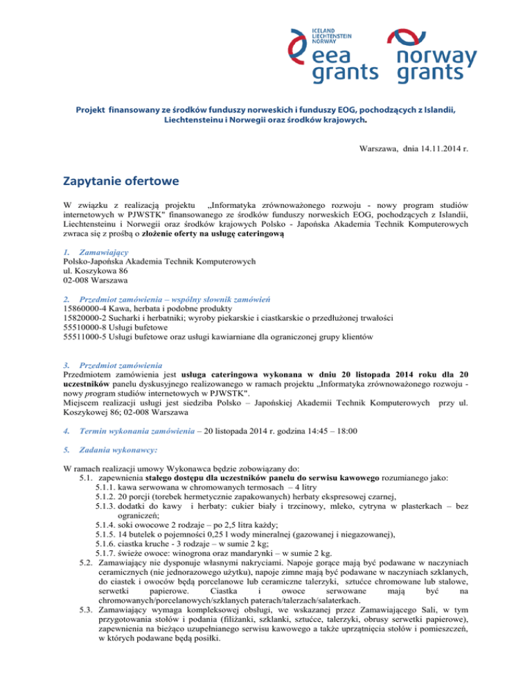 Warszawa, dnia 14.11.2014 r. Zapytanie ofertowe W związku z realizacją projektu „Informatyka zrównoważonego rozwoju - nowy program studiów internetowych w PJWSTK" finansowanego ze środków funduszy norweskich EOG, pochodzących z Islandii, Liechtensteinu i Norwegii oraz środków krajowych Polsko - Japońska Akademia Technik Komputerowych zwraca się z prośbą o złożenie oferty na usługę cateringową 1. Zamawiający Polsko-Japońska Akademia Technik Komputerowych ul. Koszykowa 86 02-008 Warszawa 2. Przedmiot zamówienia – wspólny słownik zamówień 15860000-4 Kawa, herbata i podobne produkty 15820000-2 Sucharki i herbatniki; wyroby piekarskie i ciastkarskie o przedłużonej trwałości 55510000-8 Usługi bufetowe 55511000-5 Usługi bufetowe oraz usługi kawiarniane dla ograniczonej grupy klientów 3. Przedmiot zamówienia Przedmiotem zamówienia jest usługa cateringowa wykonana w dniu 20 listopada 2014 roku dla 20 uczestników panelu dyskusyjnego realizowanego w ramach projektu „Informatyka zrównoważonego rozwoju nowy program studiów internetowych w PJWSTK". Miejscem realizacji usługi jest siedziba Polsko – Japońskiej Akademii Technik Komputerowych przy ul. Koszykowej 86; 02-008 Warszawa 4. Termin wykonania zamówienia – 20 listopada 2014 r. godzina 14:45 – 18:00 5. Zadania wykonawcy: W ramach realizacji umowy Wykonawca będzie zobowiązany do: 5.1. zapewnienia stałego dostępu dla uczestników panelu do serwisu kawowego rozumianego jako: 5.1.1. kawa serwowana w chromowanych termosach – 4 litry 5.1.2. 20 porcji (torebek hermetycznie zapakowanych) herbaty ekspresowej czarnej, 5.1.3. dodatki do kawy i herbaty: cukier biały i trzcinowy, mleko, cytryna w plasterkach – bez ograniczeń; 5.1.4. soki owocowe 2 rodzaje – po 2,5 litra każdy; 5.1.5. 14 butelek o pojemności 0,25 l wody mineralnej (gazowanej i niegazowanej), 5.1.6. ciastka kruche - 3 rodzaje – w sumie 2 kg; 5.1.7. świeże owoce: winogrona oraz mandarynki – w sumie 2 kg. 5.2. Zamawiający nie dysponuje własnymi nakryciami. Napoje gorące mają być podawane w naczyniach ceramicznych (nie jednorazowego użytku), napoje zimne mają być podawane w naczyniach szklanych, do ciastek i owoców będą porcelanowe lub ceramiczne talerzyki, sztućce chromowane lub stalowe, serwetki papierowe. Ciastka i owoce serwowane mają być na chromowanych/porcelanowych/szklanych paterach/talerzach/salaterkach. 5.3. Zamawiający wymaga kompleksowej obsługi, we wskazanej przez Zamawiającego Sali, w tym przygotowania stołów i podania (filiżanki, szklanki, sztućce, talerzyki, obrusy serwetki papierowe), zapewnienia na bieżąco uzupełnianego serwisu kawowego a także uprzątnięcia stołów i pomieszczeń, w których podawane będą posiłki. 5.4. zapewnienia odpowiedniej temperatury kawy i herbaty. 6. 7. 8. Wymagania i warunki stawiane Wykonawcom: 6.1. Posiadają uprawnienia do wykonywania określonej działalności lub czynności, jeżeli ustawy nakładają obowiązek posiadania takich uprawnień; 6.2. Posiadają niezbędną wiedzę i doświadczenie oraz dysponują potencjałem technicznym i osobami zdolnymi do wykonania zamówienia 6.3. Wykonawca nie jest powiązany z Zamawiającym lub osobami upoważnionymi do zaciągania zobowiązań w imieniu Zamawiającego lub osobami wykonującymi w imieniu Zamawiającego czynności związanych z przygotowaniem i przeprowadzeniem procedury zapytania ofertowego osobowo lub kapitałowo w szczególności poprzez: 6.3.1. uczestnictwo w spółce jako wspólnik spółki cywilnej lub spółki osobowej, 6.3.2. posiadanie udziałów lub co najmniej 10% akcji 6.3.3. pełnienie funkcji członka organu nadzorczego lub zarządzającego, prokurenta, pełnomocnika, 6.3.4. pozostawanie w związku małżeńskim, w stosunku pokrewieństwa lub powinowactwa w linii prostej, pokrewieństwa lub powinowactwa w linii bocznej do drugiego stopnia lub w stosunku przysposobienia opieki lub kurateli. 6.3.5. Ocena spełniania warunków udziału w postępowaniu dokonana będzie w oparciu o dokumenty i oświadczenia, które ma dostarczyć Wykonawca. 6.4. Wymagania podstawowe 6.4.1. Wykonawca powinien sporządzić ofertę w języku polskim na formularzu ofertowym załączonym do niniejszego zapytania (załącznik nr 1); 6.4.2. Wykonawca ponosi wszelkie koszty związane z przygotowaniem i złożeniem oferty; 6.4.3. Złożona oferta musi uwzględniać wszystkie zobowiązania, obejmować wszystkie koszty i składniki związane z wykonaniem zamówienia; 6.4.4. Zamawiający nie dopuszcza składania ofert wariantowych; 6.4.5. Zamawiający nie dopuszcza możliwości składania ofert częściowych; 6.4.6. Zamawiający nie dopuszcza możliwości powierzenia przez Wykonawcę całości lub części zamówienia podwykonawcom; 6.4.7. Oferta musi być podpisana przez oferenta lub osobę /osoby uprawnioną do reprezentowania oferenta; 6.4.8. Termin związania ofertą: 30 dni kalendarzowych od terminu składania ofert; 6.4.9. Oferta może być złożona w formie pisemnej lub elektronicznej (skany dokumentów); 6.4.10. Dokumenty wchodzące w skład oferty mogą być dostarczone w formie elektronicznej zeskanowanych, podpisanych dokumentów. Zawartość oferty 7.1. Wypełniony Formularz Oferty, zgodny z Załącznikiem nr 1; 7.2. Oświadczenie o braku powiązań osobowych lub kapitałowych zamawiającego z wykonawcą (załącznik nr 2); 7.3. Oświadczenie o spełnianiu warunków udziału w zapytaniu ofertowym (Załącznik nr 3). Kryteria oceny ofert 8.1. Zamawiający dokona oceny wg kryterium – Cena Cena brutto - maksymalnie C = 100 pkt. C=(Cmin./Cx)*100 C – liczba punktów przyznanych danej ofercie za cenę brutto. Cmin - minimalna cena brutto zaoferowana w odpowiedzi na zapytanie Cx - cena brutto rozpatrywanej oferty 8.2. Maksymalna liczba punktów, możliwych do uzyskania przez ocenianą ofertę wynosi 100. 8.3. Za ofertę najkorzystniejszą zostanie uznana oferta, która otrzyma największą liczbę punktó