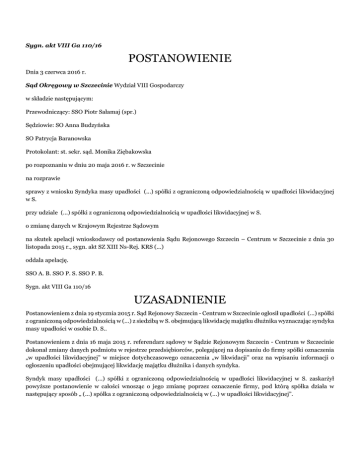 Sygn. akt VIII Ga 110/16 POSTANOWIENIE Dnia 3 czerwca 2016 r. Sąd Okręgowy w Szczecinie Wydział VIII Gospodarczy w składzie następującym: Przewodniczący: SSO Piotr Sałamaj (spr.) Sędziowie: SO Anna Budzyńska SO Patrycja Baranowska Protokolant: st. sekr. sąd. Monika Ziębakowska po rozpoznaniu w dniu 20 maja 2016 r. w Szczecinie na rozprawie sprawy z wniosku Syndyka masy upadłości (...) spółki z ograniczoną odpowiedzialnością w upadłości likwidacyjnej w S. przy udziale (...) spółki z ograniczoną odpowiedzialnością w upadłości likwidacyjnej w S. o zmianę danych w Krajowym Rejestrze Sądowym na skutek apelacji wnioskodawcy od postanowienia Sądu Rejonowego Szczecin – Centrum w Szczecinie z dnia 30 listopada 2015 r., sygn. akt SZ XIII Ns-Rej. KRS (...) oddala apelację. SSO A. B. SSO P. S. SSO P. B. Sygn. akt VIII Ga 110/16 UZASADNIENIE Postanowieniem z dnia 19 stycznia 2015 r. Sąd Rejonowy Szczecin - Centrum w Szczecinie ogłosił upadłości (...) spółki z ograniczoną odpowiedzialnością w (...) z siedzibą w S. obejmującą likwidację majątku dłużnika wyznaczając syndyka masy upadłości w osobie D. S.. Postanowieniem z dnia 16 maja 2015 r. referendarz sądowy w Sądzie Rejonowym Szczecin - Centrum w Szczecinie dokonał zmiany danych podmiotu w rejestrze przedsiębiorców, polegającej na dopisaniu do firmy spółki oznaczenia „w upadłości likwidacyjnej” w miejsce dotychczasowego oznaczenia „w likwidacji” oraz na wpisaniu informacji o ogłoszeniu upadłości obejmującej likwidację majątku dłużnika i danych syndyka. Syndyk masy upadłości (...) spółki z ograniczoną odpowiedzialnością w upadłości likwidacyjnej w S. zaskarżył powyższe postanowienie w całości wnosząc o jego zmianę poprzez oznaczenie firmy, pod którą spółka działa w następujący sposób „ (...) spółka z ograniczoną odpowiedzialnością w (...) w upadłości likwidacyjnej”. Postanowieniem z dnia 30 listopada 2015 r. (sygn. akt SZ XIII Ns-Rej. KRS (...)) Sąd Rejonowy Szczecin - Centrum w Szczecinie utrzymał w mocy postanowienie referendarza sądowego z dnia 16 maja 2015 r. w sprawie SZ XIII Ns-Rej. KRS (...) i dokonany na jego podstawie wpis oraz kosztami postępowania obciążył syndyka masy upadłości spółki. W ocenie Sądu Rejonowego skarga na orzeczenie referendarza sądowego okazała się niezasadna. Stan likwidacji spółki z ograniczoną odpowiedzialnością uregulowany w przepisach ustawy Kodeks spółek handlowych, natomiast likwidację majątku upadłej spółki reguluje ustawa Prawo upadłościowe i naprawcze w brzmieniu obowiązującym w chwili ogłoszenia upadłości. Sąd Rejonowy podkreślił istnienie odmiennych przesłanek do wszczęcia i prowadzenia likwidacji oraz upadłości likwidacyjnej, tj. odpowiednio spełnienie przesłanek przewidzianych w umowie spółki, jak i uchwała wspólników (likwidacja) ogłoszenie postanowienia (upadłość likwidacyjna). W uzasadnieniu zwrócono również uwagę na odmiennie uregulowane kwestie reprezentacji oraz dysponowania majątkiem spółki. Doprowadziło to Sąd Rejonowy do konkluzji, że nie jest możliwe istnienie stanu, w którym spółka z o.o. znajdowałaby się jednocześnie w likwidacji i upadłości. Zdaniem Sądu przeciwko dokonaniu wpisu zgodnie z żądaniem syndyka „w likwidacji w upadłości likwidacyjnej” przemawia funkcja ewidencyjna i informacyjna rejestru, takie oznaczenie nie pozwalałoby bowiem stwierdzić, czy wobec spółki toczy się postępowanie likwidacyjne, czy upadłościowe. Stwarzałoby to stan niepewności dla obrotu gospodarczego spółki. Wnioskodawca Syndyk masy upadłości (...) spółki z ograniczoną odpowiedzialnością w upadłości likwidacyjnej w S. zaskarżył powyższe postanowienie w całości zarzucając mu naruszenie: - art. 601 ustawy Prawo upadłościowe i naprawcze (dalej: p.u.in.) poprzez dokonanie jego błędnej wykładni i uznanie, że nie jest możliwe dodanie do istniejącej nazwy spółki uwzględniającej dodatek „w likwidacji” dodatku „w upadłości likwidacyjnej”, gdyż niemożliwym jest istnienie stanu, w którym spółka z ograniczoną odpowiedzialnością znajdowałaby się jednocześnie w likwidacji i w upadłości likwidacyjnej; - art. 45 ustawy o Krajowym Rejestrze Sądowym poprzez jego błędną wykładnię i przyjęcie, że nie jest możliwe dokonanie z urzędu wpisu w Rejestrze polegającego na dodaniu do istniejącej nazwy spółki, uwzględniającej dodatek wynikający z postawienia spółki w stan likwidacji, oznaczenia „w upadłości likwidacyjnej”. Mając na uwadze powyższe zarzuty skarżący wniósł o zmianę zaskarżonego postanowienia poprzez wpisanie do właściwego rejestru Krajowego Rejestru Sądowego oznaczenia firmy, pod którą działa upadła spółka w następującym brzmieniu: „ (...) spółka z ograniczoną odpowiedzialnością w (...) w upadłości likwidacyjnej w S.” oraz zasądzenie na jego rzecz kosztów postępowania za obie instancje z uwzględnieniem kosztów zastępstwa wg norm przepisanych. W uzasadnieniu apelacji wnioskodawca przypomniał, że firmą spółki z ograniczoną odpowiedzialnością jest nazwa, pod która spółka działa, indywidualizującą spółkę. Do czasu ogłoszenia upadłości nazwa spółki ujawniona w rejestrze brzmiała (...) sp. z o.o. w likwidacji. Dodanie oznaczenia „w upadłości likwidacyjnej” powinno nastąpić do istniejącej na ten dzień firmy. Oznaczenie upadłej „w likwidacji w upadłości likwidacyjnej” daje wyraz woli ustawodawcy informowania uczestników obrotu o sytuacji prawnej upadłego podmiotu. Podał również, że dodanie oznaczeń „w likwidacji” w upadłości likwidacyjnej” następuje w świetle art. 45 ustawy o KRS z urzędu. Wskazał, że w Polsce funkcjonowanie w obrocie nazwy spółki „w likwidacji w upadłości likwidacyjnej” nie budzi wątpliwości. Podniósł również, że w przypadku umorzenia pos