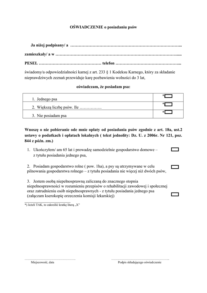 OŚWIADCZENIE o posiadaniu psów Ja niżej podpisany/ a ……………………………………………………………………... zamieszkaly/ a w ……………………………………………………………………………..... PESEL ……………………………………… telefon ………………………………………... świadomy/a odpowiedzialności karnej z art. 233 § 1 Kodeksu Karnego, który za składanie nieprawdziwych zeznań przewiduje karę pozbawienia wolności do 3 lat, oświadczam, że posiadam psa: * 1. Jednego psa * 2. Większą liczbę psów. Ile ……………. * 3. Nie posiadam psa Wnoszę o nie pobieranie ode mnie opłaty od posiadania psów zgodnie z art. 18a, ust.2 ustawy o podatkach i opłatach lokalnych ( tekst jednolity: Dz. U. z 2006r. Nr 121, poz. 844 z późn. zm.) 1. Ukończyłem/ am 65 lat i prowadzę samodzielnie gospodarstwo domowe – z tytułu posiadania jednego psa, 2. Posiadam gospodarstwo rolne ( pow. 1ha), a psy są utrzymywane w celu pilnowania gospodarstwa rolnego – z tytułu posiadania nie więcej niż dwóch psów, 3. Jestem osobą niepełnosprawną zaliczaną do znacznego stopnia niepełnosprawności w rozumieniu przepisów o rehabilitacji zawodowej i społecznej oraz zatrudnieniu osób niepełnosprawnych - z tytułu posiadania jednego psa (załączam kserokopię orzeczenia komisji lekarskiej) ______________________ *) Jeżeli TAK, to zakreślić kratkę literą „X” …………………………………………. Miejscowość, data ……………………………………………….. Podpis składającego oświad czenie