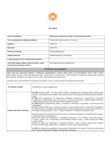 SYLABUS Nazwa przedmiotu: Kolorystyka (podstawowe kolory, łączenia kolorystyczne) Nazwa jednostki prowadzącej przedmiot: Wyższa Szkoła Artystyczna w Warszawie Katedra: Malarstwa Kierunek: Malarstwa Poziom kształcenia: Studia podyplomowe Profil kształcenia: Ogólnoakademicki, doskonalące Liczba punktów ETCS za zaliczenie przedmiotu: 3 Tytuł i/lub stopień naukowy/tytuł zawodowy, imię i nazwisko prowadzącego zajęcia: mgr Agnieszka Mazur Gadzinowska Założenia i cele przedmiotu Celem zajęć jest zapoznanie studenta z wybranymi zagadnieniami z zakresu doboru barw do poszczególnych typów urody, wyboru odpowiedniej stylizacji, zestawienia kolorystycznego i deseni tkanin. Ukształtowanie wśród studentów umiejętności posługiwaniu się paletą barwną tkanin i dodatków, aby podkreślić atuty urody i zakamuflować jej mankamenty. Ukształtowanie wśród studentów zrozumienia zasad doboru wzorów i kolorów tkanin do konkretnych zastosowań. Wymagania wstępne Kwalifikacja na studia podyplomowe Zamierzony efekt kształcenia K_W01 Posiada wiedzę na temat doboru kolorów niezbędnych do zakamuflowania mankamentów sylwetki oraz podstawowych trendów dotyczących kolorów oraz tkanin stosowanych podczas pokazów mody. K_W02 Umie legitymować się znajomością zagadnień teoretycznych i praktycznych związanych z technikami i technologiami wykorzystywanymi w warsztacie twórczym w obrębie projektowania oraz realizacji koncepcji przy wykorzystaniu różnych tendencji w modzie. K_W06 Posiada uporządkowaną wiedzę o trendach w kolorystyce i sposobach ich wykorzystywania w projektach. K_W07 Posiada praktyczną i teoretyczną wiedzę na temat doboru kolorów i materiałów niezbędnych do wykorzystania w projektach artystycznych przy wykonaniu konkretnej stylizacji, która pozawala na swobodną realizację projektów i prac w zakresie malarstwa w technikach scenograficznych. K_U3 Jest zdolny do rozumienia wzajemnych relacji zachodzących pomiędzy formą dzieła plastycznego, a niesionym przez nie komunikatem. K_U5 Jest zdolny do świadomego i swobodnego poruszania się w obszarze zestawienia kolorów i wzorów odzieży wraz z praktycznym wykorzystaniem nabytej wiedzy z zakresu bieżących trendów w pracy stylisty. K_U6 Jest zdolny do świadomego i umiejętnego doboru, a także sposobu wykorzystania narzędzi warsztatu artystycznego adekwatnie do charakteru i założeń realizowanego projektu. K_K02 Jest zdolny do gromadzenia i przetwarzania informacji, które mogą być twórczo wykorzystane przy realizacji różnorodnych projektów związanych ze stylizacją. K_K03 Jest zdolny do rozumienia potrzeby uczenia się przez całe życie i świadomego wykorzystywania nabytej wiedzy i umiejętności. Liczba godzin dydaktycznych i formy zajęć i punkty ECTS: Liczba godzin dydaktycznych i kontaktowych (w tym): Przedmiot I semestr Forma zajęć: (W - wykład, Ć - ćwiczenia, K konwersatorium) Kolorystyka (podstawowe kolory, łączenia kolorystyczne) Razem W 8 8 Ć K Godziny kontaktowe 8 Samodzielna praca słuchacza Rygor ECTS 82h Zaliczenie na ocenę 3 W, Ć R – Rygor (egzamin, - E, zaliczenie z oceną –Zo, zaliczenie - Z) Treści programowe nauczania [ treść zajęć] 1. Kolor i jego znaczenie w historii mody 2. Wiosna, lato jesień, zima – typy kolorystyczne przyporządkowane czterem porom roku. 3. Indywidualna analiza kolorystyczna – ćwiczenie. 4. Typy kolorystyczne pośrednie. 5. Analiza kolorystyczna mężczyzn. 6. Dobór indywidualnej palety kolorystycznej do typu urody i do sylwetki. Ćwiczenia. Zagadnienia programowe nauczania: Narzędzie/ metody dydaktyczne: Wykład prowadzony jest przy użyciu technik audiowizualnych. Wykładowca przygotowuje studentów do wykonania prac koncepcyjnych, następnie ocenia i omawia prace. Ćwiczenia na podstawie wcześniej omówionego zadania. Forma i sposób zaliczenia oraz wymagania egzaminacyjne: Zaliczenie na podstawie zadanego ćwiczenia - Przygotowanie analizy kolorystycznej i dobór ubiorów do typu urody i sylwetki wybranej osoby. Metody i kryteria oceny: Przygotowanie analizy kolorystycznej i dobór ubiorów do typu urody i sylwetki wybranej osoby. Wymagania końcowe: W skład oceny zaliczeniowej wchodzą: - zaliczenie wszystkich ćwiczeń na zajęciach Formy weryfikacji osiągnięcia efektów kształcenia [ elementy składowe oceny w %] Zaliczenie prac – 80% Frekwencja – 20% Język wykładowy polski Literatura Literatura podstawowa: Schneider Lisa, Wykreuj swój image, Oficyna Wydawnicza Kalliope, 1996. Watermann Gisela, Zingel Franziska, Znajdź swój kolor, Muza SA, 1995 Więcka Aleksandra, Jak być gwiazdą. Moda, uroda i styl. Praktyczne porady stylistów, Wydawnictwo Publicat Literatura uzupełniająca: trendbooki L’Officiel 1,000 Models na bieżący sezon Ffloulkes Fiona, Jak czytać modę. Szybki kurs interpretacji stylów, Wydawnictwo Arkady, 2010 Fogg Marine, Style w modzie. Od Chanel do Versace, Buchmann, 2011 Jonas Sylvia, Leksykon Moda. Marki. Projektanci. Ubrania, Wydawnictwo Olesiejuk, 2009 Podpis prowadzącego przedmiot: Podpis prorektora do spraw dydaktycznych: Oświadczenie i podpis prowadzącego zajęcia Oświadczam, że treści programowe zawarte w niniejszym sylabusie są rezultatem mojej indywidualnej pracy twórczej wykonywanej w ramach stosunku pracy/współpracy wynikającej z umowy cywilnoprawnej oraz że osobom trzecim nie przysługują z tego tytułu autorskie prawa majątkowe. Dnia: ………………………………………….. ……………………………………..