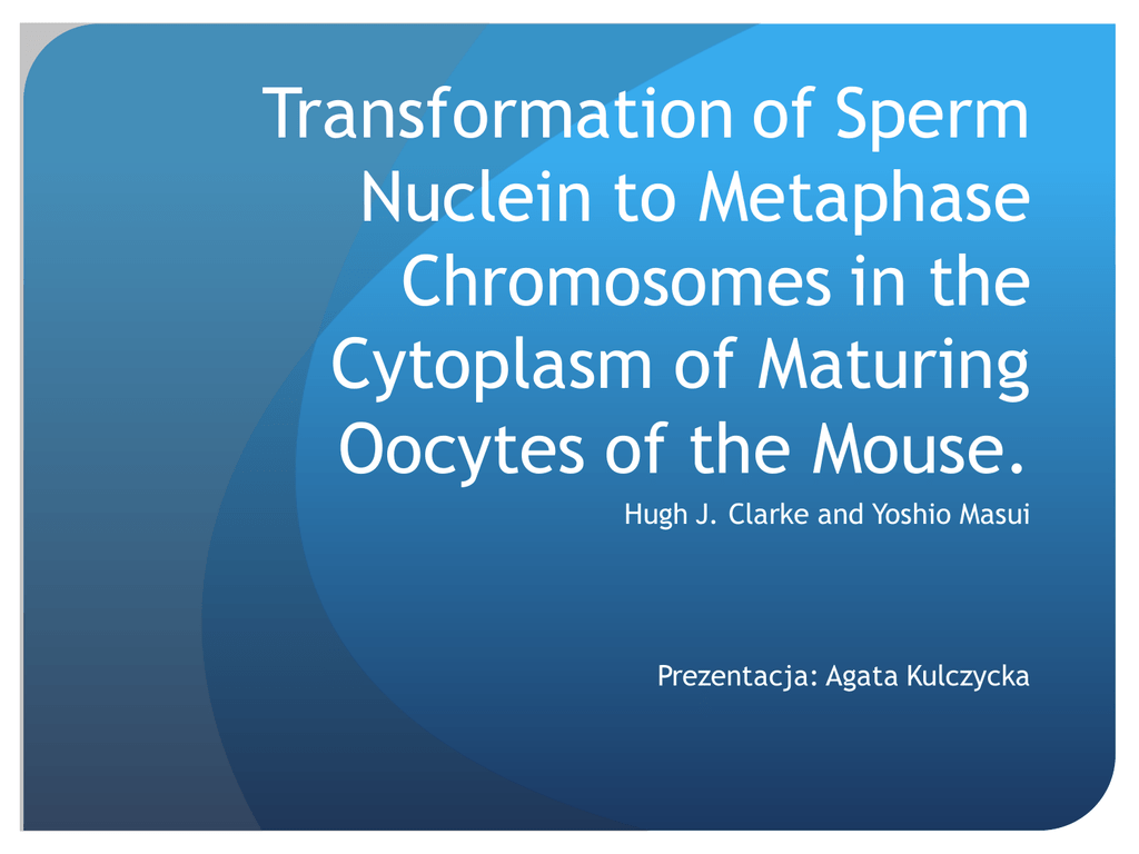 Transformation of Sperm Nuclein to Metaphase Chromosomes in the Cytoplasm of Maturing Oocytes of the Mouse. Hugh J. Clarke and Yoshio Masui Prezentacja: Agata Kulczycka Wstęp rozpoczęcie dojrzewania mejotycznego w oocytach kręgowców zapoczątkowne jest rozpadem błony jądrowej w pęcherzykach zarodkowych (GVBD) i kondensacją chromatyny do stadium metafazy. Oocyty przechodzą pierwszy podział mejozy, a następnie zostają zablokowane w metafazie II - aż do zapłodnienia. Mechanizm odpowiedzialny za utrzymanie chromosomów w stadium skondensowanym u dojrzewających oocytów został zbadany przez wprowadzenie do cytoplazmy oocytu jądra interfazowego z komórki somatycznej. Wyniki pokazały, że u wielu gatunków wzrost oocytów indukowany jest przez aktywność cytoplazmatyczną, która powoduje transformację jądra interfazowego do chromosomów metafazowych. Przeprowadzono inseminację lub iniekcję dojrzewających oocytów – jądra plemników nie uformowały chromosomów metafazowych. Zamiast tego powiększyły się lub utworzyły przedjądrze. Brak aktywnści cytoplazmatycznej u dojrzewających oocytów która powodowałaby transformację jądra plemnika do metafazowych chromosomów. Cel doświadczenia: Pogodzenie rozbierzności pomiędzy wynikami otrzymanymi w przypadku wprowadzenia do cytoplazmy oocytu jądra plemnika lub interfazowego jądra somatycznego. Zbadanie zmian morfologii jąder plemników i chromatyny matczynej po zapłodnieniu oocytów. Materiały i metody: Oocyty: dojrzałe płciowo myszy (CD-1) PMSG - gonadotropina z surowicy ciężarnych klaczy Sekcja 44-48 h później Izolacja jajników – przeniesienie do zmodyfikowanej pożywki L-15 z dodatkiem 50μg/ml dbcAMP (zapobiega spontanicznemu rozpadowi pęcherzyka zarodkowego podczas selekcji oocytów) Nakłuwanie pęcherzyków jajnikowych i izolacja oocytów Przeniesienie do pożywki Brinstera – inkubacja 37C, 5%CO2 2h – prometafaza I 8-9h – metafaza I 18 – 21h – metafaza II Usunięcie osłonek przejrzystych: 0,05% α-chemotrypsyna w pozywce DME – 37C, 1 min Przeniesienie z pomocą mikropipety do pożywki L-15, płukanie. Selekcja - oocyty całkowicie pozbawione otoczniki i komórek pęcherzykowych. Przeniesienie do falkonu z pożywką F – możliwe zapłodnienie Zawiesina plemników Dojrzałe płciowo myszy CD-1 Sekcja i wypreaprowanie nasieniowód – w pożywce F, usunięcie tkanki tłuszczowej Wyciśnięcie plemników z nasieniowodów – zawiesina w 0,5ml pożywki F Inkubacja przez 15 minut w 37C 75μl zawiesiny rozcieńczono w 0,5ml pozywki F, inkubacja 45 minut. Inseminacja oocytów: Odmierzona objętość rozcieńczonej zawiesiny plemników został dodany do 3037 godetek zawierających oocyty zawieszone w 0,5 ml pożywki F. Różne godetki otrzymał różne objętości zawiesiny plemników - w celu otrzymania różnych polispermii w każdym doświadczeniu. Każda godetka 20-50 oocytów i 0,5-50 ul rozcieńczonej zawiesiny plemników. Mieszanię komórek jajowych i plemników inkubowano 45 min. Oocyty przeniesiono do zmodyfikowanej pożywki Whitten (zmniejszenie stężenia NaCl z 88 mM do 71 mM) na 3-30h. Utrwalanie i barwienie: Oocyty zostały utrwalone przez kilka minut w roztworze utrwalacza - etanol, woda i kwas octowy (8:3:3) W celu szczegółowego badania chromosomów - metoda Tarkowskiego. Oocyty na kilka minut umieszczono w 1% roztworze cytrynianu sodu, a następnie w małych grupach przeniesiono w kroplach utrwalacza na szkiełka i wysuszono. Utrwalone oocyty wybarwiono barwnikiem Giemsy . WYNIKI 1. Inseminacja w pełni dojrzałych oocytów – GVBD i wyrzut I ciałka kierunkowego. 12 h po inseminacji: 74% (114/155) – wyrzucenie II ciałka kierunkowego, wykształcenie przedjądrza żeńskiego i jednego lub więcej przedjądrzy męskich. 26% (36/155) – nie wykształciło przedjądrza męskiego ale u niektórych wyrzut II ciałka kierunkowego i przedjądrze żeńskie. Możliwa jest aktywacja i powstanie przedjądrzy męskich i żeńskich u oocytów które przeszły dojrzewanie mejotyczne. 2. Inseminacja dojrzewających oocytów (prometafaza I lub metafaza I) Monospermia Próba kontrolna - oocyty które nie zostały zapłodnione podczas inseminacji Prometafaza I 9h po inkubacji: 19% (5/27) oocytów, które zostały zapłodnione osiągnęło stadium metafazy II 44% (18/41) – oocytów niezapłodnionych osiągnęło stadium metafazy II 12 h po inkubacji 82% (31/38) oocytów, które zostały zapłodnione osiągnęło stadium metafazy II 89% (32/36) – oocytów niezapłodnionych osiągnęło stadium metafazy II Zapłodnienie oocytu w stadium prometafazy I może spowodować opóżnienie dokończenia mejozy ale nie wpływa na zdolność oocytu na dokończenie dojrzewania i blok w metafazie II. Metafaza I 9h po inkubacji >90% oocytów zapłodnionych i niezapłodnionych osiągnęło stadium metafazy II Zapłodnienie oocytów w metafazie I nie opóźnia dokończenie mejozy. Morfologia matczynych chromosomów w oocytach inseminowanych w prometafazie I. 18h inkubacji. Wpływ polispermii na mejozę oocytów i morfologię matczynych chromosomów. oocyty w prometafazie I, inkubacja 18 h Dekondensacja lub pyknoza chromosomów matczynych może być wywołane przez mniej plemników, jeśli komórki jajowe zostały zapłodnione w metafazie I niż w przypadku zapładniana w prometaphase I. Wysoki stopień polispermii hamuje zdolność oocytów do utrzymania chromosomów matczynych w stadium metafazy II. Zmiany morfologii jądra plemnika w kontakcie z cytoplazmą oocytu. MONOSPERMIA Utrwalanie oocytów w 3h odstępach czasowych po inseminacji. Zależność zmiany morfologii chromatyny plemnika w dojrzewających oocytach od czasu inkubacji. A - oocyty inseminowane w prometafazie I B - oocyty inseminowane w metafazie I po 18 h inkubacji – ponad 90% chrmosomów ojcowskich w stadium metafazy II. tworzenie chromosomów metafazowych zachodzi nieco szybciej gdy inseminowano oocyty w metafazie I. oocyty i
