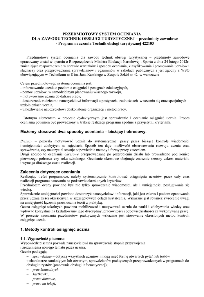 PRZEDMIOTOWY SYSTEM OCENIANIA DLA ZAWODU TECHNIK OBSŁUGI TURYSTYCZNEJ – przedmioty zawodowe - Program nauczania Technik obsługi turystycznej 422103 Przedmiotowy system oceniania dla zawodu technik obsługi turystycznej – przedmioty zawodowe opracowany został w oparciu o Rozporządzenie Ministra Edukacji Narodowej i Sportu z dnia 24 lutego 2012r. zmieniające rozporządzenie w sprawie warunków i sposobu oceniania, klasyfikowania i promowania uczniów i słuchaczy oraz przeprowadzania sprawdzianów i egzaminów w szkołach publicznych i jest zgodny z WSO obowiązującym w Technikum nr 8 im. Jana Karskiego w Zespole Szkół nr 42 w warszawie Celem przedmiotowego systemu oceniania jest: - informowanie ucznia o poziomie osiągnięć i postępach edukacyjnych, - pomoc uczniowi w samodzielnym planowaniu własnego rozwoju, - motywowanie ucznia do dalszej pracy, - dostarczanie rodzicom i nauczycielowi informacji o postępach, trudnościach w uczeniu się oraz specjalnych uzdolnieniach ucznia, - umożliwienie nauczycielowi doskonalenie organizacji i metod pracy. Istotnym elementem w procesie dydaktycznym jest sprawdzanie i ocenianie osiągnięć ucznia. Proces oceniania powinien być prowadzony w trakcie realizacji programu zgodnie z przyjętymi kryteriami. Możemy stosować dwa sposoby oceniania – bieżący i okresowy. Bieżący – pozwala motywować ucznia do systematycznej pracy przez bieżącą kontrolę wiadomości i umiejętności zdobytych na zajęciach. Sposób ten daje możliwość obserwowania rozwoju ucznia oraz sprawdzenia, czy nauczyciel stosuje odpowiednie metody i formy pracy z uczniem. Drugi sposób to ocenianie okresowe przeprowadzane po przerobieniu działu lub prowadzone pod koniec pierwszego półrocza czy roku szkolnego. Ocenianie okresowe obejmuje znacznie szerszy zakres materiału i wymaga dłuższego czasu realizacji. Zalecenia dotyczące oceniania Realizując treści programowe, należy systematycznie kontrolować osiągnięcia uczniów przez cały czas realizacji programu nauczania na podstawie określonych kryteriów. Przedmiotem oceny powinno być nie tylko sprawdzenie wiadomości, ale i umiejętności posługiwania się wiedzą. Sprawdzenie umiejętności powinno dostarczyć nauczycielowi informacji, jaki jest zakres i poziom opanowania przez ucznia treści określonych w szczegółowych celach kształcenia. Wskazane jest również zwrócenie uwagi na umiejętność łączenia przez ucznia teorii z praktyką. Ocena osiągnięć szkolnych powinna mobilizować i motywować ucznia do nauki i zdobywania wiedzy oraz wpływać korzystnie na kształtowanie jego dyscypliny, pracowitości i odpowiedzialności za wykonywaną pracę. W procesie nauczania przedmiotów praktycznych wskazane jest stosowanie określonych metod kontroli osiągnięć ucznia. 1. Metody kontroli osiągnięć ucznia 1.1. Wypowiedź pisemna Wypowiedź pisemna pozwala nauczycielowi na sprawdzenie stopnia przyswojenia i zrozumienia nowego tematu przez ucznia. Ocenie podlegają: sprawdziany – dotyczą wszystkich uczniów i mogą mieć formę otwartych pytań lub testów o charakterze zamkniętym lub otwartym, sprawdzianów praktycznych przeprowadzanych w programach do obsługi turystów (pracownia obsługi informatycznej); prac kontrolnych kartkówki, prace domowe, prace na lekcji, praca w grupach, referaty, prezentacje i projekty. Oceniając prace domowe, sprawozdania czy referaty, należy zwrócić uwagę na sposób poszukiwania wiedzy przez ucznia i selekcję informacji, jakiej dokonuje, oraz stopień jego samodzielności w tworzeniu tych prac. Każde wykonane przez ucznia zadanie powinno być ocenione. Kontrolę poprawności wykonania zadań należy przeprowadzać w trakcie i po jego wykonaniu. Ocena osiągnięć ucznia po zakończeniu realizacji programu zajęć praktycznych powinna uwzględniać wyniki wszystkich zastosowanych przez nauczyciela sposobów sprawdzania osiągnięć ucznia. W ocenie końcowej osiągnięć uczniów należy uwzględnić wyniki sprawdzianów ustnych i pisemnych, poziom wykonania ćwiczeń oraz projektów, a także zaangażowanie i aktywność na zajęciach. Sprawdzanie osiągnięć ucznia powinno być dokładne i systematyczne, ponieważ tylko w taki sposób możemy informować ucznia o poziomie jego osiągnięć i motywować go do pracy. 1.2. Wypowiedź ustna Ocenie podlegają: odpowiedzi ustne – należy pamiętać o tym, aby pytania dawały uczniowi możliwość zrozumienia pojęć i faktów, a nie tylko odtworzenia wiadomości, pytania powinny być krótkie i na temat, sformułowane jasno i precyzyjnie, odpowiedź natomiast niezbyt długa i konkretna, oparta na fachowej terminologii, aktywność na zajęciach, czyli uczestnictwo w lekcji (dyskusja, rozwiązywanie problemów, udzielanie poprawnych odpowiedzi na zadane pytania). 1.3. Obserwacja pracy ucznia na lekcji podczas wykonywania zadań, ćwiczeń i projektów oraz prezentacji wyników Obserwacja dostarcza nauczycielowi informacji o ogólnych predyspozycjach ucznia, jego umiejętnościach, koncentracji, organizacji, współpracy i aktywności na lekcjach. Podczas sprawdzania i oceniania wykonanych zadań, ćwiczeń i projektów należy zwrócić uwagę na: sprawność wykonania wskazanych i zadanych przez nauczyciela prac, zaangażowanie w pracę, współpracę w grupie, trafność koncepcji projektu, dobór materiałów źródłowych, podział zadań oraz stopień zaangażowania uczestników w realizację ćwiczeń, projektu, stopień realizacji zamierzonych celów, wykonanie pracy, prezentację uzyskanych wyników zadania, ćwiczenia czy projektu. Praca nad ćwiczeniem czy projektem powinna być oceniana na trzech płaszczyznach: planowania, realizacji, prezentowania. 2. Osiągnięcia podlegające sprawdzaniu i ocenianiu Przedmiotem oceny są: wiadomości i umiejętności zdobyte przez ucznia w wyniku procesu kształcenia. Oceniając osiągnięcia uczniów, szczególną uwagę należy zwrócić na: wie