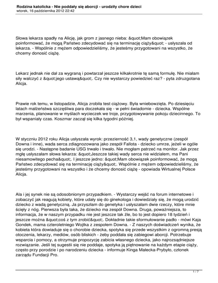 Rodzina katolicka - Nie poddały się aborcji - urodziły chore dzieci wtorek, 16 października 2012 22:42 Słowa lekarza spadły na Alicję, jak grom z jasnego nieba: "Mam obowiązek poinformować, że mogą Państwo zdecydować się na terminację ciąży" - usłyszała od lekarza. - Wspólnie z mężem odpowiedzieliśmy, że jesteśmy przygotowani na wszystko, że chcemy donosić ciążę. Lekarz jednak nie dał za wygraną i powtarzał jeszcze kilkakrotnie tę samą formułę. Nie miałam siły walczyć z "jego ustawą". Czy nie wystarczy powiedzieć raz? - pyta zdruzgotana Alicja. Prawie rok temu, w listopadzie, Alicja zrobiła test ciążowy. Była wniebowzięta. Po dziesięciu latach małżeństwa szczęśliwa para doczekała się - w pełni świadomie - dziecka. Wspólne marzenia, planowanie w myślach wycieczek we troje, przygotowywanie pokoju dziecinnego. To był wspaniały czas. Koszmar zaczął się kilka tygodni później. W styczniu 2012 roku Alicja usłyszała wyrok: przezierność 3,1, wady genetyczne (zespół Downa i inne), wada serca zdiagnozowana jako zespół Fallota - dziecko umrze, jeżeli w ogóle się urodzi. - Następne badanie USG trwało i trwało. Nie mogłam patrzeć na monitor. Jak przez mgłę usłyszałam słowa lekarza: "Jeszcze takiej wady serca nie widziałem, ma Pani niesamowitego pecha". I jeszcze jedno: "Mam obowiązek poinformować, że mogą Państwo zdecydować się na terminację ciąży". Wspólnie z mężem odpowiedzieliśmy, że jesteśmy przygotowani na wszystko i że chcemy donosić ciążę - opowiada Wirtualnej Polsce Alicja. Ala i jej synek nie są odosobnionym przypadkiem. - Wystarczy wejść na forum internetowe i zobaczyć jak reagują kobiety, które udały się do ginekologa i dowiedziały się, że mogą urodzić dziecko z wadą genetyczną. Ja przyszłam do genetyka i usłyszałam dwie rzeczy, które mnie ścięły z nóg. Pierwsza była taka, że dziecko ma zespół Downa. Druga, poważniejsza, to informacja, że w naszym przypadku nie jest jeszcze tak źle, bo to jest dopiero 18 tydzień i jeszcze można "coś z tym zrobić". Dokładnie takie sformułowanie padło - mówi Kaja Gondek, mama czteroletniego Wojtka z zespołem Downa. - Z naszych doświadczeń wynika, że kobieta która dowiaduje się o chorobie dziecka, spotyka się przede wszystkim z ogromną presją otoczenia, lekarzy, mediów, osób bliskich - żeby poddała się zabiegowi aborcji. Potrzebuje wsparcia i pomocy, a otrzymuje propozycję zabicia własnego dziecka, jako najrozsądniejsze rozwiązanie. Jeśli tej sugestii się nie poddaje, spotyka ją piętnowanie na każdym etapie ciąży, często przy porodzie i po narodzeniu dziecka - informuje Kinga Małecka-Prybyło, członek zarządu Fundacji Pro. 1/7 Rodzina katolicka - Nie poddały się aborcji - urodziły chore dzieci wtorek, 16 października 2012 22:42 Federacja na rzecz Kobiet i Planowania Rodziny twierdzi, że w Polsce rocznie wykonuje się ponad 100 tys. aborcji, organizacje pro-life, że 7-13 tys. Zdecydowana większość aborcji w Polsce jest przeprowadzanych z powodu ciężkiego uszkodzenia płodu. Według danych rządowych, w 2010 wykonano w Polsce 641 aborcji, z tego 614 to przerwania ciąży spowodowane prawdopodobieństwem ciężkiego i nieodwracalnego upośledzenia płodu albo nieuleczalnej choroby zagrażającej jego życiu. W 2009 r. było ich 510, w 2008 r. - 467, a np. w 2002 - 82. W ubiegłym tygodniu sejm skierował do dalszych prac w komisji projekt ustawy autorstwa Solidarnej Polski, zaostrzający przepisy dotyczące aborcji i wprowadzający zakaz przerywania ciąży w przypadkach, gdy występuje duże prawdopodobieństwo ciężkiego i nieodwracalnego upośledzenia płodu albo nieuleczalnej choroby zagrażającej jego życiu. Autorzy nazywają to zakazem "aborcji eugenicznej". Za dalszymi pracami nad projektem głosowało m.in. 40 posłów PO i 19 PSL. Projekt SP poparli też wszyscy posłowie PiS i SP. - Projekt Solidarnej Polski jest przejawem fundamentalizmu religijnego lub (co bardziej prawdopodobne) politycznego cynizmu, polegającego na zdobywaniu popularności przez licytowanie się w radykalizmie z i tak skrajną prawicą pisowską. Dla podlizania się biskupom i Rydzykowi oraz przekroczenia magicznego progu 5 proc., ci posłowie gotowi są jak widać na wszystko. Męki noworodków i płacz ich matek mają za nic - pewnie nawet o tym nie pomyśleli. W przypadku, gdy dziecko obciążone jest wadami letalnymi (śmiertelnymi) i czeka je wielodniowe a nawet wielomiesięczne umieranie w męczarniach, aborcja może być najlepszą decyzją. Zakazywanie jej w takich przypadkach byłoby okrucieństwem i głupotą - stwierdza znany krakowski filozof i bioetyk prof. Jan Hartman. *** Alicja się załamała,zaczęła się nad sobą użalać: - Jestem zła do szpiku kości, jestem ułomna, naznaczona. Mąż przez mnie spieprzy sobie życie. On zasługuje na inną - lepszą żonę, która da mu kochaną rodzinę, dom, dzieci, psa, szczęście... - myślała w tamtym okresie. I wspomina czasy, gdy wszystko było dobrze. - Kiedyś chodziłam do kościoła, modliłam się, byłam wdzięczna Bogu, za każdą rzecz, którą mi ofiarował. Wierzyłam w niego. 30 grudnia 2011 roku On dla mnie zniknął - twierdzi Ala. 2/7 Rodzina katolicka - Nie poddały się aborcji - urodziły chore dzieci wtorek, 16 października 2012 22:42 Przyszedł czas, że Alicja niektórym powiedziała o wadzie serca dziecka, które nosi pod sercem, nie wspomniała jednak o zespole Downa. Próby pocieszenia jej sprawiły, że zaczęła się czuć jeszcze gorzej. Zewsząd słyszała bowiem: "Dzisiaj medycyna jest tak posunięta do przodu, że na pewno wszystko się ułoży. Gorzej, gdyby dziecko miało np. zespół Downa". Alicji wydawało mi się, że skoro zdecydowała się urodzić chore dziecko, nie oddawać go, nie zostawiać, to lekarze zadbają o jego operacje. Nic bardziej mylnego. Okazało się bowiem, że dzieci z zes