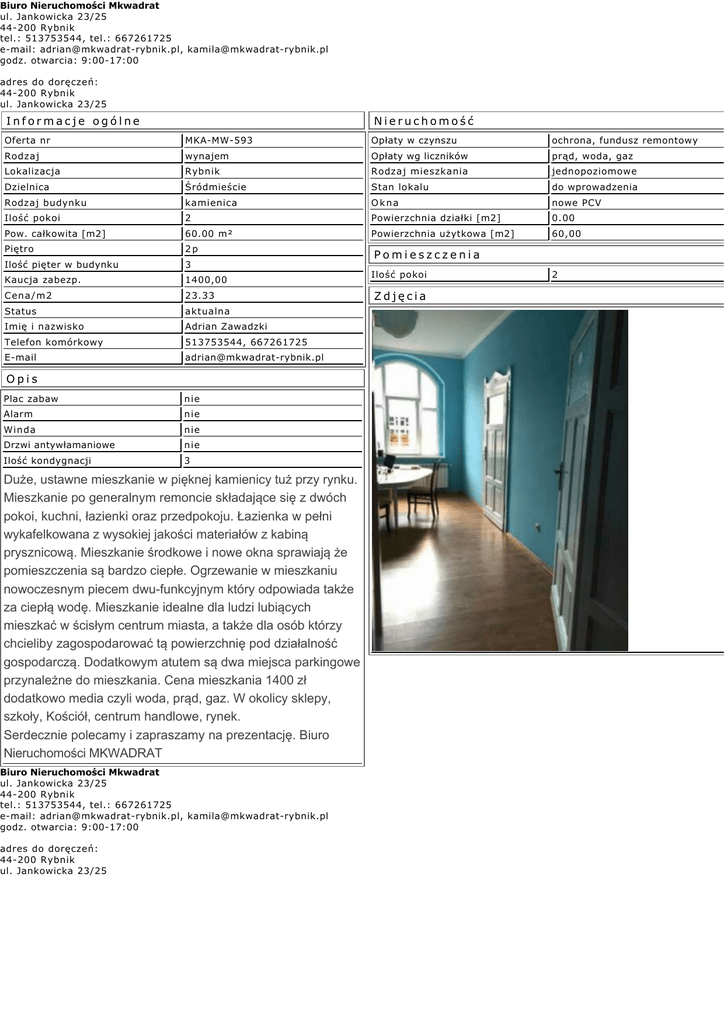 Biuro Nieruchomości Mkwadrat ul. Jankowicka 23/25 44-200 Rybnik tel.: 513753544, tel.: 667261725 e-mail: [email protected], [email protected] godz. otwarcia: 9:00-17:00 adres do doręczeń: 44-200 Rybnik ul. Jankowicka 23/25 Informacje ogólne Nieruchomość Oferta nr MKA-MW-593 Opłaty w czynszu ochrona, fundusz remontowy Rodzaj wynajem Opłaty wg liczników prąd, woda, gaz Lokalizacja Rybnik Rodzaj mieszkania jednopoziomowe Dzielnica Śródmieście Stan lokalu do wprowadzenia Rodzaj budynku kamienica Okna nowe PCV Ilość pokoi 2 Powierzchnia działki [m2] 0.00 Pow. całkowita [m2] 60.00 m² Powierzchnia użytkowa [m2] 60,00 Piętro 2p Ilość pięter w budynku 3 Kaucja zabezp. 1400,00 Cena/m2 23.33 Status aktualna Imię i nazwisko Adrian Zawadzki Telefon komórkowy 513753544, 667261725 E-mail [email protected] Opis Plac zabaw nie Alarm nie Winda nie Drzwi antywłamaniowe nie Ilość kondygnacji 3 Duże, ustawne mieszkanie w pięknej kamienicy tuż przy rynku. Mieszkanie po generalnym remoncie składające się z dwóch pokoi, kuchni, łazienki oraz przedpokoju. Łazienka w pełni wykafelkowana z wysokiej jakości materiałów z kabiną prysznicową. Mieszkanie środkowe i nowe okna sprawiają że pomieszczenia są bardzo ciepłe. Ogrzewanie w mieszkaniu nowoczesnym piecem dwu-funkcyjnym który odpowiada także za ciepłą wodę. Mieszkanie idealne dla ludzi lubiących mieszkać w ścisłym centrum miasta, a także dla osób którzy chcieliby zagospodarować tą powierzchnię pod działalność gospodarczą. Dodatkowym atutem są dwa miejsca parkingowe przynależne do mieszkania. Cena mieszkania 1400 zł dodatkowo media czyli woda, prąd, gaz. W okolicy sklepy, szkoły, Kościół, centrum handlowe, rynek. Serdecznie polecamy i zapraszamy na prezentację. Biuro Nieruchomości MKWADRAT Biuro Nieruchomości Mkwadrat ul. Jankowicka 23/25 44-200 Rybnik tel.: 513753544, tel.: 667261725 e-mail: [email protected], [email protected] godz. otwarcia: 9:00-17:00 adres do doręczeń: 44-200 Rybnik ul. Jankowicka 23/25 Pomieszczenia Ilość pokoi Zdjęcia 2