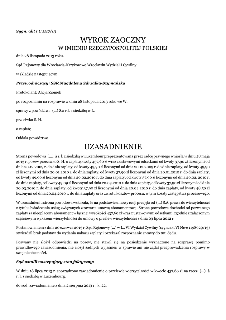 Sygn. akt I C 1117/13 WYROK ZAOCZNY W IMIENIU RZECZYPOSPOLITEJ POLSKIEJ dnia 28 listopada 2013 roku. Sąd Rejonowy dla Wrocławia-Krzyków we Wrocławiu Wydział I Cywilny w składzie następującym: Przewodniczący: SSR Magdalena Zdrzałka-Szymańska Protokolant: Alicja Ziomek po rozpoznaniu na rozprawie w dniu 28 listopada 2013 roku we W. sprawy z powództwa (...) S.a r.l. z siedzibą w L. przeciwko S. H. o zapłatę Oddala powództwo. UZASADNIENIE Strona powodowa (...). à r. l. z siedzibą w Luxembourg reprezentowana przez radcę prawnego wniosła w dniu 28 maja 2013 r. pozew przeciwko S. H. o zapłatę kwoty 437,60 zł wraz z ustawowymi odsetkami od kwoty 37,90 zł liczonymi od dnia 20.12.2009 r. do dnia zapłaty, od kwoty 49,90 zł liczonymi od dnia 20.12.2009 r. do dnia zapłaty, od kwoty 49,90 zł liczonymi od dnia 20.01.2010 r. do dnia zapłaty, od kwoty 37,90 zł liczonymi od dnia 20.01.2010 r. do dnia zapłaty, od kwoty 49,90 zł liczonymi od dnia 20.02.2010 r. do dnia zapłaty, od kwoty 37,90 zł liczonymi od dnia 20.02. 2010 r. do dnia zapłaty, od kwoty 49.09 zł liczonymi od dnia 20.03.2010 r. do dnia zapłaty, od kwoty 37,90 zł liczonymi od dnia 20.03.2010 r. do dnia zapłaty, od kwoty 37,90 zł liczonymi od dnia 20.04.2010 r. do dnia zapłaty, od kwoty 48,50 zł liczonymi od dnia 20.04.2010 r. do dnia zapłaty oraz zwrotu kosztów procesu, w tym koszty zastępstwa procesowego. W uzasadnieniu strona powodowa wskazała, że na podstawie umowy cesji przejęła od (...) S.A. prawa do wierzytelności z tytułu świadczenia usług związanych z zawartą umową abonamentową. Strona powodowa dochodzi od pozwanego zapłaty za nieopłacony abonament w łącznej wysokości 437,60 zł wraz z ustawowymi odsetkami, zgodnie z załączonym częściowym wykazem wierzytelności do umowy o przelew wierzytelności z dnia 03 lipca 2012 r. Postanowieniem z dnia 20 czerwca 2013 r. Sąd Rejonowy (...) w L., VI Wydział Cywilny (sygn. akt VI Nc-e 1198929/13) stwierdził brak podstaw do wydania nakazu zapłaty i przekazał rozpoznanie sprawy do tut. Sądu. Pozwany nie złożył odpowiedzi na pozew, nie stawił się na posiedzenie wyznaczone na rozprawę pomimo prawidłowego zawiadomienia, nie złożył żadnych wyjaśnień w sprawie ani nie żądał przeprowadzenia rozprawy w swej nieobecności. Sąd ustalił następujący stan faktyczny: W dniu 18 lipca 2013 r. sporządzono zawiadomienie o przelewie wierzytelności w kwocie 437,60 zł na rzecz (...). à r. l. z siedzibą w Luxembourg. dowód: zawiadomienie z dnia 2 sierpnia 2013 r., k. 22. Sąd zważył co następuje: Powództwo jako bezzasadne podlegało oddaleniu w całości. Zgodnie z treścią przepisu art. art. 339 § 1 i § 2 k.p.c. jeżeli pozwany nie stawił się na posiedzenie wyznaczone na rozprawę albo mimo stawienia się nie bierze udziału w rozprawie, sąd wyda wyrok zaoczny. W tym wypadku przyjmuje się za prawdziwe twierdzenie powoda o okolicznościach faktycznych przytoczonych w pozwie lub w pismach procesowych doręczonych pozwanemu przed rozprawą, chyba że budzą one uzasadnione wątpliwości albo zostały przytoczone w celu obejścia prawa. Z uwagi na fakt, iż pozwany S. H. nie złożył odpowiedzi na pozew, nie stawił się na posiedzenie wyznaczone na rozprawę pomimo prawidłowego zawiadomienia, nie złożył żadnych wyjaśnień w sprawie ani nie żądał przeprowadzenia rozprawy w swej nieobecności, Sąd na rozprawie w dniu 28 listopada 2013 r. wydał wyrok zaoczny. Powództwo nie zasługiwało na uwzględnienie ze względu na to, iż w ocenie Sądu roszczenie strony powodowej nie zostało udowodnione. Sąd uznał, że strona powodowa nie udowodniła nie tylko wysokości zobowiązania pozwanego względem strony powodowej, ale również jego istnienia w ogóle. Jak stanowi przepis art. 6 k.c. ciężar udowodnienia faktu spoczywa na osobie, która z faktu tego wywodzi skutki prawne. Założeniem rozwiązania legislacyjnego przyjętego w art. 6 k.c. jest obowiązywanie zasady kontradyktoryjności (sporności). Idea sporu zadecydowała o regule rozkładu ciężaru dowodu. Przepis art. 6 k.c. jest w istocie normą decyzyjną w tym znaczeniu, że przesądza on w określonych sytuacjach o sposobie wyrokowania sądu w postaci oddalenia powództwa. Ciężar dowodu pozostaje w ścisłym związku z problematyką procesową dowodów. Instytucja ta spełnia dwie zasadnicze funkcje. Po pierwsze dynamizuje postępowanie dowodowe w systemie obowiązywania zasady sporności (kontradyktoryjności) w procesie. Po drugie określa wynik merytoryczny sporu (sprawy) w sytuacji krytycznej, gdy strona nie udowodni faktów istotnych dla rozstrzygnięcia sprawy (K. Piasecki, Kodeks cywilny. Księga pierwsza. Część ogólna. Komentarz, Zakamycze, 2003 r.) Sąd zatem wyjątkowo winien ingerować w przebieg postępowania dowodowego dopuszczając dowody z urzędu, które to uprawnienie wynika z treści przepisu art. 232 k.p.c. (vide wyrok Sądu Najwyższego z 24 października 1996 r., III CKN 6/96, OSNC 1997/3/29, w którym Sąd Najwyższy stwierdził, że obowiązek wskazania dowodów, potrzebnych dla rozstrzygnięcia sprawy, obciąża strony. Sąd został wyposażony w uprawnienie (a nie obowiązek) dopuszczenia dalszych jeszcze, nie wskazanych przez żadną ze stron, dowodów, kierując się przy tym własną oceną, czy zebrany w sprawie materiał jest - czy też nie jest dostateczny do jej rozstrzygnięcia (art. 316 § 1 in principio k.p.c.)). Zarazem podkreśla się w doktrynie i praktyce, że sąd powinien korzystać z przewidzianego w art. 232 zd. 2 k.p.c. uprawnienia powściągliwie i z umiarem, pamiętając, że taka inicjatywa należy przede wszystkim do samych stron i że cały rozpoznawany spór jest ich sprawą, a nie sądu. Działanie sądu z urzędu może prowadzić do naruszenia prawa do bezstronnego sądu i odpowiadającego mu obowiązku przestrzegania zasady równego traktowania stron (art. 32 ust. 1 i art. 45 ust. 1 Konsty