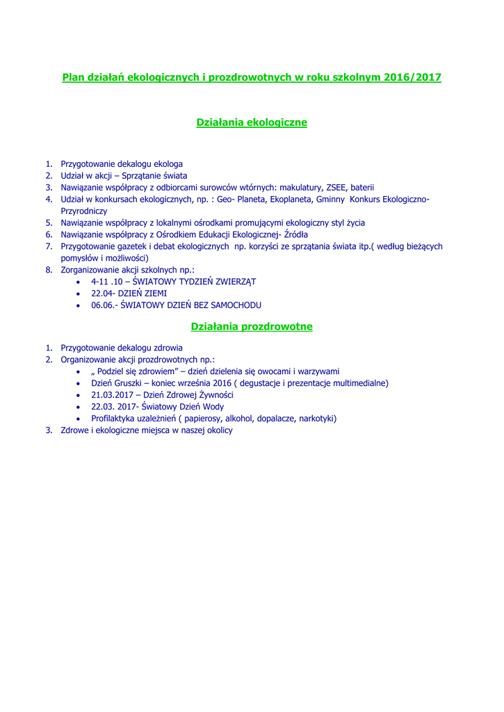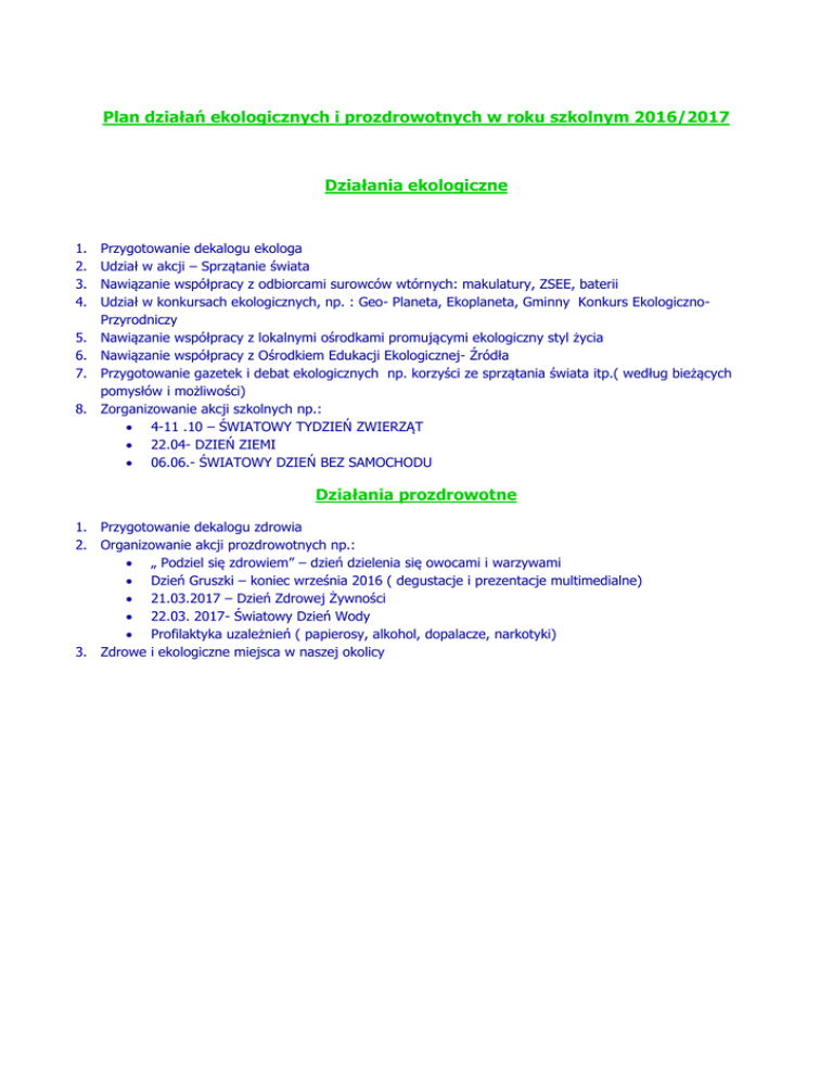 Plan działań ekologicznych i prozdrowotnych w roku szkolnym 2016