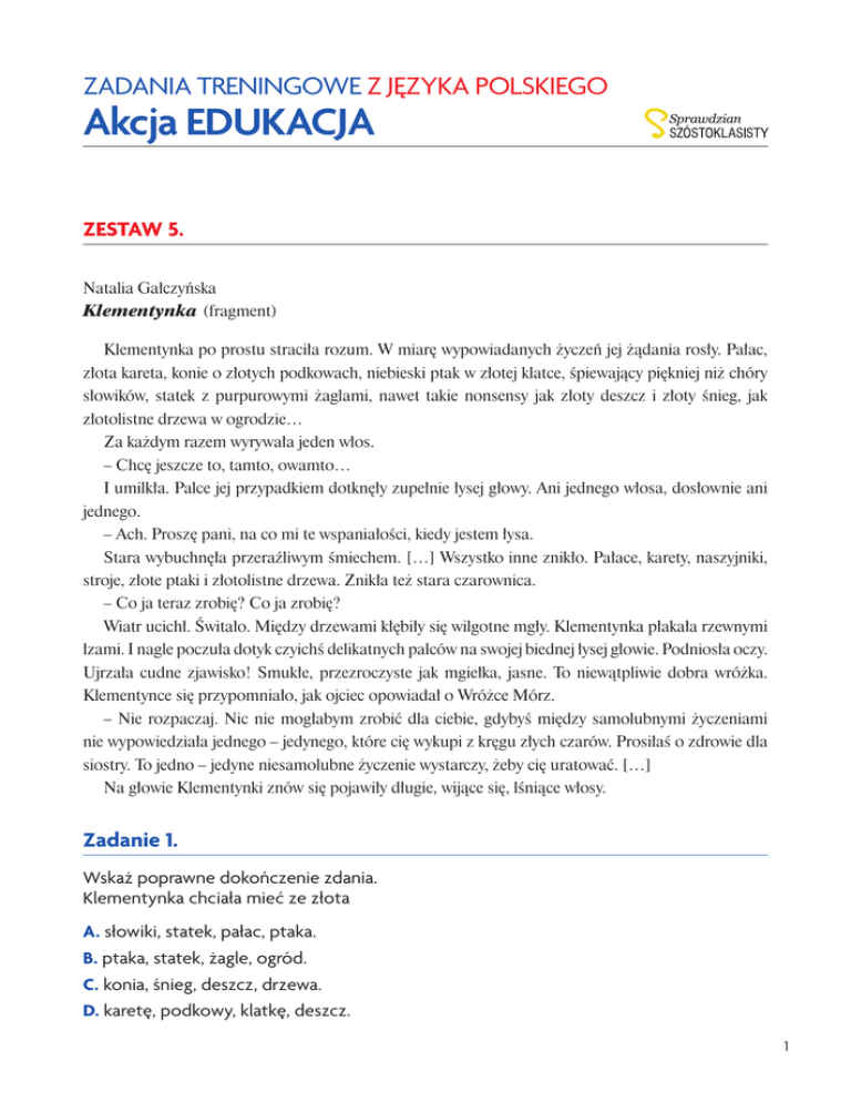 zadaNIA treningowe z Języka polskiego Akcja edukacja ZESTAW 5. Natalia Gałczyńska Klementynka (fragment) Klementynka po prostu straciła rozum. W miarę wypowiadanych życzeń jej żądania rosły. Pałac, złota kareta, konie o złotych podkowach, niebieski ptak w złotej klatce, śpiewający piękniej niż chóry słowików, statek z purpurowymi żaglami, nawet takie nonsensy jak złoty deszcz i złoty śnieg, jak złotolistne drzewa w ogrodzie… Za każdym razem wyrywała jeden włos. – Chcę jeszcze to, tamto, owamto… I umilkła. Palce jej przypadkiem dotknęły zupełnie łysej głowy. Ani jednego włosa, dosłownie ani jednego. – Ach. Proszę pani, na co mi te wspaniałości, kiedy jestem łysa. Stara wybuchnęła przeraźliwym śmiechem. […] Wszystko inne znikło. Pałace, karety, naszyjniki, stroje, złote ptaki i złotolistne drzewa. Znikła też stara czarownica. – Co ja teraz zrobię? Co ja zrobię? Wiatr ucichł. Świtało. Między drzewami kłębiły się wilgotne mgły. Klementynka płakała rzewnymi łzami. I nagle poczuła dotyk czyichś delikatnych palców na swojej biednej łysej głowie. Podniosła oczy. Ujrzała cudne zjawisko! Smukłe, przezroczyste jak mgiełka, jasne. To niewątpliwie dobra wróżka. Klementynce się przypomniało, jak ojciec opowiadał o Wróżce Mórz. – Nie rozpaczaj. Nic nie mogłabym zrobić dla ciebie, gdybyś między samolubnymi życzeniami nie wypowiedziała jednego – jedynego, które cię wykupi z kręgu złych czarów. Prosiłaś o zdrowie dla siostry. To jedno – jedyne niesamolubne życzenie wystarczy, żeby cię uratować. […] Na głowie Klementynki znów się pojawiły długie, wijące się, lśniące włosy. Zadanie 1. Wskaż poprawne dokończenie zdania. Klementynka chciała mieć ze złota A. słowiki, statek, pałac, ptaka. B. ptaka, statek, żagle, ogród. C. konia, śnieg, deszcz, drzewa. D. karetę, podkowy, klatkę, deszcz. 1 | Akcja EDUKACJA Zadania treningowe z języka polskiego Zadanie 2. Wskaż poprawne dokończenie zdania. Klementynka straciła wszystkie włosy, ponieważ A. poprosiła o prezent dla siostry. B. została oszukana przez Wróżkę Mórz. C. była zbyt zachłanna w swych życzeniach. D. stara czarownica zniknęła. Zadanie 3. Wskaż poprawne dokończenie zdania. W podanym fragmencie utworu występują A. Klementynka i Wróżka Mórz. B. czarownica, Wróżka Mórz i Klementynka. C. Klementynka i czarownica. D. czarownica, Wróżka Mórz i siostra Klementynki. Zadanie 4. Wskaż poprawne dokończenie zdania. Słowa: „Cudne zjawisko – smukłe, przezroczyste jak mgiełka, jasne” odnoszą się do A. Klementynki. B. czarownicy. C. siostry Klementynki. D. Wróżki Mórz. Zadanie 5. Czego dotyczyło „jedyne niesamolubne życzenie” Klementynki? ................................................................................... ................................................................................... ................................................................................... ................................................................................... 2 | Akcja EDUKACJA Zadania treningowe z języka polskiego Zadanie 6. Wskaż poprawne dokończenie zdania. Wróżka Mórz pojawiła się przed Klementynką, aby A. przestraszyć dziewczynkę. B. przywrócić jej utracone prezenty. C. przywrócić jej włosy. D. zabrać dziewczynkę do swego królestwa. Zadanie 7. Do podanych rzeczowników dopisz odpowiednie przymiotniki z tekstu. ptak – . . . . . . . . . . . . . . . . . . . . . . . . . . . . . . . . . . klatka – . . . . . . . . . . . . . . . . . . . . . . . . . . . . . . . . . palce – . . . . . . . . . . . . . . . . . . . . . . . . . . . . . . . . . wróżka – . . . . . . . . . . . . . . . . . . . . . . . . . . . . . . . Zadanie 8. Wypisz z tekstu po jednym przykładzie: • równoważnika zdania ................................................................................... • zdania pojedynczego rozwiniętego ................................................................................... • zdania pojedynczego nierozwiniętego ................................................................................... Zadanie 9. Przekształć podane zdania w równoważniki zdań. Płakała rzewnymi łzami. ................................................................................... Prosiłaś o zdrowie dla siostry. ................................................................................... 3 | Akcja EDUKACJA Zadania treningowe z języka polskiego Znikła też stara czarownica. ................................................................................... Za każdym razem wyrywała jeden włos. ................................................................................... Zadanie 10. W imieniu Klementynki napisz list do Wróżki Mórz. Podziękuj w nim za okazaną pomoc i opowiedz, co wydarzyło się po waszym spotkaniu. ................................................................................... ................................................................................... ................................................................................... ................................................................................... ................................................................................... ................................................................................... ................................................................................... ................................................................................... ................................................................................... ................................................................................... ................................................................................... ................................................................................... ..........................