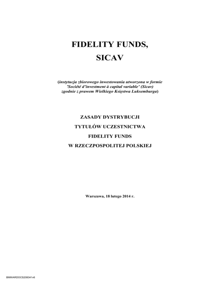 FIDELITY FUNDS, SICAV (instytucja zbiorowego inwestowania utworzona w formie ’Société d’investment à capital variable’ (Sicav) zgodnie z prawem Wielkiego Księstwa Luksemburga) ZASADY DYSTRYBUCJI TYTUŁÓW UCZESTNICTWA FIDELITY FUNDS W RZECZPOSPOLITEJ POLSKIEJ Warszawa, 18 lutego 2014 r. BMWARDOCS208341v6 Fidelity Funds („Spółka”) jest zagraniczną instytucją zbiorowego inwestowania utworzoną 15 czerwca 1990 r. w formie Société d’investment à capital variable (Sicav) zgodnie z prawem Wielkiego Księstwa Luksemburga. Spółka zarejestrowana jest w Registre de Commerce et des Sociétés of Luxembourg pod numerem B34036. Spółka prowadzi działalność jako fundusz parasolowy. Składa się z wielu Subfunduszy, z których każdy reprezentuje portfel papierów wartościowych oraz innych aktywów i pasywów, odpowiadających różnym strategiom inwestycyjnym. Celem działalności Spółki jest zarządzanie posiadanymi przez nią aktywami. Spółka zamierza emitować tytuły uczestnictwa, w sposób opisany w Statucie i w aktualnym Prospekcie. Spółka została utworzona zgodnie z wymogami przewidzianymi w Dyrektywie 2009/65/WE z 13 lipca 2009 r., w sprawie koordynacji przepisów ustawowych, wykonawczych i administracyjnych odnoszących się do przedsiębiorstw zbiorowego inwestowania w zbywalne papiery wartościowe (UCITS) zmieniającej Dyrektywę Rady 85/611/EWG. W dokumencie akcje Spółki określa się jako Tytuły Uczestnictwa, zaś akcjonariuszy jako posiadaczy Tytułów Uczestnictwa bądź Uczestników. Spółka zamierza zbywać Tytuły Uczestnictwa Subfunduszy na terytorium Rzeczpospolitej Polskiej na warunkach i zgodnie z zasadami określonymi poniżej. I. INFORMACJE OGÓLNE § 1. DEFINICJE Terminy pisane wielką literą w dokumencie mają znaczenie przypisane im w poniższej tabeli: Agent ds. Administracyjnych spółka FIL Investment Management (Luxembourg) S.A., z siedzibą przy 2a, Rue Albert Borschette, L-1246, Luksemburg. Agent Płatności Danske Bank A/S S.A. Oddział w Polsce, z siedzibą w Warszawie przy ul. Emilii Plater 28, 00-688 Warszawa, Polska. Agent Serwisowy Atlantic Fund Services sp z o.o., z siedzibą w Warszawie przy ul. Cybernetyki 21, 02-677 Warszawa, Polska. Dyrektorzy członkowie Rady Dyrektorów. Dystrybutor FIL (Luxembourg) S.A. z siedzibą 2a, Rue Albert Borschette, L1246 Luksemburg. Dzień Roboczy każdy dzień, w którym otwarte są banki w Polsce i w Luksemburgu. Dzień Wyceny każdy dzień tygodnia od poniedziałku do piątku (włącznie) z wyjątkiem 25 grudnia (Boże Narodzenie) i 1 stycznia (Nowy Rok). Formularz Zapisu początkowy wniosek prawidłowo wypełniony i złożony przez Inwestora w celu nabycia Tytułów Uczestnictwa. Główny Dystrybutor spółka FIL Distributors, z siedzibą przy Pembroke Hall 42 Crow Lane, Pembroke HM19, Bermudy. Inwestor osoba fizyczna, osoba prawna lub jednostka organizacyjna nie posiadająca osobowości prawnej, która zamierza nabyć Tytuły 2 BMWARDOCS208341v6 Uczestnictwa w kapitale zakładowym Spółki. Tytuły Uczestnictwa tytuły uczestnictwa w kapitale zakładowym Spółki. Typ Tytułów Uczestnictwa dana kategoria Tytułów Uczestnictwa. PLN lub Złoty oficjalny środek płatniczy na terytorium Rzeczpospolitej Polskiej. Pośrednik podmiot powołany przez Dystrybutora, który działa w charakterze dystrybutora Tytułów Uczestnictwa na terytorium Rzeczpospolitej Polskiej, na podstawie upoważnienia do występowania w charakterze pośrednika w procesie sprzedaży i umarzania Tytułów Uczestnictwa zagranicznych funduszy inwestycyjnych (art. 258 Ustawy o Funduszach Inwestycyjnych). Prospekt aktualny prospekt i/lub skróty prospektu Spółki, sporządzone zgodnie z właściwymi przepisami prawa luksemburskiego. Przedstawiciel FIL (Luxembourg) S.A. spółka akcyjna Przedstawicielstwo w Polsce z siedzibą w Warszawie przy pl. Piłsudskiego 3, 00-078 Warszawa, Polska. Rada Dyrektorów Radę Dyrektorów Spółki. Rejestr Uczestników rejestr Uczestników Spółki prowadzony przez Rejestratora i Agenta Transferowego. Rejestrator i Agent Transferowy spółka FIL Investment Management (Luxembourg) S.A., z siedzibą przy 2a, Rue Albert Borschette, L-1246, Luksemburg, o której mowa w Prospekcie Spółka Fidelity Funds, a Société d’investissement à capital variable, z siedzibą przy 2a, Rue Albert Borschette, L-1246, Luksemburg. Spółka Zarządzająca spółka FIL Investment Management (Luxembourg) S.A., z siedzibą przy 2a, Rue Albert Borschette, L-1246, Luksemburg, Statut Statut Spółki. Subfundusz dowolny subfundusz Spółki, którego Tytuły Uczestnictwa mogą być publicznie oferowane do sprzedaży w Rzeczpospolitej Polskiej. Uczestnik osoba fizyczna, osoba prawną lub jednostka organizacyjna nie posiadająca osobowości prawnej posiadającą Tytuły Uczestnictwa. Ustawa o Funduszach Inwestycyjnych ustawa z dnia 27 maja 2004 r. o funduszach inwestycyjnych (Dz. U. z 2014 r., Nr 157, z późn. zm.). Wartość Aktywów Netto wartość aktywów pomniejszona o wartość zobowiązań Spółki, Subfunduszu lub typu Tytułów Uczestnictwa w Subfunduszu określana zgodnie z zasadami opisanymi w Prospekcie. Zadeklarowana Wpłaty Zasady Kwota kwota zadeklarowana w Zleceniu Nabycia, za którą mają być nabyte Tytuły Uczestnictwa. niniejsze zasady dystrybucji Tytułów Uczestnictwa Fidelity Funds 3 BMWARDOCS208341v6 w Rzeczpospolitej Polskiej będące dokumentem, o którym mowa w art. 253 ust. 3 pkt 1 Ustawy o Funduszach Inwestycyjnych. Zlecenie Zamiany dokument złożony przez Uczestnika w celu dokonania zamiany Tytułów Uczestnictwa. Zlecenie Nabycia dokument złożony przez Inwestora w celu nabycia Tytułów Uczestnictwa. Zlecenie Sprzedaży dokument złożony przez Uczestnika w celu sprzedaży Tytułów Uczestnictwa. 4 BMWARDOCS208341v6 § 2. TYTUŁY UCZESTNICTWA 1. Spółka może emitować Tytuły Uczestnictwa różnych Typów, które zostały opisane w Prospekcie. Wszystkie Tytuły Uczestnictwa 