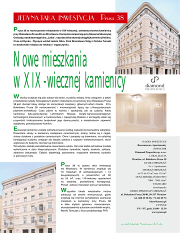 P rusa 38 to nowoczesne mieszkania w XIX-wiecznej, odrestaurowanej kamienicy przy Bolesława Prusa 38 we Wrocławiu. Kamienica mieści się przy Skwerze Skaczącej Gwiazdy, obok dawnego kina „Lalka”, naprzeciwko słynnej okrągłej kamienicy Hellera, 2 km od Rynku. Płynąca wśród zieleni Odra, Park Stanisława Tołpy i Ostrów Tumski to doskonałe miejsca do relaksu i wypoczynku. Nowe mieszkania w XIX-wiecznej kamienicy W okolicy znajduje się plac zabaw dla dzieci, w pobliżu sklepy, firmy usługowe, a także przedszkola i szkoły. Niewątpliwym atutem mieszkania w kamienicy przy Bolesława Prusa 38 jest również łatwy dostęp do komunikacji miejskiej i głównych arterii miasta. Przy Bolesława Prusa 38 nowoczesność i innowacyjność łączą się z klasycystycznym pięknem architektury. Czas płynie tu wolniej i spokojniej, jak za czasów, kiedy kamienica była perłą dawnej Lehmdamm Strasse. Dzięki najnowocześniejszym technologiom stosowanym w budownictwie i najwyższej dbałości o szczegóły udało się przywrócić historycznemu budynkowi jego dawny prestiż, a mieszkańcom zapewnić wyjątkowy, ponadczasowy komfort. E lewacja kamienicy została odrestaurowana według wskazań konserwatora zabytków. Drewniane stropy w kamienicy zastąpiono ceramicznymi, ściany nośne są z cegieł, ściany działowe z pustaków ceramicznych. Okna i parapety są drewniane, na ostatniej kondygnacji budynku znajduje się fasada szklana z szybami wielokomorowymi, drzwi wejściowe do budynku również są drewniane. W budynku została zainstalowana nowoczesna winda. Hol oraz klatka schodowa została wykończona w stylu klasycystycznym. Ozdobne żyrandole, tapety, terakota, szklana, zdobiona balustrada. Całości dopełniają zachowane, oryginalne elementy budynku w pierwszym holu. P rusa 38 to jedyna taka inwestycja we Wrocławiu. W kamienicy znajduje się 18 mieszkań (5 jednopokojowych i 13 dwupokojowych) o powierzchni od 30 do 55 m2, oraz 110-metrowy apartament na ostatniej, przeszklonej kondygnacji. Ponad połowa mieszkań jest już sprzedana. W szystkie lokale mieszkalne można zobaczyć na stronie www.prusa.pl, gdzie znajdują się również przykładowe aranżacje mieszkań w kamienicy przy Prusa 38 w kilku stylach (glamour, nowoczesnym, skandynawskim) autorstwa architektki wnętrz, Moniki Tomczak z biura projektowego PiRI. NAZWA INWESTYCJI Renesansowe Apartamenty INWESTOR Diamond Properties sp. z o.o. LOKALIZACJA Wrocław, ul. Bolesława Prusa 38 LICZBA MIESZKAŃ 18 + 1 apartament METRAŻ MIESZKAŃ od 35 do 55 m2 oraz 110 m2 CENA MIESZKAŃ BRUTTO 7000 - 7800 zł/m2 STANDARD deweloperski BIURO SPRZEDAŻY MIESZKAŃ ul. Bolesława Prusa 38/40, 50-317 Wrocław tel. 608 29 38 38, 71 341 09 73 [email protected] CZYNNE PN - PT, godz. 10.00 - 15.30 www.prusa.pl