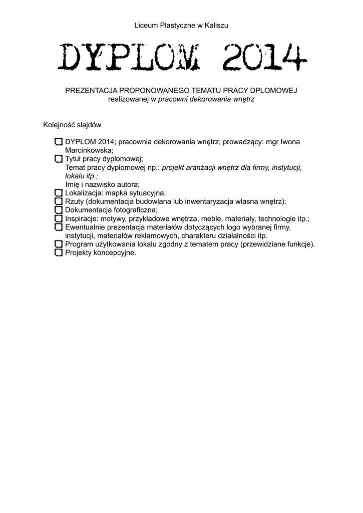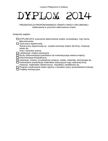 Liceum Plastyczne w Kaliszu DYPLOM 2014 PREZENTACJA PROPONOWANEGO TEMATU PRACY DPLOMOWEJ realizowanej w pracowni dekorowania wnętrz Kolejność slajdów DYPLOM 2014; pracownia dekorowania wnętrz; prowadzący: mgr Iwona Marcinkowska; Tytuł pracy dyplomowej; Temat pracy dyplomowej np.: projekt aranżacji wnętrz dla firmy, instytucji, lokalu itp.; Imię i nazwisko autora; Lokalizacja: mapka sytuacyjna; Rzuty (dokumentacja budowlana lub inwentaryzacja własna wnętrz); Dokumentacja fotograficzna; Inspiracje: motywy, przykładowe wnętrza, meble, materiały, technologie itp.; Ewentualnie prezentacja materiałów dotyczących logo wybranej firmy, instytucji, materiałów reklamowych, charakteru działalności itp. Program użytkowania lokalu zgodny z tematem pracy (przewidziane funkcje). Projekty koncepcyjne.