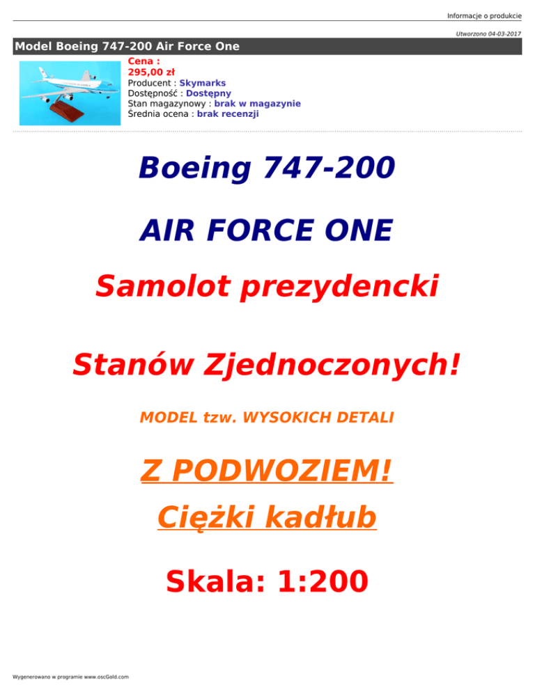 Informacje o produkcie Utworzono 04-03-2017 Model Boeing 747-200 Air Force One Cena : 295,00 zł Producent : Skymarks Dostępność : Dostępny Stan magazynowy : brak w magazynie Średnia ocena : brak recenzji Boeing 747-200 AIR FORCE ONE Samolot prezydencki Stanów Zjednoczonych! MODEL tzw. WYSOKICH DETALI Z PODWOZIEM! Ciężki kadłub Skala: 1:200 Wygenerowano w programie www.oscGold.com Model jest ogromny! Rozpiętość skrzydeł: 35 cm Długość kadłuba: 30 cm Bardzo dobrej jakości, wysokiej klasy malowanie. Producent: Skymarks Produkt do szybkiego i bardzo łatwego złożenia bezklejowego, składa się z kilku elementów. Elementy zabezpieczone w plastikowych blistrach, całość opakowana w pudełko.