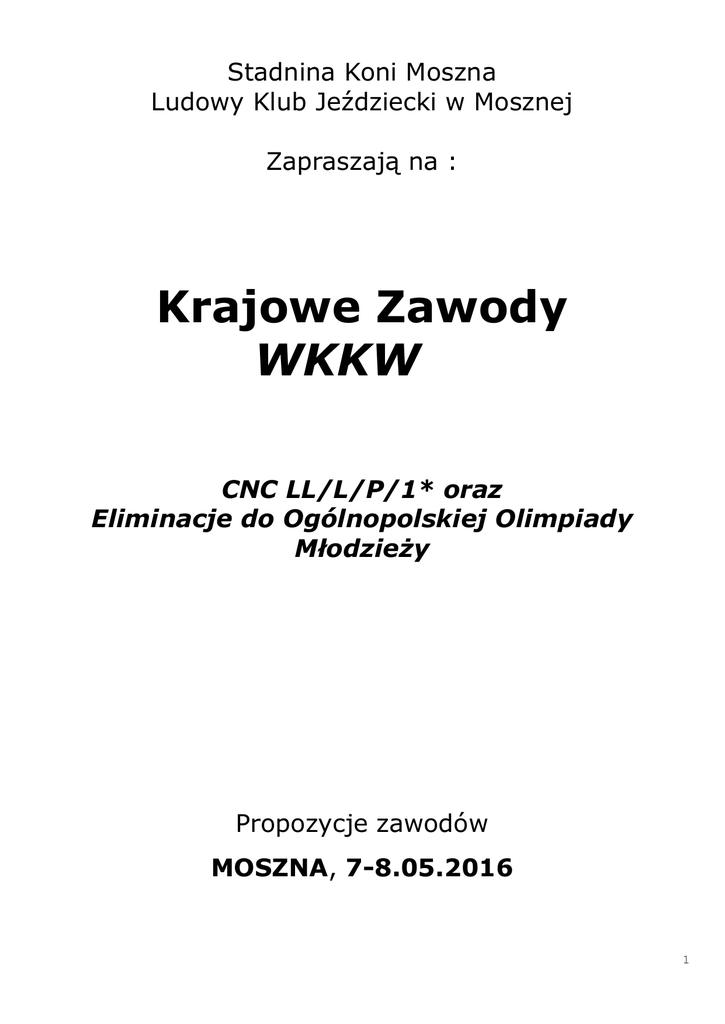 Stadnina Koni Moszna Ludowy Klub Jeździecki w Mosznej Zapraszają na : Krajowe Zawody WKKW CNC LL/L/P/1* oraz Eliminacje do Ogólnopolskiej Olimpiady Młodzieży Propozycje zawodów MOSZNA, 7-8.05.2016 1 ZAWODY KRAJOWE X Miejsce: Stadnina Koni Moszna Data: 7-8.05.2016 Informacje podstawowe Zawody zostaną rozegrane zgodnie z: Statutem Polskiego Związku Jeździeckiego Przepisami Ogólnymi Polskiego Związku Jeździeckiego Regulaminem rozgrywania zawodów krajowych w WKKW Polskiego Związku Jeździeckiego Przepisami weterynaryjnymi Polskiego Związku Jeździeckiego FEI Rules for Eventing, 24th Edition 1st January 2015 Przepisami antydopingowymi Polskiego Związku Jeździeckiego Regulaminem OOM 2016 Zatwierdzono przez KS PZJ i menadżera WKKW Warszawa 19.04.2016 2 I. Sprawy Organizacyjne Typ Zawodów Klasy: CNC/1* x CNC/ P x CNC/ L x CNC/ LL x Kuce x ELIMINACJE DO OOM KUCY I DUŻYCH KONI Kategoria Data: Miejsce Region : Seniorzy/ Młodzi Jeźdźcy /Juniorzy/ Juniorzy Młodsi/ Młodzicy : 7-8.05.2016 : Stadnina Koni Moszna : opolskie Organizator Nazwa Stadnina Koni Moszna Sp. z o.o. Adres ul. Wiejska 30 Kod pocztowy 47-370 Zielina Telefon 77 466 88 33 Email [email protected] Internet www.moszna.pl Fax : 77 466 84 16 Komitet Organizacyjny Przewodniczący: Magdalena Donimirska-Wodzicka Dyrektor Zawodów: Biuro Zawodów: Magdalena Donimirska-Wodzicka Kamil Skupień / Maria Musioł Obsługa komputerowa: Włodzimierz Gajda Dyrektor Techniczny: Henryk Polednia Szef Stajni: Tadeusz Kaliciński Dane kontaktowe na miejscu zawodów: Adres ul. Wiejska 30 ; 47-370 Zielina Telefon 77 466 88 33 ; 77 466 84 29 ; 77 466 84 16 Telefon kom.: 602 62 72 74 3 II.Osoby oficjalne Komisja sędziowska Lp . Imię Nazwisko Funkcja KLASA 1. Paweł Sojecki Sędzia Główny zawodów LL/L/P/1* 2. Małgorzata Kasińska Sędzia zawodów LL/L/P/1* 3. Krzysztof Kopacz Sędzia zawodów LL/L/P/1* Delegat Techniczny Imię Nazwisko: Roman Krzyżanowski Gospodarz Toru – próba terenowa Imię Nazwisko: Gospodarz Toru – próba skoków Imię Nazwisko: Marcin Michałek Komisarz Imię Nazwisko: Marcin Michałek Zbigniew Bojda Lekarz weterynarii Zawodów Imię Nazwisko: Sławomir Gołyś - tel :502 024 063 Lekarz medycyny zawodów Imię Nazwisko: zespół ratunkowy karetki pogotowia Kowal Imię Nazwisko: Krystian Anioł - tel : 604 093 894 4 III. Warunki Techniczne Program zawodów KLASA LL / Elim. OOM Kuce KLASA L / Elim. OOM Duże Konie KLASA P KLASA 1* Data/Godz. Data/Godz. Data/Godz. Data/Godz. Otwarte trasy krosu 6.05.16 godz.16:30 6.05.16 godz.16:30 6.05.16 godz.16:30 6.05.16 godz.16:30 1szy Przegląd Koni ------ ------ ------ ------ 1szy Start Ujeżdzenie 7.05.16 godz.9.00 7.05.16 po kl. LL 7.05.16 po kl. L 7.05.16 po kl. P 1szy Start kros 8.05.16 godz. 10.00 8.05.16 po kl. LL 8.05.16 po kl. L 8.05.16 po kl. P 1szy Start Skoki 7.05.16 godz. 14.00 8.05.16 po zakończeniu zawodów ok. godz. 15.30 7.05.16 po kl. LL 8.05.16 po zakończeniu zawodów ok. godz. 15.30 7.05.16 po kl. L 8.05.16 po zakończeniu zawodów ok. godz. 15.30 7.05.16 po kl. P 8.05.16 po zakończeniu zawodów ok. godz. 15.30 Wręczanie nagród Ujeżdżenie KLASA LL/Elim. OOM - Kuce – zgodnie z reg. WKKW 2016 KLASA P FEI 2009 1* A KLASA L/Elim. OOM - DK – zgodnie z reg. WKKW 2016 KLASA 1* FEI 2015 1* B PRÓBA TERENOWA KLASA LL/Elim. OOM - Kuce odcinek Typ podłoża: Długość : Tempo Ilośc skoków D Trawa , piach 1600-2000 Max: 450m/min 12 - 16 KLASA L - Elim. - OMM Duże Konie Odcinek Typ podłoża: Długość : Tempo Ilośc skoków D Trawa , piach 1600-2500 470-500 m/min 15 - 20 5 KLASA P odcinek Typ podłoża: Długość : Tempo Ilośc skoków D Trawa , piach 1600-2800 500 - 520 m/min 20 - 25 CNC1* odcinek Typ podłoża: Długość : Tempo Ilośc skoków D Trawa , piach 2400-3200 520 m/min max. 29 4. SKOKI LL / Elim. OOM Kuce Typ podłoża kwarcowe L / Elim. OOM Duże Konie kwarcowe Dystans (m) 250-400 250-450 300-450 max.600 300 325 325 350 Tempo (m/min) Ilośc przeszkód/skoków Ilość przeszkód IV. KLASA P CNC1* kwarcowe kwarcowe 9 11 11 8 8-10 10 13 10-11/13 NAGRODY : Miejsce LL / Elim. OOM Kuce L / Elim. OOM Duże Konie rzeczowe rzeczowe rzeczowe rzeczowe rzeczowe pula 2000 1 2 3 4 5 SUMA rzeczowe rzeczowe rzeczowe rzeczowe rzeczowe Łączna P 500 300 200 150 100 1250 ŁĄCZNA PULA NAGRÓD W ZAWODACH CNC CNC1* 650 450 350 250 150 1850 5000 ZŁ 6 ZGŁOSZENIA V. 1.Zgłoszenia należy nadsyłać : w terminie do 22.04.2016 na adres : Stadnina Koni Moszna Ul. Wiejska 30 ;: 47-370 Zielina Fax : 77 466 84 16 Email: [email protected] Listy startowe będą dostępne do wglądu od godz. 20.00 dnia: 6.05.16 na stronie www.moszna.pl 2. Zgłaszający ma obowiązek dokonania przedpłaty za boks w wysokości min.200 zł w terminie do 22.04.2016 oraz przesłania dowodu wpłaty (kserokopii) wraz ze zgłoszeniami na adres [email protected] lub fax :12 466 84 16 b. VI. Opłaty : Klasa LL/Elim. OOM Kuce Opłata (PLN) 150 L/ Elim. OMM Duże konie 150 P 180 CNC 1* 200 Boks 220 Podłączenie do prądu 80 krajowy program badań antydopingowych koni (od CNC1*) 15 Opłaty w wysokości 200 zł zaliczki w terminie do 22.04.2016 należy przelać na konto Stadniny Koni Moszna : Numer konta: 87 1540 1030 2103 4602 2073 0001 BOŚ Bank S.A oddział w Opolu Odbiorca :Stadnina Koni Moszna ul. Wiejska 30 ; 47-370 Zielina 7 VII. Oferta pobytu 1 Zawodnicy i Luzacy: Rezerwacja noclegów : www.moszna.pl ( pokoje hotelowe - rezerwuj on line ) lub tel.kom. : 665 155 433 2 Konie :Stajnie zostaną udostępnione dla koni od dnia 6.05.15 Wielkość boksów 3m x 3m (minimum 3m x 3m) KWALIFIKACJE CIC1*/ KLASA P CCI1* CNC1* CNC2 * /MPMJ*2) CNC3* /MPS*2) /MPJ*2) posiadanie brązowej odznaki jeździeckie j 1) posiadanie srebrnej odznaki jeździeckie j 1) oraz oraz minimum 2 RK minimum 2 RK 2x L 2xP lub lub 1xL plus 2 x LL 1xP plus 2 x L posiadanie srebrnej odznaki jeździeckiej 1) oraz posiadanie srebrnej odznaki jeździeckiej 1) oraz minimum 3 RK minimum 2 RK 3 x CNC1* 2 x CNC2* lub 2 x CNC1* 