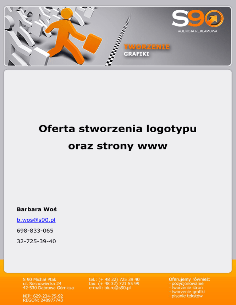 Oferta stworzenia logotypu oraz strony www Barbara Woś [email protected] 698-833-065 32-725-39-40 Agencja Reklamowa S 90 Nasza firma oprócz pozycjonowania, tworzenia stron www, zajmuje się również tworzeniem grafiki. Oferujemy Państwu współpracę z doświadczonym zespołem, na koncie którego znajduje się wiele ciekawych i innowacyjnych projektów. Każdy nasz projekt jest prowadzony przy współpracy klienta, który na każdym etapie jego realizacji ma możliwość proponowania zmian. Nasze propozycje grafiki współgrają z treścią stron, czy profilem działalności danej firmy, dla której tworzymy np. logo. Każdy projekt jest indywidualny, ponieważ każdy klient jest wyjątkowy. Nie powielamy szablonów. Podejmujemy się realizacji każdego projektu. Pracę rozpoczynamy zaraz po podpisaniu umowy. Działamy szybko, a wszelkie poprawki nanosimy na bieżąco. Po ukończeniu projektu przekazujemy naszym klientom prawa majątkowe do zrealizowanego projektu. Każdy zakończony projekt przekazujemy klientowi na nośniku CD, wraz ze wszystkimi źródłami do stworzonej grafiki. Wśród naszych usług znajdują się: Projektowanie papieru firmowego - papier firmowy jest integralną częścią wizerunku każdej firmy, profesjonalnie przygotowany papier do korespondencji świadczy profesjonalizmie każdej firmy, dlatego też proponujemy Państwu skorzystanie z naszej oferty stworzenia profesjonalnego papieru firmowego Projektowanie wizytówek - jesteśmy w stanie stworzyć dla Państwa wizytówkę, która poprzez swoją grafikę będzie informować klienta, że oferowana mu przez firmę współpraca będzie na najwyższym poziomie Projektowanie logo - nasz zespół posiada spore doświadczenie w projektowaniu logo dla firm, dla różnego typu organizacji. Nasze pomysły są innowacyjne oraz pełne inwencji twórczej, dlatego też stworzone przez nas logo szybko staje się rozpoznawalne Projektowanie ulotek- ulotka to forma reklamy, dlatego też staramy się, by nasze pomysły graficzne trafiały prosto do jej adresatów. Nasza grafika ma być interesująca i zachęcająca potencjalnych klientów do zapoznania się z szerszą ofertą danej firmy Projektowanie plakatów- praca nad projektem plakatu to dla nas wyzwanie, które pozwala potwierdzić nasze umiejętności. Jesteśmy zespołem kreatywnym, który z pewnością poprzez grafikę wyrazi wszystkie ważne treści i stworzy plakat, którego potrzebujesz Projektowanie banerów internetowych - Internet to kopalnia wiedzy, dlatego też reklama Państwa firmy musi być widoczna, by przynosiła odpowiednie rezultaty. Oferujemy Państwu nasze projekty banerów internetowych, które z pewnością zachęcą Internatów do sprawdzenia Państwa oferty Zapraszamy do zapoznania się z naszym cennikiem. CENNIK: LOGOTYP 3 projekty logo 4 poprawki do wybranego projektu logo w formatach: cdr, jpg, png przekazanie praw majątkowych do logotypu projekt dostarczamy na CD GRATIS projekt papieru firmowego STRONA INTERNETOWA 2 projekty 4 poprawki do wybranego projektu Serwis oparty na Systemie Samodzielnego Zarządzania CMS Wprowadzenie danych (treści) Formularz rezerwacji cena: 299 zł netto do 7 dni roboczych cena: 1500 zł netto Projekty graficzne do 7 dni roboczych po akceptacji logo Zapraszam do zapoznania się z naszymi projektami na http://www.s90.pl/nasze-portfolio/ Portfolio LOGOTYP WIYTÓWKI Więcej projektów znajdziecie Państwo na naszej stronie www.projekty-logo.com