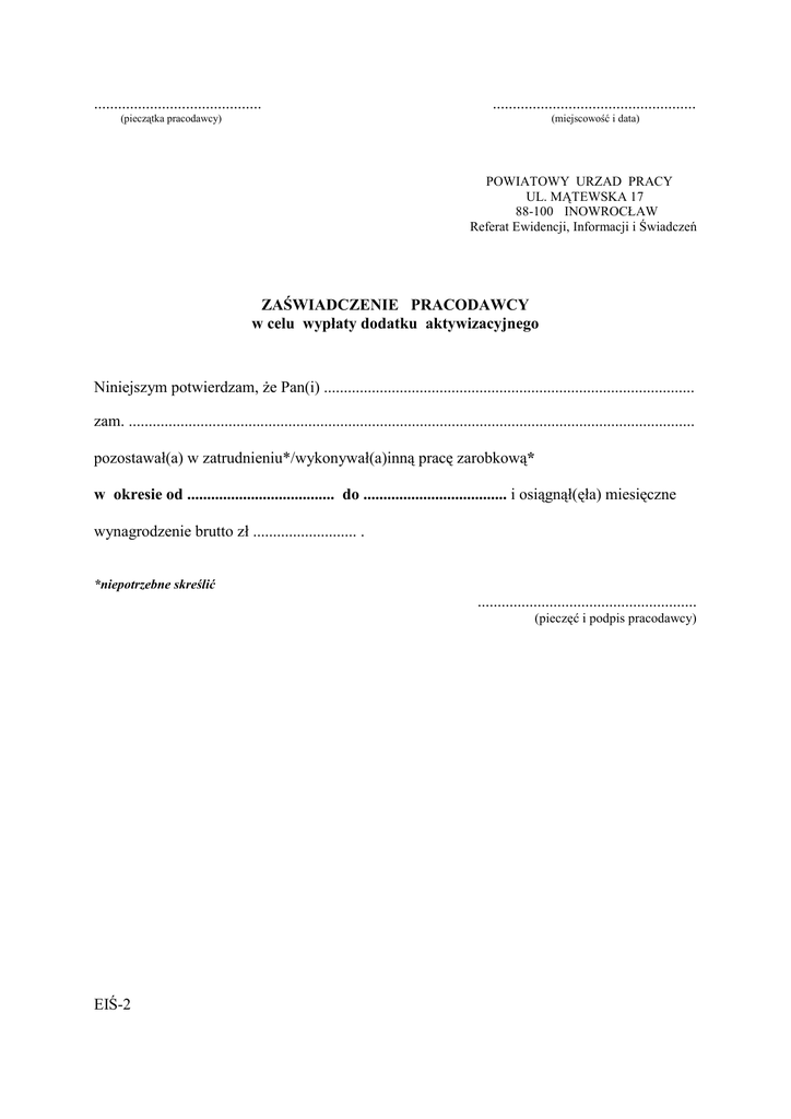 .......................................... ................................................... (pieczątka pracodawcy) (miejscowość i data) POWIATOWY URZAD PRACY UL. MĄTEWSKA 17 88-100 INOWROCŁAW Referat Ewidencji, Informacji i Świadczeń ZAŚWIADCZENIE PRACODAWCY w celu wypłaty dodatku aktywizacyjnego Niniejszym potwierdzam, Ŝe Pan(i) ............................................................................................. zam. .............................................................................................................................................. pozostawał(a) w zatrudnieniu*/wykonywał(a)inną pracę zarobkową* w okresie od ..................................... do .................................... i osiągnął(ęła) miesięczne wynagrodzenie brutto zł .......................... . *niepotrzebne skreślić ....................................................... (pieczęć i podpis pracodawcy) EIŚ-2