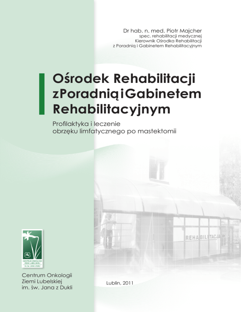Dr hab. n. med. Piotr Majcher spec. rehabilitacji medycznej Kierownik Ośrodka Rehabilitacji z Poradnią i Gabinetem Rehabilitacyjnym Ośrodek Rehabilitacji z Poradnią i Gabinetem Rehabilitacyjnym Profilaktyka i leczenie obrzęku limfatycznego po mastektomii Centrum Onkologii Ziemi Lubelskiej im. św. Jana z Dukli Lublin, 2011 PROGRAM REHABILITACJI KOBIET PO MASTEKTOMII Profilaktyka Obrzęku Limfatycznego Program realizowany w Ośrodku Rehabilitacji z Pora dnią i Gabinetem Rehabilitacyjnym Centrum Onkologii Ziemi Lubelskiej. Rak piersi jest najczęściej występującą u kobiet postacią choroby nowotworowej. W Polsce stanowi on ok. 20% ogółu wykrywanych u nich nowotworów złośli wych. Współczynniki surowe zachorowalności na ten nowotwór wynoszą dla Polski 25,1 na 100 tys. kobiet, a dla województwa lubelskiego 52,6 na 100 tys. kobiet. W województwie lubelskim rozpoznawanych jest rocznie ponad 700 przypadków nowych zachorowań na raka piersi, z czego ponad 300 operowanych jest w Centrum Onkologii Ziemi Lubelskiej. Leczenie i powikłania: Kobiety z rozpoznanym rakiem piersi są podda wane, w zależności od stopnia zaawansowania pro cesu nowotworowego, leczeniu chirurgicznemu, ra dioterapii, chemioterapii, leczeniu hormonalnemu lub skojarzonemu. Po radykalnym zabiegu operacyjnym wymagającym odjęcia piersi wraz z usunięciem okolicz nych węzłów chłonnych zwykle występują niekorzystne zmiany w obrębie kończyny górnej i pasa barkowego po stronie operowanej. 2 Do nich należą: • ograniczenie zakresu ruchomości w stawie barko wym • zmniejszenie siły mięśniowej strony operowanej • zaburzenia statyki tułowia, prowadzące do defor macji tułowia • obrzęk limfatyczny (występuje on w różnym stopniu u 30-70% operowanych z powodu raka piersi). Cel programu Wymienione powyżej niekorzystne następstwa radykalnej operacji raka piersi są wskazaniem do reha bilitacji medycznej. Umożliwia ona powrót chorej do ży cia społecznego i pełnej sprawności fizycznej. Celem programu rehabilitacji kobiet po mastekto mii jest: • zapobieganie rozwojowi niekorzystnych powikłań po leczeniu operacyjnym • zapobieganie niesprawności kobiet po mastektomii. Kwalifikacja do programu Kobiety po radykalnej mastektomii z powodu raka gruczołu piersiowego. 3 Opis programu: Program rehabilitacji kobiet po mastektomii obej muje kompleksowy program ćwiczeń rehabilitacyjnych we wczesnym (około 6 tygodni) okresie pooperacyj nym, a w tym: • zwiększenie zakresu ruchów w stawie barkowym stro ny operowanej • zwiększenie siły mięśniowej kończyny górnej strony operowanej • zapobieganie zastojowi chłonki w kończynie opero wanej oraz oddziaływania mające na celu wytwo rzenie krążenia obocznego • zwalczanie obrzęku przez stosowanie specjalnych ćwiczeń i zabiegów • korygowanie zmian postawy. Zakres postępowania rehabilitacyjnego: • delikatne ćwiczenia bierne z redresją prowadzone indywidualnie mają korzystny wpływ na stan czyn nościowy naczyń krwionośnych i chłonnych także likwidacji przykurczów w stawie barkowym • ćwiczenia oddechowe wspomagają odpływ chłon ki po stronie operowanej • ćwiczenia w odciążeniu zwiększają zakres ruchu w stawie barkowym • ćwiczenia samowspomagane zwiększają zakres ru chu w stawie barkowym • nauka automasażu usprawnia przepływ chłonki • edukacja pacjentki w zakresie zasad postępowania w życiu codziennym, tj. wysokiego biernego ułoże nia na klinie kończyny, konieczności wykonywania ćwiczeń w ciągu dnia (w tzw. międzyczasie), nosze nia odpowiedniej bielizny z dobrze dobrana protezą, ochrona ręki przed skaleczeniem, uciskiem, oparze niem oraz przeciążeniem wysiłkiem fizycznym. 4 Usprawnienie ruchem prowadzone jest w gru pach instruktażowych oraz ćwiczeniowych. Po wstępnym badaniu każda chora zostaje w zależności od kierunku przewidywanego postępowa nia rehabilitacyjnego zakwalifikowana do odpowiedniej grupy instruktażowej, której uczy się poprawnego wyko nywania ćwiczeń. Gdy pacjentka osiągnie określoną sprawność kończyny kierowana jest do właściwej grupy ćwiczeniowej I-ej, a następnie do II-giej. Czas uczestnic twa w zajęciach w każdej z wymienionych grup wynosi ok. 2 miesięcy. Zatrudniony personel: • • • • lekarz ze specjalizacją rehabilitacji medycznej magister rehabilitacji ruchowej fizjoterapeuta magister wychowania fizycznego ze specjalnością rehabilitacji ruchowej lub gimnastyki leczniczej. Wyposażenie zakładu: kabina do ćwiczeń UGUL drabinki do ćwiczeń materace do ćwiczeń rotor na kończyny górne rotor do ćwiczeń barku zestaw bloczków do ćwiczeń kończyny górnej zestaw podwieszek kijki do ćwiczeń piłki stół do masażu suchego aparat do kąpieli wirowych. 5 Czas trwania programu: Opisany powyżej zakres postępowania reha bilitacyjnego powinien być prowadzony przynajmniej przez okres 3 - 6 tygodni po zabiegu operacyjnym (z możliwością przedłużenia). Koszty: • Przewidywany koszt rehabilitacji jednej pacjentki w trybie 6-tygodniowym ok. 2100 pkt. (70 pkt. za oso bodzień), a w tym: • ćwiczenia bierne z redresją prowadzone indywidual nie lub w grupie (mogą być wykorzystywane w tym celu kijki drabinki) – 1 x dziennie przez okres minimum 6 tyg., • ćwiczenia oddechowe przy pomocy kijków (wspo magają odpływ chłonki po stronie operowanej • ćwiczenia te odbywają się w grupach lub indywi dualnie pod nadzorem fizjoterapeuty) – 3x dziennie przez 6 tygodni, • ćwiczenia w odciążeniu wykonywane indywidualnie przy współpracy z fizjoterapeutą (zwiększają zakres ruchu w stawie barkowym) - wykonywane 3 x dzien nie okres minimum 6 tygodn,i • ćwiczenia samowspomagane za pomocą zestawu bloczków lub rotora (zwiększają zakres ruchu w sta wie barkowym) – 3 x dziennie przez minimum 6 tygo dni, • nauka automasażu przez fizjoterapeutę(usprawnia przepływ chłonki) – 1 x w tygodniu przez okres m