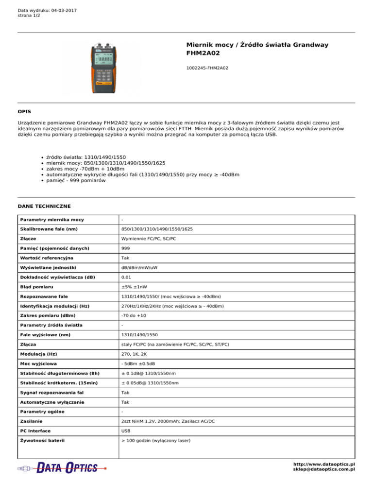 Data wydruku: 04-03-2017 strona 1/2 Miernik mocy / Źródło światła Grandway FHM2A02 1002245-FHM2A02 OPIS Urządzenie pomiarowe Grandway FHM2A02 łączy w sobie funkcje miernika mocy z 3-falowym źródłem światła dzięki czemu jest idealnym narzędziem pomiarowym dla pary pomiarowców sieci FTTH. Miernik posiada dużą pojemność zapisu wyników pomiarów dzięki czemu pomiary przebiegają szybko a wyniki można przegrać na komputer za pomocą łącza USB. źródło światła: 1310/1490/1550 miernik mocy: 850/1300/1310/1490/1550/1625 zakres mocy -70dBm + 10dBm automatyczne wykrycie długości fali (1310/1490/1550) przy mocy ≥ -40dBm pamięć - 999 pomiarów DANE TECHNICZNE Parametry miernika mocy - Skalibrowane fale (nm) 850/1300/1310/1490/1550/1625 Złącze Wymiennie FC/PC, SC/PC Pamięć (pojemność danych) 999 Wartość referencyjna Tak Wyświetlane jednostki dB/dBm/mW/uW Dokładność wyświetlacza (dB) 0.01 Błąd pomiaru ±5% ±1nW Rozpoznawane fale 1310/1490/1550/ (moc wejściowa ≥ -40dBm) Identyfikacja modulacji (Hz) 270Hz/1KHz/2KHz (moc wejściowa ≥ - 40dBm) Zakres pomiaru (dBm) -70 do +10 Parametry źródła światła - Fale wyjściowe (nm) 1310/1490/1550 Złącza stały FC/PC (na zamówienie FC/PC, SC/PC, ST/PC) Modulacja (Hz) 270, 1K, 2K Moc wyjściowa - 5dBm ±0.5dB Stabilność długoterminowa (8h) ± 0.1dB@ 1310/1550nm Stabilność krótkoterm. (15min) ± 0.05dB@ 1310/1550nm Sygnał rozpoznawania fal Tak Automatyczne wyłączanie Tak Parametry ogólne - Zasilanie 2szt NiHM 1.2V, 2000mAh; Zasilacz AC/DC PC Interface USB Żywotność baterii > 100 godzin (wyłączony laser) http://www.dataoptics.pl [email protected] Data wydruku: 04-03-2017 strona 2/2 Temperatura przechowywania -20℃ ~ +70℃ Temperatura pracy -10℃ ~ +50℃ Wilgotność względna < 90% (nieskondensowana) Wymiary (mm) 168L×76W×45H Waga (g) 260 CENY I DOSTĘPNOŚĆ Kod towaru Nazwa 1002245-FHM2A02 Miernik mocy / Źródło światła Grandway FHM2A02 Jedn. szt. http://www.dataoptics.pl [email protected] Powered by TCPDF (www.tcpdf.org)