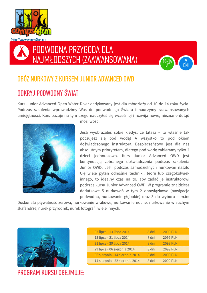 Kurs Junior Advanced Open Water Diver dedykowany jest dla młodzieży od 10 do 14 roku życia. Podczas szkolenia wprowadzimy Was do podwodnego Świata i nauczymy zaawansowanych umiejętności. Kurs bazuje na tym czego nauczyłeś się wcześniej i rozwija nowe, nieznane dotąd możliwości. Jeśli wyobrażałeś sobie kiedyś, że latasz – to właśnie tak poczujesz się pod wodą! A wszystko to pod okiem doświadczonego instruktora. Bezpieczeństwo jest dla nas absolutnym priorytetem, dlatego pod wodę zabieramy tylko 2 dzieci jednorazowo. Kurs Junior Advanced OWD jest kontynuacją zebranego doświadczenia podczas szkolenia Junior OWD, Jeśli podczas samodzielnych nurkowań naszło Cię wiele pytań odnośnie techniki, teorii lub czegokolwiek innego, to idealny czas na to, aby zadać je instruktorowi podczas kursu Junior Advanced OWD. W programie znajdziesz dodatkowe 5 nurkowań w tym 2 obowiązkowe (nawigacja podwodna, nurkowanie głębokie) oraz 3 do wyboru – m.in: Doskonała pływalność zerowa, nurkowanie wrakowe, nurkowanie nocne, nurkowanie w suchym skafandrze, nurek przyrodnik, nurek fotograf i wiele innych. 05 lipca - 13 lipca 2014 8 dni 2099 PLN 13 lipca - 21 lipca 2014 8 dni 2099 PLN 21 lipca - 29 lipca 2014 8 dni 2099 PLN 29 lipca - 06 sierpnia 2014 8 dni 2099 PLN 06 sierpnia - 14 sierpnia 2014 8 dni 2099 PLN 14 sierpnia - 22 sierpnia 2014 8 dni 2099 PLN Nurkowania obowiązkowe i do wyboru W czasie kursu wymagamy dwa nurkowania obowiązkowe, które każdy uczestnik musi zaliczyć: nawigacyjne i głębokie (do 21m). Oprócz tego uczestnik podchodzi do trzech nurkowań nieobowiązkowych, tzw. ‚do wyboru’. Nawigacja podwodna Nurkowanie to bardzo przyjemny sport i w zasadzie dość prosty. Jednak pewien zasób wiedzy i umiejętności jest niezbędny aby bezpiecznie nurkować. Są to techniki bardzo przydatne dla płetwonurka prowadzącego. Kombinacja nurkowania naturalnego i nawigacji z kompasem. Nurkowanie głębokie Podczas nurkowań głębokich każdy uczestnik pozna techniki i procedury nurkowania niezbędne, aby nurkować na głębokości do 21 m. Nurkowania do wyboru: Doskonała pływalność zerowa (trym) – W tej kwestii po kursie OWD na pewno jest kilka rzeczy do poprawienia, gdyż utrzymanie dobrej pływalności jest podstawą bezpiecznego nurkowania. Trym będzie się przewijać przez wszystkie nurkowania na kursie Junior Advanced Open Water Diver. Jeśli na kursie OWD radziłeś sobie w tym temacie nieźle, to czas, aby być w nim doskonałym. Nurkowanie wrakowe – Ulubiona forma płetwonurków. Nurkowanie wrakowe sprawa, że nurek czuje dreszczyk emocji, podniecenia i lęku. Nurkowanie wrakowe jest bardzo niebezpieczne, dlatego tak ważne, aby uczestnik kursu odbył tę część pod okiem instruktora. Wraki to najczęściej zatopione statki, które różnią się od siebie stanem technicznym, wielkością i rodzajem. Nurkowanie nocne – pozwala poznać życie podwodne z zupełnie innej strony. Podczas nurkowania nocnego uczestnik przeżyje chwile w towarzystwie niezapomnianych emocji. Nocą dojrzysz to czego nie zobaczysz w dzień, gdyż widzimy tylko to co oświetlimy latarką dzięki czemu mamy możliwość skupienia swojej uwagi na szczegółach. Nurkowanie w suchym skafandrze – Obecnie większość nurków uprawiających sport w naszej strefie klimatycznej używa takich skafandrów ze względów na m.in bardzo wysoki komfort cieplny. Nurek fotograf – Jeśli chcesz uświetnić swoje chwile pod wodą, aby pochwalić się znajomym to jest to idealny wybór dla Ciebie. Nurkowanie z aparatem nie jest tak proste jak mogłoby się wydawać… pewnie myślisz, że wystarczy nacisnąć spust migawki i uwiecznisz swoje chwile pod wodą – nic bardziej mylnego, przekonaj się i skorzystaj z nurkowania razem z aparatem fotograficznym. Zajęcia praktyczne Podczas kursu nie odbędą się zajęcia teoretyczne. Kursant sam musi przerobić powierzony mu materiał z podręcznika, wypełnić test sprawdzający opanowanie materiału oraz odbyć nurkowania danego typu wraz z instruktorem. (http://www.camps4fun.pl/wp-content /uploads/sites/4/2014 /04/kurs_nurkowy.jpg)Zaliczenie Pod koniec obozu każdy jego uczestnik podejdzie do bezstresowego zaliczenia na otwartych wodach, aby nareszcie stać się zaawansowanym certyfikowanym nurkiem z prawdziwego zdarzenia! Gdy uczestnik skończy 15 rok życia, wymienia certyfikat Junior Advanced OWD na Advanced OWD bez potrzeby podchodzenia do dodatkowego kursu. Podczas całego obozu nie zabraknie również czasu na wspólne wieczory pełne morskich opowieści, zajęć sportowych, kąpieli w mazurskich jeziorach, a także gier i zabaw integracyjnych. We własnym zakresie lub PKP z konwojentem z Gdańska, Warszawy, Poznania, Wrocławia, Krakowa , następnie autokarem z Giżycka (jeżeli zbierze się min. 5 osób z jednego miasta)- dodatkowa opłata według cennika w obie strony. W wypadku grup min. 10 osób możliwy dojazd z innych miejscowości. Uczestnicy zakwaterowani są w bazie Mazurskich Służb Ratowniczych w Okartowie. Stacja położona jest w przepięknej okolicy nad samym jeziorem Śniardwy. Do naszej dyspozycji oddany jest profesjonalny sprzęt wodny. Dzięki lokalizacji obozu jego uczestnicy mogą zobaczyć od wewnątrz, jak wygląda codzienna praca Mazurskich Służb Ratowniczych. (http://www.camps4fun.pl/wp-content/uploads/sites /4/2014/04/patent-junior-owd.jpg)Zaawansowany kurs nurkowania dla uczestników posiadających certyfikat OWD, poszerzający i utrwalający wiedzę na temat nurkowania. Międzynarodowy system szkolenia organizacji PADI zapewnia maksymalne bezpieczeństwo studentów podczas zajęć. Wymagany wiek do otrzymania certyfikatu Junior Advanced OWD to 10 – 14 lat. Uprawnienia te umożliwiają nurkowanie do głębokości 21 m z partnerem oraz możliwość uczestnictwa we wszystkich specjalizacjach nurkowych PADI i kursie Rescue Diver. Gdy uczestnik skończy 15 rok życia, certyfikat Junior Advanced OWD