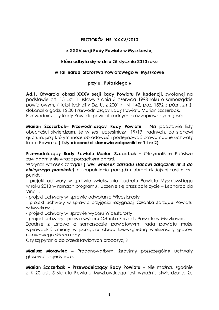 PROTOKÓŁ NR XXXV/2013 z XXXV sesji Rady Powiatu w Myszkowie, która odbyła się w dniu 25 stycznia 2013 roku w sali narad Starostwa Powiatowego w Myszkowie przy ul. Pułaskiego 6 Ad.1. Otwarcia obrad XXXV sesji Rady Powiatu IV kadencji, zwołanej na podstawie art. 15 ust. 1 ustawy z dnia 5 czerwca 1998 roku o samorządzie powiatowym, ( tekst jednolity Dz. U. z 2001 r., Nr 142, poz. 1592 z późn. zm.), dokonał o godz. 12.00 Przewodniczący Rady Powiatu Marian Szczerbak. Przewodniczący Rady Powiatu powitał radnych oraz zaproszonych gości. Marian Szczerbak– Przewodniczący Rady Powiatu - Na podstawie listy obecności stwierdzam, że w sesji uczestniczy 19/19 radnych, co stanowi quorum, przy którym może obradować i podejmować prawomocne uchwały Rada Powiatu. ( listy obecności stanowią załączniki nr 1 i nr 2) Przewodniczący Rady Powiatu Marian Szczerbak – Otrzymaliście Państwo zawiadomienie wraz z porządkiem obrad. Wpłynął wniosek zarządu ( ww. wniosek zarządu stanowi załącznik nr 3 do niniejszego protokołu) o uzupełnienie porządku obrad dzisiejszej sesji o nst. punkty: - projekt uchwały w sprawie zwiększenia budżetu Powiatu Myszkowskiego w roku 2013 w ramach programu „Uczenie się przez całe życie – Leonardo da Vinci”, - projekt uchwały w sprawie odwołania Wicestarosty, - projekt uchwały w sprawie przyjęcia rezygnacji Członka Zarządu Powiatu w Myszkowie, - projekt uchwały w sprawie wyboru Wicestarosty, - projekt uchwały sprawie wyboru Członka Zarządu Powiatu w Myszkowie. Zgodnie z ustawą o samorządzie powiatowym, rada powiatu może wprowadzić zmiany w porządku obrad bezwzględną większością głosów ustawowego składu rady. Czy są pytania do przedstawionych propozycji? Mariusz Morawiec – Proponowałbym, żebyśmy poszczególne uchwały głosowali pojedynczo. Marian Szczerbak – Przewodniczący Rady Powiatu – Nie można, zgodnie z § 20 ust. 5 statutu Powiatu Myszkowskiego jest wyraźnie stwierdzone, że 1 wniosek jest poddawany pod głosowanie, uważam, że ten wniosek należałoby przegłosować w całości. Mariusz Morawiec - Proszę, aby głosować wniosek o wprowadzenie uchwały w sprawie zwiększenia budżetu Powiatu Myszkowskiego w roku 2013 w ramach programu „Uczenie się przez całe życie – Leonardo da Vinci”, jako jeden wniosek a następne projekty jako drugi wniosek. Joanna Cień – Biuro Prawne Starostwa Powiatowego - To jest wola rady, wprowadzenie wniosku do porządku, a później dana grupa radnych jeżeli nie będzie chciała głosować, to ma możliwość wypowiedzenia się za, przeciw lub wstrzymać się od głosu. Jest możliwość podjęcia decyzji. Rafał Kępski – Tj. trochę dziwne. Joanna Cień – To nie jest dziwne, głosuje się wniosek, a wola radnego wyraża się przy głosowaniu nad daną uchwałą. Dariusz Lasecki - Jakie jest uzasadnienie wniosku o odwołanie wicestarosty Jana Kierasa? Wojciech Picheta – Starosta Myszkowski – Uzasadnię przy tym punkcie, jak będzie zmieniony porządek, to będzie uzasadnienie. Dariusz Lasecki – Czy my w ogóle jesteśmy potrzebni na tej sali ? Starosta Myszkowski – Wojciech Picheta - Zgodnie z ustawą o samorządzie powiatowym – jeżeli rada rozszerzy porządek obrad, to należy nad zmianami obradować, to ja w odpowiednim punkcie przedstawię uzasadnienie. Dariusz Lasecki traktowanie. – Chciałem podziękować panu staroście za takie Mariusz Morawiec – Czy nie można tego rozbić ? Starosta Myszkowski – Zostało to już wyjaśnione. Zofia Jastrzębska – Czy na dzisiejszej sesji musi być rozpatrywany projekt uchwały w sprawie zwiększenia budżetu Powiatu Myszkowskiego w roku 2013– Leonardo da Vinci”? Jerzy Bryś Dyrektor ZSZ Nr 2 im. h. Kołłątaja w Myszkowie – Od 21 stycznia do 25 stycznia odbywa się wizyta w ramach programu, umowę dostaliśmy 17 stycznia br. Jeżeli nie będzie podjętej uchwały to będziemy musieli sami ponieść te koszty. Ta umowa przyszła dopiero 17 stycznia a wizytę zaplanowano na 21 stycznia. 2 Zofia Jastrzębska – Jaki jest koszt tego przedsięwzięcia ? Jerzy Bryś – 6.333 zł. Anna Socha Korendo - Chciałabym, żeby pan starosta wykazał trochę dobrej woli, bardzo prosimy o wyłączenie tego punktu do jednego wniosku. Starosta Myszkowski – Wojciech Picheta – Tj. wola zarządu, to nie jest moje „widzimisię”. Będziecie się mogli Państwo wypowiedzieć przy głosowaniu. Przewodniczący Rady Powiatu zarządził głosowanie nad wnioskiem zarządu, wprowadzeniem proponowanych przez zarząd projektów uchwał do porządku obrad sesji. Za przyjęciem ww. proponowanych zmian do porządku obrad głosowało 11 radnych, przeciwko - 6 radnych, wstrzymały się 2 osoby. Rada Powiatu przystąpiła do realizacji nst. porządku obrad: 1. Otwarcie sesji i stwierdzenie jej prawomocności. 2. Przyjęcie protokołu z XXXIV sesji z dnia 28 grudnia 2012 roku. 3. Sprawozdanie Starosty z działalności Zarządu Powiatu w Myszkowie w okresie międzysesyjnym oraz z wykonania uchwał Rady Powiatu. 4. Interpelacje i zapytania radnych. 5. Powołanie Komisji Uchwał i Wniosków. 6. Sprawozdanie z działalności Komisji Bezpieczeństwa i Porządku za rok 2011. 7. Podjęcie uchwały w sprawie rozpatrzenia skargi złożonej przez Pana Grzegorza Filipeckiego. 8. Podjęcie uchwały w sprawie odwołania Wicestarosty. 9. Podjęcie uchwały w sprawie przyjęcia rezygnacji Członka Zarządu Powiatu w Myszkowie. 10. Podjęcie uchwały w sprawie wyboru Wicestarosty. 11. Podjęcie uchwały w sprawie wyboru Członka Zarządu Powiatu w Myszkowie. 12. Podjęcie uchwały w sprawie zwiększenia budżetu Powiatu Myszkowskiego w roku 2013 w ramach programu „uczenie się przez całe życie” – Leonardo da Vinci. 13. Podjęcie uchwały w sprawie zmiany Uchwały Nr XXXIII/207/2012 Rady Powiatu w Myszkowie z dnia 30.11.2012 roku w sprawie uchwalenia Programu współpracy Powiatu Myszkowskiego z organizacjami pozarządo