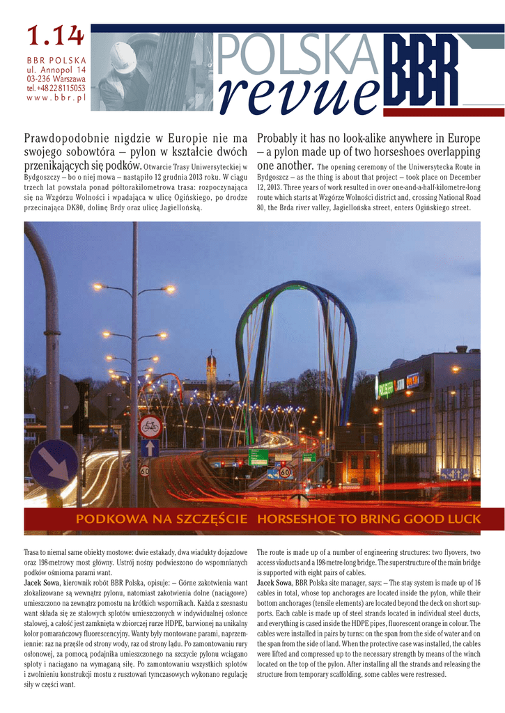 1.14 B B R P O L S K A ul. Annopol 14 03-236 Warszawa tel. +48 22 8115053 www.bbr.pl POLSKA revue Prawdopodobnie nigdzie w Europie nie ma Probably it has no look-alike anywhere in Europe swojego sobowtóra — pylon w kształcie dwóch — a pylon made up of two horseshoes overlapping przenikających się podków. Otwarcie Trasy Uniwersyteckiej w one another. The opening ceremony of the Uniwersytecka Route in Bydgoszczy — bo o niej mowa — nastąpiło 12 grudnia 2013 roku. W ciągu trzech lat powstała ponad półtorakilometrowa trasa: rozpoczynająca się na Wzgórzu Wolności i wpadająca w ulicę Ogińskiego, po drodze przecinająca DK80, dolinę Brdy oraz ulicę Jagiellońską. Bydgoszcz — as the thing is about that project — took place on December 12, 2013. Three years of work resulted in over one-and-a-half-kilometre-long route which starts at Wzgórze Wolności district and, crossing National Road 80, the Brda river valley, Jagiellońska street, enters Ogińskiego street. podkowa na szczęście Horseshoe to bring good luck Trasa to niemal same obiekty mostowe: dwie estakady, dwa wiadukty dojazdowe oraz 198-metrowy most główny. Ustrój nośny podwieszono do wspomnianych podków ośmioma parami want. Jacek Sowa, kierownik robót BBR Polska, opisuje: — Górne zakotwienia want zlokalizowane są wewnątrz pylonu, natomiast zakotwienia dolne (naciągowe) umieszczono na zewnątrz pomostu na krótkich wspornikach. Każda z szesnastu want składa się ze stalowych splotów umieszczonych w indywidualnej osłonce stalowej, a całość jest zamknięta w zbiorczej rurze HDPE, barwionej na unikalny kolor pomarańczowy fluorescencyjny. Wanty były montowane parami, naprzemiennie: raz na przęśle od strony wody, raz od strony lądu. Po zamontowaniu rury osłonowej, za pomocą podajnika umieszczonego na szczycie pylonu wciągano sploty i naciągano na wymaganą siłę. Po zamontowaniu wszystkich splotów i zwolnieniu konstrukcji mostu z rusztowań tymczasowych wykonano regulację siły w części want. The route is made up of a number of engineering structures: two flyovers, two access viaducts and a 198-metre-long bridge. The superstructure of the main bridge is supported with eight pairs of cables. Jacek Sowa, BBR Polska site manager, says: — The stay system is made up of 16 cables in total, whose top anchorages are located inside the pylon, while their bottom anchorages (tensile elements) are located beyond the deck on short supports. Each cable is made up of steel strands located in individual steel ducts, and everything is cased inside the HDPE pipes, fluorescent orange in colour. The cables were installed in pairs by turns: on the span from the side of water and on the span from the side of land. When the protective case was installed, the cables were lifted and compressed up to the necessary strength by means of the winch located on the top of the pylon. After installing all the strands and releasing the structure from temporary scaffolding, some cables were restressed. Do naszych zadań należało także sprężenie konstrukcji pozostałych obiektów. Odbywało się ono etapowo, wewnątrz skrzynki mostu, co przy operowaniu największym typem prasy BBR ważącej ponad tonę nie było łatwe. Ponadto BBR Polska dostarczyła i wbudowała 10 sztuk wielomodułowych urządzeń dylatacyjnych, wyposażonych w nakładki wyciszające. Prace związane z realizacją sprężania na estakadach rozpoczęły się w sierpniu 2011 roku, zakończenie prac na kontrakcie przypadło na listopad 2013 roku. s u m m a r y zestawienie ciężar wbudowanej stali sprężającej: 444 t kable: 19-, 25- i 31-splotowe urządzenia dylatacyjne: 10 szt. 2-, 3- i 4-modułowych liczba want: 16 liczba splotów w pojedynczej wancie: 72—109 długość want: 52—109 m łączna długość wbudowanych splotów: 109 905 m łączny ciężar wbudowanej stali: 143 t montaż podwieszenia: 28 dni liczba pracowników BBR Polska: 15 osób (max. 17) wartość kontraktu BBR Polska: 8 290 000 PLN netto weight of prestressing steel: 444 t tendons: 19, 25 and 31 strands 10 items of 2, 3 and 4-modular expansion joints number of cables: 16 number of strands in a single cable: 72—109 length of cables: 52—109 m total length of strands: 109 905 m total weight of steel: 143 t installation: 28 days number of the BBR workers on site: 15 people (max. 17) value of the BBR Polska contract: 8 290 000 PLN Our task also included prestressing the other structures. Prestressing was carried out in stages, inside the box of the bridge, which was not easy considering the size of our largest jack weighing over one tonne. Furthermore, the BBR Polska supplied and installed 10 items of modular expansion joints with “sinus plates”. Stressing the flyover structures started in August 2011, work within the contract was completed in November 2013. Inwestor|Owner: ZDMiKP Bydgoszcz, Projekt|Design: Transprojekt Gdański Sp. z o.o. Wykonawca — konsorcjum|Contractor — consortium: Mosty-Łódź SA (lider|leader), Firma Gotowski BKiP Sp. z o.o., PBDiM Kobylarnia SA Inwestor|Owner: Dom Development SA Architekt|Architect: mąka. sojka. architekci Sp. z o.o. Sp. Komandytowa Żoliborz Artystyczny Ciekawy to pomysł, by na patronów nowego warszawskiego osiedla mieszkaniowego Żoliborz wybrać polskich artystów — są wśród nich aktorka, piosenkarz, reżyser, malarka i rzeźbiarz. Nazwa dzielnicy implikuje też jej charakter: skwery, zieleń, a w budynkach przestronne hole i windy. Jeden z elementów wizji architekta mógł zostać zrealizowany dzięki technologii BBR — w budynku mieszkalnym przewidziano balkony wspornikowe o długości do 4,6 m; konstrukcja tylko z żelbetu jest w takim przypadku nieekonomiczna. Zespół BBR Polska wszedł w projekt jeszcze na etapie koncepcji, dlatego możliwe było zaproponowanie takiego rozwiązania, które pozwoliło wizję architekta ekonomicznie zrealizować — płyty balkonowe sprężone kablami bez przycze