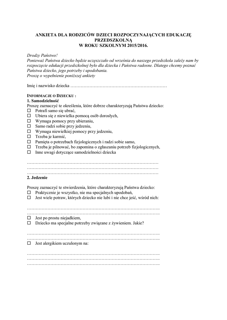 ANKIETA DLA RODZICÓW DZIECI ROZPOCZYNAJĄCYCH EDUKACJĘ PRZEDSZKOLNĄ W ROKU SZKOLNYM 2015/2016. Drodzy Państwo! Ponieważ Państwa dziecko będzie uczęszczało od września do naszego przedszkola zależy nam by rozpoczęcie edukacji przedszkolnej było dla dziecka i Państwa radosne. Dlatego chcemy poznać Państwa dziecko, jego potrzeby i upodobania. Proszę o wypełnienie poniższej ankiety Imię i nazwisko dziecka ………………………………………………………… INFORMACJE O DZIECKU : 1. Samodzielność Proszę zaznaczyć te określenia, które dobrze charakteryzują Państwa dziecko: Potrafi samo się ubrać, Ubiera się z niewielka pomocą osób dorosłych, Wymaga pomocy przy ubieraniu, Samo radzi sobie przy jedzeniu, Wymaga niewielkiej pomocy przy jedzeniu, Trzeba je karmić, Pamięta o potrzebach fizjologicznych i radzi sobie samo, Trzeba je pilnować, bo zapomina o zgłaszaniu potrzeb fizjologicznych, Inne uwagi dotyczące samodzielności dziecka ……………………………………………………………………………… ……………………………………………………………………………… ……………………………………………………………………………… 2. Jedzenie Proszę zaznaczyć te stwierdzenia, które charakteryzują Państwa dziecko: Praktycznie je wszystko, nie ma specjalnych upodobań, Jest wiele potraw, których dziecko nie lubi i nie chce jeść, wśród nich: ………………………………………………………………………………. ………………………………………………………………………………. Jest po prostu niejadkiem, Dziecko ma specjalne potrzeby związane z żywieniem. Jakie? ………………………………………………………………………………. ………………………………………………………………………………. Jest alergikiem uczulonym na: ………………………………………………………………………………. ………………………………………………………………………………. ………………………………………………………………………………. 3. Odpoczynek / relaks Proszę zaznaczyć te określenia, które dobrze charakteryzują Państwa dziecko: Jest przyzwyczajone do odpoczynku po obiedzie, zasypia bez kłopotów, Trzeba je nakłaniać do odpoczynku, zasypia z trudnością, Nie ma potrzeby, nie odpoczywa po obiedzie, Zachowuje się jeszcze inaczej, jak? ……………………………………………………………………………………….……………… ………………………………………………………………………. 4. Ulubione zabawki i zabawy mojego dziecka: ………………………………………………………………………………………. ………………………………………………………………………………………. 5. Ulubiony rodzaj książek mojego dziecka to: ………………………………………………………………………………………. ………………………………………………………………………………………. 6. Uzdolnienia i zainteresowania Proszę zaznaczyć te określenia, które dobrze charakteryzują Państwa dziecko: Wykazuje uzdolnienia w kierunku: ……………………………………………………………………………………………………… ……………………………………………………………………… Bardzo interesuje się: ……………………………………………………………………………………… ……………………………………………………………………………………… Bardzo lubi (np. grać, śpiewać…): ……………………………………………………………………………………… ……………………………………………………………………………………… 7. Inne informacje o dziecku Uprzejmie proszę o przekazanie tych informacji o dziecku, które uznacie Państwo za ważne: ……………………………………………………………………………………….. ……………………………………………………………………………………….. ……………………………………………………………………………………….. ……………………………………………………………………………………….. ……………………………………………………………………………………….. 8. Jakie są Państwa oczekiwania w stosunku do Przedszkola? ……………………………………………………………………………………….. ……………………………………………………………………………………….. ……………………………………………………………………………………….. ……………………………………………………………………………………….. Dziękujemy za wypełnienie ankiety
