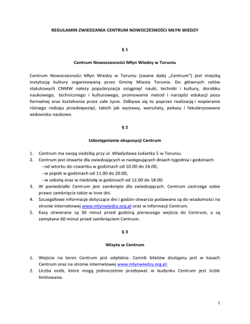 REGULAMIN ZWIEDZANIA CENTRUM NOWOCZESNOŚCI MŁYN WIEDZY §1 Centrum Nowoczesności Młyn Wiedzy w Toruniu Centrum Nowoczesności Młyn Wiedzy w Toruniu (zwane dalej „Centrum”) jest miejską instytucją kultury organizowaną przez Gminę Miasta Torunia. Do głównych celów statutowych CNMW należy popularyzacja osiągnięć nauki, techniki i kultury, dorobku naukowego, technicznego i kulturowego, promowanie metod i narzędzi edukacji poza formalnej oraz kształcenia przez całe życie. Odbywa się to poprzez realizację i wspieranie różnego rodzaju przedsięwzięć, takich jak wystawy, warsztaty, pokazy i fabularyzowane widowiska naukowe. §2 Udostępnianie ekspozycji Centrum 1. 2. 3. 4. 5. Centrum ma swoją siedzibę przy ul. Władysława Łokietka 5 w Toruniu. Centrum jest otwarte dla zwiedzających w następujących dniach tygodnia i godzinach: od wtorku do czwartku w godzinach od 10.00 do 16.00, w piątek w godzinach od 11.00 do 20.00, w sobotę oraz w niedzielę w godzinach od 12.00 do 18.00. W poniedziałki Centrum jest zamknięte dla zwiedzających. Centrum zastrzega sobie prawo zamknięcia także w inne dni. Szczegółowe informacje dotyczące dni i godzin otwarcia podawane są do wiadomości na stronie internetowej www.mlynwiedzy.org.pl oraz w informacji Centrum. Kasy otwierane są 30 minut przed godziną pierwszego wejścia do Centrum, a są zamykane 60 minut przed zamknięciem Centrum. §3 Wizyta w Centrum 1. 2. Wejście na teren Centrum jest odpłatne. Cennik biletów dostępny jest w kasach Centrum oraz na stronie internetowej www.mlynwiedzy.org.pl. Liczba osób, które mogą jednocześnie przebywać w budynku Centrum jest ściśle limitowana. 1 §4 Zasady przebywania zwiedzających na terenie Centrum W trosce o bezpieczeństwo osób przebywających na terenie Centrum Nowoczesności Młyn Wiedzy w Toruniu przy ul. Władysława Łokietka 5, a także w celu zachowania porządku Dyrekcja Centrum prosi o przestrzeganie następujących zasad: 1. 2. 3. 4. 5. 6. 7. 8. 9. 10. 11. 12. 13. 14. Dzieci poniżej 13 roku życia nie mogą przebywać na terenie Centrum bez opieki osoby dorosłej. Plecaki, duże torby oraz okrycia wierzchnie należy zostawić w szatni. Szatnia jest otwierana na pół godziny przed godziną pierwszego wejścia do Centrum i czynna do momentu wyjścia ostatniego zwiedzającego. Regulamin obsługi szatni stanowi załącznik nr 1 do niniejszego dokumentu. Korzystanie z szatni jest bezpłatne. Za rzeczy wartościowe i delikatne pozostawione w szatni Centrum nie ponosi odpowiedzialności. Wejście na wystawy jest jednorazowe. Po przekroczeniu bramek wyjścia nie ma możliwości wejścia do Centrum ponownie w ramach tego samego biletu. Osoby wchodzące na teren Centrum przyjmują do wiadomości, że wstęp jest jednoznaczny z udzieleniem zgody na nieodpłatne nagrywanie, fotografowanie, filmowanie lub dokonywanie innego rodzaju zapisu ich wizerunku oraz osób znajdujących się pod ich opieką w związku z wizytą w Centrum oraz na transmitowanie, rozpowszechnianie lub pokazywanie tego wizerunku i głosu w związku z promocją Centrum. Centrum zastrzega sobie prawo wyłączenia dostępu zwiedzających do dowolnej części terenu Centrum. Informacja o ograniczeniu dostępu, w miarę możliwości, zostanie podana do wiadomości zwiedzających w sposób umożliwiający zapoznanie się z nią przed zakupem biletu wstępu do Centrum. Zwiedzanie ekspozycji Centrum ma charakter indywidualny, zatem nie ma możliwości rezerwacji osoby oprowadzającej po Centrum. Treści użyte na wystawie służą jedynie popularyzacji nauki. Centrum zastrzega sobie prawo do wyłączenia z eksploatacji eksponatów, które uległy awarii, uszkodzeniu lub zniszczeniu. Wyłączenie części eksponatów nie stanowi podstawy do zwrotu całości lub części opłaty za bilet. Podczas zwiedzania należy stosować się do uwag i zaleceń pracowników Centrum, pracowników ochrony lub innych osób wyznaczonych przez Centrum. Ze stanowisk należy korzystać zgodnie z instrukcjami obsługi znajdującymi się przy poszczególnych eksponatach oraz zwracać uwagę na ostrzeżenia i komunikaty zamieszczone przy eksponatach. 2 15. Centrum nie ponosi odpowiedzialności za jakiekolwiek zdarzenia wynikłe z niestosowania się do zaleceń lub niewłaściwego korzystania z eksponatów. 16. Wszelkie awarie, uszkodzenia i zniszczenia wyposażenia Centrum należy niezwłocznie zgłaszać pracownikom Centrum lub pracownikom ochrony. 17. Zasady uczestnictwa w warsztatach i pokazach zawarto w regulaminach stanowiących odpowiednio załączniki nr 2 i nr 3 do niniejszego dokumentu. 18. Platforma pionowa znajdująca się przed budynkiem, przeznaczona dla osób niepełnosprawnych, obsługiwana jest przez pracownika ochrony z punktu informacyjnego. 19. Spożywanie posiłków oraz napojów wniesionych na teren Centrum dozwolone jest wyłącznie w miejscach oznaczonych tablicą „Miejsce wypoczynku” na II i IV p. budynku. 20. Osoby wychodzące z Centrum oraz ich bagaż mogą zostać poddane kontroli przez pracowników ochrony. §5 Zakazy 1. Zwiedzającym znajdującym się na terenie Centrum zakazuje się wszelkich zachowań niebezpiecznych dla innych zwiedzających oraz dla wyposażenia Centrum. W szczególności zwiedzającym zabrania się: a. wynoszenia elementów wyposażenia Centrum poza jego teren; b. przenoszenia elementów wyposażenia Centrum poza przeznaczone dla nich miejsca; c. niszczenia jakichkolwiek elementów wyposażenia Centrum; d. wprowadzania na teren Centrum zwierząt; e. wnoszenia i spożywania alkoholu, palenia tytoniu, wnoszenia i korzystania ze środków odurzających, korzystania z papierosów elektronicznych; f.wnoszenia na teren Centrum broni, materiałów wybuchowych i innych niebezpiecznych dla życia i zdrowia przedmiotów; g. wnoszenia i wprowadzania na teren Centrum rowerów, hulajnóg, deskorolek lub innych podobnych urządzeń, oraz jeżdżenia na nich; h. wnoszenia przedmiotów,