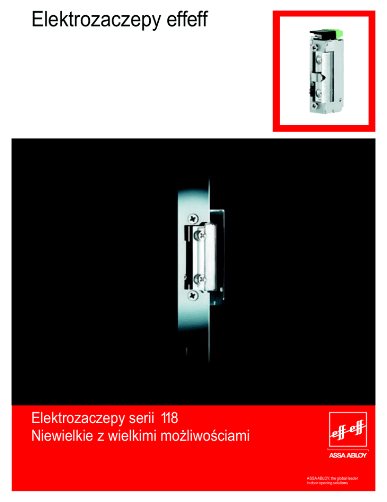 Elektrozaczepy effeff Elektrozaczepy serii 118 Niewielkie z wielkimi możliwościami ASSA ABLOY, the global leader in door opening solutions 2 Elektrozaczep 118 118 utalentowane rozwiązanie z effeff‘a Mały do wszechstronnych zastosowań Bogaty pakiet zalet dla wszelkich wymagań Najmniejszy na świecie standardowy elektrozaczep jest teraz dostępny również w systemie ProFix z 3mm regulacją FaFix. Model 118 w wersji do drzwi dymoszczelnych jest oznaczony literą S, co sprawia że jest elektrozaczepem przeznaczonym do wielu zastosowań. Rozpiętość napięcia zasilania 10 - 24 V lub 22-42 V zapewnia możliwość stosowania w różnego typu instalacjach. Niewielkie wymiary gwarantują montaż w bardzo ograniczonej przestrzeni. Dzięki temu może być montowany w ościeżnicach wykonanych z profili aluminiowych termoizolowanych bez konieczności czasochłonnego wycinania wewnętrznych komór. Dzięki zastosowaniu zapadki promieniowej w elektrozaczepie 118 konieczność podcinania ościeżnicy została zmniejszona do minimum a przy zastosowaniu z systemem ProFix podcięcie zostało zlikwidowane całkowicie. System Profix można zastosować w przypadku gdy wymiar x wynosi min. 5 mm lub więcej. Poniżej na rysunku został przedstawiony schemat elektrozaczepu z systemem ProFix. Zabudowa elektrozaczepu w systemie ProFix. Wymiar x odnosi się do odległości pomiędzy powierzchnią czołową ościeżnicy i zapadką zamka. Ościeżnica Zargenprofil Wyślizg Fallenführung zapadki zamka Skrzydło Türprofil drzwiowe wymiar x x-Maß Zapadka promieniowa Radiusfalle Zapadka zamka Schlossfalle 3 Elektrozaczep 118 1 Model 118E z mechanicznym odblokowaniem Elektrozaczep 118 do standardowych drzwi 1 Minimalne wymiary - maksymalny efekt przy zastosowaniu elektrozaczepu effeff model 118 Dzięki swoim wymiarom 66x16x25,5mm jest najmniejszym elektrozaczepem na świecie. Specjalne właściwości już w wersji standardowej zapewniają możliwość łatwego zastosowania w większości aplikacji oraz gwarantują najwyższą jakość wykonanych instalacji. 2 Model 118RRE z monitoringiem i mechanicznym odryglowaniem 3 Model 118E130 do blach zaczepowych z prowadzeniem zapadki Cechy charakterstyczne Ÿ Wymary 25.5 x 16 x 66 mm, Ÿ Dopasowany do standardowych blach zaczepowych, Ÿ dedykowany do drzwi wykonanych z profili aluminiowych, stalowych i PVC Ÿ opcjonalnie obudowa z funkcją Fix, Ÿ Zapadka radialna, funkcja FaFix, regulacja 3 mm, Ÿ Dostępny w wersji jako rewersyjny Ÿ Monitoring (opcja), wymiary 25.5 x 16 x 74 mm Ÿ Mechaniczne odblokowanie (opcja) Ÿ Napięcie zasilania 10-24 V AC/DC, praca ciągła w zakresie 11-13 V DC Ÿ Napięcie zasilania 22-42 V AC/DC, praca ciągła w zakresie do 26 V DC Ÿ Dioda przepięciowa (opcja) Ÿ Możliwość stosowania wymiennych zapadek Ÿ Kompatybilny ze standardowymi zamkami, Ÿ Kompatybilny ze standardowymi blachami zaczepowymi, jak również z blachami do profili aluminiowych i PVC, Ÿ Kompatybilny z systemem ProFix 2, Ÿ Trwałość powyżej 250 000 cykli, Ÿ Opór na wyważenie powyżej 3750 , Ÿ Obudowa symetryczna, możliwość zabudowy do drzwi lewych i prawych, Ÿ Możliwość pracy w pozycji poziomej 4 Elektrozaczep 118 Parametry techniczne elektrozaczepu model 118 Funkcje modelu 118 sprawiają, że jest on niezwykle uniwersalnym elektrozaczepem. Niewielkie wymiary zapewniają zabudowę w konstrukcjach w których nie było do tej pory takiej możliwości. Dodatkowo bogactwo różnych funkcji sprawia, że może być wszechstronnie stosowany. Dzięki temu jeśli jest potrzebny elektrozaczep z funkcjami takimi jak monitoring, mechaniczne odblokowanie, dioda przepięciowa lub rewersyjny mamy gotowe rozwiązanie w postaci modelu 118. Szeroki zakres napięcia zasilania pozwala zredukować konieczność posiadania w ofercie kilku elektrozaczepów stosowanych w różnych systemach do tego jednego modelu. Przewody do elektrozaczepu można podłączyć klasycznie poprzez przykręcenie jak również zastosowano innowacyjny sposób szybkozłączki do wpięcia przewodów zakończonych pinami. Parametry techniczne Szybkozłączka standardowe podłączenie śrubowe ze zintegrowanym systemem podłączenia przewodów przy pomocy pinów Opór na wyważenie 3750 N Wymiary 66 x 16 x 5.5 mm Zakres regulacji FaFix (skok 1 mm) 3 mm Regulacja Fix opcja Głębokość zazębienia zapadki 5.5 mm Odblokowanie przy max. nacisku dla zasilania AC (siła Preload) 200 N Zakres napięcia zasilania eE - praca ciągła pod napięciem 10 V do 24 V AC/DC, funkcja eE 11-13 V, 22 V to 42 V AC/DC, funkcja eE 22-26 V Temperatura otoczenia -15 °C do +40 °C Funkcja monitoringu opcja Max. obciążenie styków monitoringu 24V / 1 A Wymiary obudowy w opcji z monitoringiem 74 x 16 x 25.5 mm Praca w dowolnym położeniu tak Dioda przepięciowa opcja Możliwość stosowania w drzwiach p.poż. nie Min. żywotność 250.000 cykli Parametry elektryczne elektrozaczepu 118 przy 20º C A71 10-24 V B71 22-42 V E91 12 V F91 24 V Tolerancja zasilania — — +/- 10 % +/- 10 % Rezystancja nominalna 43 Ohm 200 Ohm 51 Ohm 160 Ohm Max. napięcie nominalne 12 V DC 24 V DC 12 V AC 24 V AC 280 mA 560 mA 250 mA 500 mA — 120 mA — 60 mA 235 mA — — — — 150 mA — — Preload AC 200 N 200 N — — Preload DC 50 N 50 N 30 N 30 N Parametry mechaniczne elektrozaczepu 118 5 Zestawienie funkcji Elektrozaczep 118 Nr katalogowy 10-24V AC/DC 118---------A71 • 118---------B71 118E--------A71 Fix2 • • • 118RR-------B71 118RRE------A71 Pro- • 118E--------B71 118R R-------A71 22-42V AC/DC • • 118RRE------B71 • Normalnie zamknięty • • • • • • • • • • • • • • • • • • • • 11805E------B71 • 11 8 05 RR- -- - -A7 1 • 11 8 05 RR -- - - -B 71 • • 128E--------B71 • • • • • • • • • • • • • • • • • • • • • • • • • • • • • • • • • • • • • • • • 118E.53-----A71 • • 118E. 53-----B71 • 