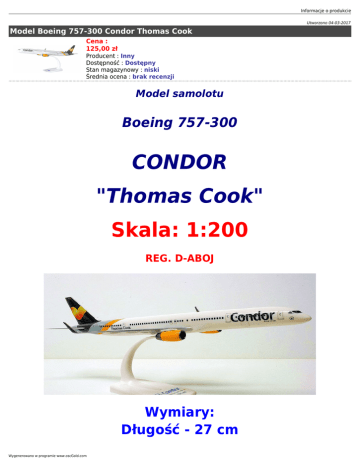 Informacje o produkcie Utworzono 04-03-2017 Model Boeing 757-300 Condor Thomas Cook Cena : 125,00 zł Producent : Inny Dostępność : Dostępny Stan magazynowy : niski Średnia ocena : brak recenzji Model samolotu Boeing 757-300 CONDOR "Thomas Cook" Skala: 1:200 REG. D-ABOJ Wymiary: Długość - 27 cm Wygenerowano w programie www.oscGold.com Rozpiętość skrzydeł - 19 cm Bardzo dobrej jakości tworzywo, kadłub z grubego plastiku, wysokiej jakości malowanie. Produkt do szybkiego i bardzo łatwego złożenia bezklejowego, składa się z kilku elementów - kwestia wpięcia w kadłub skrzydeł, stateczników i podstawki. Elementy zabezpieczone, całość opakowana w pudełko.