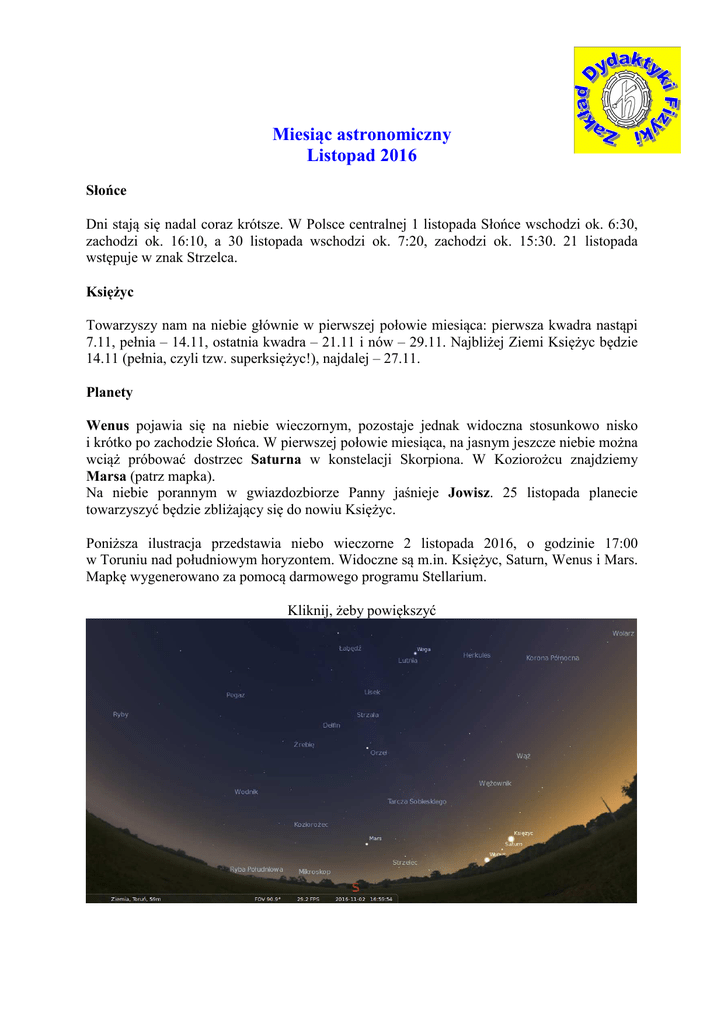 Miesiąc astronomiczny Listopad 2016 Słońce Dni stają się nadal coraz krótsze. W Polsce centralnej 1 listopada Słońce wschodzi ok. 6:30, zachodzi ok. 16:10, a 30 listopada wschodzi ok. 7:20, zachodzi ok. 15:30. 21 listopada wstępuje w znak Strzelca. Księżyc Towarzyszy nam na niebie głównie w pierwszej połowie miesiąca: pierwsza kwadra nastąpi 7.11, pełnia – 14.11, ostatnia kwadra – 21.11 i nów – 29.11. Najbliżej Ziemi Księżyc będzie 14.11 (pełnia, czyli tzw. superksiężyc!), najdalej – 27.11. Planety Wenus pojawia się na niebie wieczornym, pozostaje jednak widoczna stosunkowo nisko i krótko po zachodzie Słońca. W pierwszej połowie miesiąca, na jasnym jeszcze niebie można wciąż próbować dostrzec Saturna w konstelacji Skorpiona. W Koziorożcu znajdziemy Marsa (patrz mapka). Na niebie porannym w gwiazdozbiorze Panny jaśnieje Jowisz. 25 listopada planecie towarzyszyć będzie zbliżający się do nowiu Księżyc. Poniższa ilustracja przedstawia niebo wieczorne 2 listopada 2016, o godzinie 17:00 w Toruniu nad południowym horyzontem. Widoczne są m.in. Księżyc, Saturn, Wenus i Mars. Mapkę wygenerowano za pomocą darmowego programu Stellarium. Kliknij, żeby powiększyć