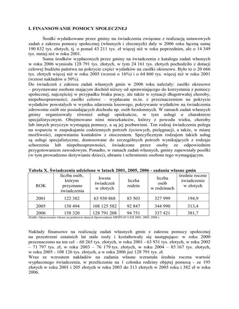 I. FINANSOWANIE POMOCY SPOŁECZNEJ Środki wydatkowane przez gminy na świadczenia związane z realizacją ustawowych zadań z zakresu pomocy społecznej (własnych i zleconych) dały w 2006 roku łączną sumę 190 832 tys. złotych, tj. o ponad 43 211 tys. zł więcej niż w roku poprzednim, ale o 14 349 tys. mniej niż w roku 2001. Suma środków wypłaconych przez gminy na świadczenia z katalogu zadań własnych w roku 2006 wyniosła 128 791 tys. złotych, w tym 24 161 tys. złotych pochodziło z dotacji celowej budżetu państwa na pokrycie części wydatków na zasiłki okresowe. Było to o 20 666 tys. złotych więcej niż w roku 2005 (wzrost o 16%) i o 64 860 tys. więcej niż w roku 2001 (wzrost nakładów o 50%). Do świadczeń z zakresu zadań własnych gmin w 2006 roku należały: zasiłki okresowe – przyznawane osobom mającym dochód niższy od uprawniającego do korzystania z pomocy społecznej, najczęściej w przypadku braku pracy, ale także w sytuacji długotrwałej choroby, niepełnosprawności; zasiłki celowe – wypłacane m.in. z przeznaczeniem na pokrycie wydatków powstałych w wyniku zdarzenia losowego, pokrywanie wydatków na świadczenia zdrowotne osób nie posiadających dochodu np. osób bezdomnych. W ramach zadań własnych gminy organizowały również usługi opiekuńcze, w tym usługi o charakterze specjalistycznym. Obejmowano nimi mieszkańców, którzy z powodu wieku, choroby lub innych przyczyn wymagają pomocy, a są jej pozbawieni. Ten rodzaj świadczenia polega na wsparciu w zaspokajaniu codziennych potrzeb życiowych, pielęgnacji, a także, w miarę możliwości, zapewnianiu kontaktów z otoczeniem. Specyficznym rodzajem takich usług są usługi specjalistyczne, dostosowane do szczególnych potrzeb wynikających z rodzaju schorzenia lub niepełnosprawności, świadczone przez osoby ze odpowiednim przygotowaniem zawodowym. Ponadto, w ramach zadań własnych, gminy zapewniały posiłki (w tym prowadzono dożywianie dzieci), ubranie i schronienie osobom tego wymagającym. Tabela X. Świadczenia udzielone w latach 2001, 2005, 2006 - zadania własne gmin liczba osób, średnie roczne kwota liczba którym liczba świadczenie świadczeń osób ROK przyznano rodzin w złotych w złotych w rodzinach świadczenia 2001 122 382 63 930 868 83 503 327 999 194,9 2005 158 494 108 125 582 92 847 344 990 313,4 2006 158 320 128 791 208 94 751 337 421 381,7 Źródło: Opracowanie własne na podstawie danych Sprawozdania MPiPS-03 I-XII 2001, 2005, 2006 r. Nakłady finansowe na realizację zadań własnych gmin z zakresu pomocy społecznej na przestrzeni ostatnich lat stale rosły i kształtowały się następująco: w roku 2000 przeznaczono na ten cel – 60 265 tys. złotych, w roku 2001 - 63 931 tys. złotych, w roku 2002 – 71 797 tys. zł, w roku 2003 – 76 179 tys. złotych, w roku 2004 – 85 167 tys. złotych, w roku 2005 - 108 126 tys. złotych, a w roku 2006 już 128 791 tys. zł. Wraz ze wzrostem nakładów na zadania własne wzrastała średnia roczna wartość wypłaconego świadczenia, w przeliczeniu na 1 członka rodziny objętej pomocą - ze 195 złotych w roku 2001 i 205 złotych w roku 2003 do 313 złotych w 2005 roku i 382 zł w roku 2006. Ze świadczeń tych skorzystało w 2001 roku 327 999 osób (liczba osób w rodzinach objętych pomocą), w roku 2003 - 372 233 osoby, w roku 2005 - 344 990 osób, a roku 2006 – 337 421 osób tj. od 83 do blisko 95 tysięcy małopolskich rodzin. Wykres X. Środki finansowe na zadania własne gmin z zakresu pomocy społecznej 140 120 w mln. zł 100 80 60 40 20 0 2000 2001 2002 2003 2004 2005 2006 lata Źródło: Opracowanie własne na podstawie danych Sprawozdania MPiPS-03 I-XII 2000, 2001, 2002, 2003, 2004, 2005, 2006 r. Do świadczeń będących zadaniami administracji rządowej zlecanymi gminom należały w 2006 roku zasiłki stałe dla osób całkowicie niezdolnych do pracy z powodu wieku lub niepełnosprawności, o odpowiednio niskich dochodach oraz specjalistyczne usługi opiekuńcze, świadczone osobom psychicznie chorym. W ramach realizacji zadań zleconych udzielono także blisko 20 tysięcy zasiłków na pokrycie wydatków związanych z klęską żywiołową. Koszt realizacji w/w zadań zleconych gminom wyniósł w 2006 roku 62 041 tys. złotych. W związku z koniecznością wypłacenia wspomnianych zasiłków celowych była to kwota większa o 22 546 tys. złotych niż w roku poprzednim, ale mniejsza o 79 210 tys. w porównaniu do roku 2001, a także znacznie niższa niż w latach 2002 i 2003, kiedy to nakłady na te zadania (obejmujące znacznie więcej form pomocy) były zdecydowanie wyższe. Tabela X. Świadczenia udzielone w latach 2001, 2005, 2006 - zadania zlecone gminom liczba osób, średnie roczne kwota liczba którym liczba świadczenie świadczeń osób ROK przyznano rodzin w złotych w złotych w rodzinach świadczenia 2001 51 882 141 250 499 50 647 178 755 790,2 2005 12 794 39 494 881 12 644 23 844 1 656,4 2006 32 122 62 040 799 14 156 27 375 2 266,3 Źródło: Opracowanie własne na podstawie danych Sprawozdania MPiPS-03 I-XII 2001, 2005, 2006 r. W przeliczeniu na 1 członka rodziny objętej pomocą, w 2006 roku na średnie, roczne świadczenie z zakresu zadań zleconych wydano więcej niż w latach poprzednich tj. przeciętnie 2 266 złotych. W porównaniu z poprzednimi latami daje to – o 610 zł więcej niż w roku poprzednim i o blisko 1 500 złotych więcej niż w roku 2001. Przeciętne roczne świadczenie w roku 2001 wyniosło 790 złotych, w roku 2005 – 1 656. Wykres X. Środki finansowe na zadania z zakresu pomocy społecznej zlecone gminom 160 140 w mln. zł 120 100 80 60 40 20 0 2000 2001 2002 2003 2004 2005 2006 lata Źródło: Opracowanie własne na podstawie danych Sprawozdania MPiPS-03 I-XII 2000, 2001, 2002, 2003, 2004, 2005, 2006 r. Świadczeniami wypłacanymi w ramach zadań zleconych gminom w latach 2005 - 2006 objęto kilkanaście tysięcy małopolskich rodzin 