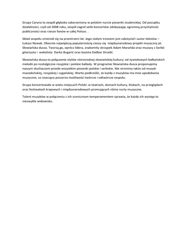 Grupa Caryna to zespół głęboko zakorzeniony w polskim nurcie piosenki studenckiej. Od początku działalności, czyli od 2008 roku, zespół zagrał setki koncertów zdobywając ogromną przychylnośd publiczności oraz rzesze fanów w całej Polsce. . Skład zespołu zmieniał się na przestrzeni lat. Jego stałym trzonem jest założyciel i autor tekstów – Łukasz Nowak. Obecnie największą popularnością cieszy się międzynarodowy projekt muzyczny pt. Słowiaoska dusza. Tworzą go, oprócz lidera, znakomity skrzypek Adam Maraoda oraz muzycy z Serbii: gitarzysta i wokalista Darko Bugarid oraz basista Dalibor Drcelid. Słowiaoska dusza to połączenie stylów różnorodnej słowiaoskiej kultury; od żywiołowych bałkaoskich melodii po nostalgiczne rosyjskie i polskie ballady. W programie Słowiaoska dusza proponujemy naszym słuchaczom przede wszystkim piosenki polskie i serbskie. Nie stronimy także od muzyki macedooskiej, rosyjskiej i cygaoskiej. Warto podkreślid, że każdy z muzyków ma inne upodobania muzyczne, co znacząco poszerza możliwości twórcze i odtwórcze zespołu. Grupa koncertowała w wielu miejscach Polski: w teatrach, domach kultury, klubach, na przeglądach oraz festiwalach krajowych i międzynarodowych promujących różne nurty muzyczne. Talent muzyków w połączeniu z ich scenicznym temperamentem sprawia, że każdy ich występ to niezwykłe widowisko.
