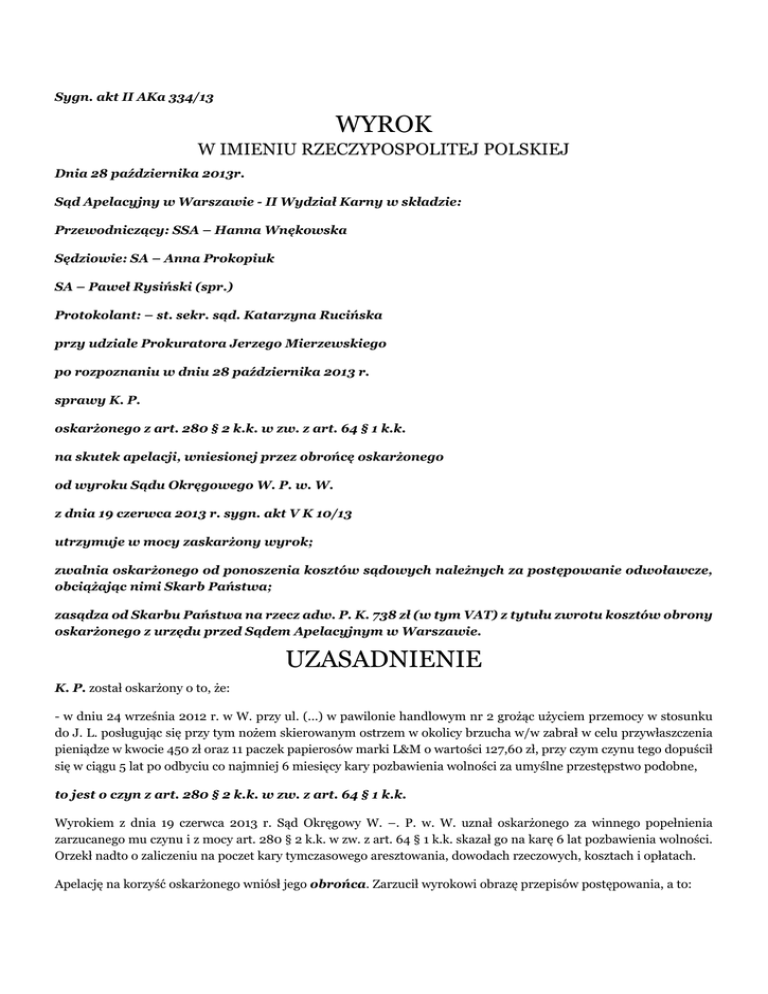 Sygn. akt II AKa 334/13 WYROK W IMIENIU RZECZYPOSPOLITEJ POLSKIEJ Dnia 28 października 2013r. Sąd Apelacyjny w Warszawie - II Wydział Karny w składzie: Przewodniczący: SSA – Hanna Wnękowska Sędziowie: SA – Anna Prokopiuk SA – Paweł Rysiński (spr.) Protokolant: – st. sekr. sąd. Katarzyna Rucińska przy udziale Prokuratora Jerzego Mierzewskiego po rozpoznaniu w dniu 28 października 2013 r. sprawy K. P. oskarżonego z art. 280 § 2 k.k. w zw. z art. 64 § 1 k.k. na skutek apelacji, wniesionej przez obrońcę oskarżonego od wyroku Sądu Okręgowego W. P. w. W. z dnia 19 czerwca 2013 r. sygn. akt V K 10/13 utrzymuje w mocy zaskarżony wyrok; zwalnia oskarżonego od ponoszenia kosztów sądowych należnych za postępowanie odwoławcze, obciążając nimi Skarb Państwa; zasądza od Skarbu Państwa na rzecz adw. P. K. 738 zł (w tym VAT) z tytułu zwrotu kosztów obrony oskarżonego z urzędu przed Sądem Apelacyjnym w Warszawie. UZASADNIENIE K. P. został oskarżony o to, że: - w dniu 24 września 2012 r. w W. przy ul. (...) w pawilonie handlowym nr 2 grożąc użyciem przemocy w stosunku do J. L. posługując się przy tym nożem skierowanym ostrzem w okolicy brzucha w/w zabrał w celu przywłaszczenia pieniądze w kwocie 450 zł oraz 11 paczek papierosów marki L&M o wartości 127,60 zł, przy czym czynu tego dopuścił się w ciągu 5 lat po odbyciu co najmniej 6 miesięcy kary pozbawienia wolności za umyślne przestępstwo podobne, to jest o czyn z art. 280 § 2 k.k. w zw. z art. 64 § 1 k.k. Wyrokiem z dnia 19 czerwca 2013 r. Sąd Okręgowy W. –. P. w. W. uznał oskarżonego za winnego popełnienia zarzucanego mu czynu i z mocy art. 280 § 2 k.k. w zw. z art. 64 § 1 k.k. skazał go na karę 6 lat pozbawienia wolności. Orzekł nadto o zaliczeniu na poczet kary tymczasowego aresztowania, dowodach rzeczowych, kosztach i opłatach. Apelację na korzyść oskarżonego wniósł jego obrońca. Zarzucił wyrokowi obrazę przepisów postępowania, a to: 1. naruszenie art. 410 k.p.k. poprzez pominięcie okoliczności wykluczających sprawstwo oskarżonego, tj.: a) okoliczności, iż nóż znaleziony przy oskarżonym wygląda odmiennie od noża, który opisała pokrzywdzona, b) okoliczności, iż pokrzywdzona nie widziała na rękach napastnika blizn, które to blizny są znakiem szczególnym oskarżonego, c) okoliczności, iż pokrzywdzona w toku postępowania sądowego zeznawała odmiennie niż w postępowaniu przygotowawczym, co do słów, jakie miał wypowiedzieć do niej oskarżony, d) nieuwzględnieniu okoliczności, iż oskarżony, zgodnie ze złożonymi przez niego wyjaśnieniami, nie posiadał czarnego plecaka z przekładaną klapką, ani takiego plecaka przy oskarżonym nie znaleziono, a który miała posiadać osoba dokonująca rozboju, 2. naruszenie art. 7 k.p.k. poprzez nienależyte rozważenie okoliczności wykluczających sprawstwo oskarżonego, tj.: e) niezasadne usprawiedliwianie niewłaściwego określenia koloru włosów sprawcy przez pokrzywdzoną, f) uznania za nieistotne dla sprawy okoliczności podniesionych w uzasadnieniu postanowienia o umorzeniu śledztwa prowadzonego przez Prokuraturę Rejonową W.-Ż. w W. w sprawie o sygn. akt 1 Ds. 625/11/II, z których wynika, iż rozbojów tego typu dokonuje mężczyzna bardzo podobny do oskarżonego; g) uznania za nieistotne dla sprawy okoliczności, że zgodnie z zeznaniami świadka P. P. i wyjaśnieniami oskarżonego, oskarżony nie posiadał ani nie użytkował roweru, zatem nie jest prawdopodobnym, aby pokrzywdzona mogła widzieć oskarżonego odjeżdżającego z miejsca zdarzenia rowerem, h) odmowie nadania waloru wiarygodności zeznaniom P. P., zgodnie z którymi w dniu zdarzenia oskarżony przebywał cały czas w domu, a które to zeznania są spójne z wyjaśnieniami oskarżonego; 3. naruszenie art. 391 § 1 k.p.k. wobec zaniechania wezwania pokrzywdzonej do wyjaśnienia rozbieżności pomiędzy zeznaniami złożonymi w postępowaniu przygotowawczym, a zeznaniami złożonymi w postępowaniu sądowym co do: a) wielkości noża, jakim posługiwać się miał sprawca zdarzenia, b) słów, jakie sprawca miał wypowiedzieć do pokrzywdzonej. Nadto zarzucił wyrokowi rażącą niewspółmierność orzeczonej kary pozbawienia wolności. W konkluzji wniósł o uniewinnienie oskarżonego, ewentualnie o zmianę zaskarżonego orzeczenia i obniżenie wymierzonej mu kary pozbawienia wolności. Sąd Apelacyjny zważył, co następuje: Zarzuty apelacji okazały się bezzasadne, dlatego nie mogły być uwzględnione jej wnioski, a zaskarżony wyrok, jako trafny, należało utrzymać w mocy. Istota sprawy sprowadza się do ustalenia czy pokrzywdzona prawidłowo i obiektywnie trafnie rozpoznała w oskarżonym sprawcę napadu rabunkowego, dokonanego na niej w dniu 24 września 2012 r. W sprawie brak bowiem innych – poza pokrzywdzoną – świadków przedmiotowego zdarzenia, nie zgromadzono też innych pozaosobowych dowodów wskazujących na oskarżonego – np. zapisu monitoringu, śladów biologicznych pozostawionych przez sprawcę, itp. Apelacja obrońcy tylko w pkt 2e podniosła te kwestie zarzucając Sądowi naruszenie art. 7 k.p.k. przez „niezasadne usprawiedliwienie” niewłaściwego określenia koloru włosów sprawcy przez pokrzywdzoną, która podała, że napastnik był ciemnym blondynem. Zdaniem skarżącego wyklucza to sprawstwo oskarżonego, który jest kruczoczarny (k. 5 apelacji). Tak formułowany zarzut nie mógł być podzielony. Skarżący pomija bowiem inne elementy wyglądu napastnika, które podała pokrzywdzona, a które pozostają w zgodzie z jego sylwetką. I tak składając zawiadomienie o przestępstwie (k. 4 akt) pokrzywdzona precyzyjnie opisała napastnika jako wysokiego, szczupłego, ponad 180 cm wzrostu, w wieku ok. 30 lat, o bardzo bladej twarzy – pociągłej, mętnych oczach przypominających narkomana. Ten opis odpowiada wyglądowi oskarżonego, zgadza się również podany przez