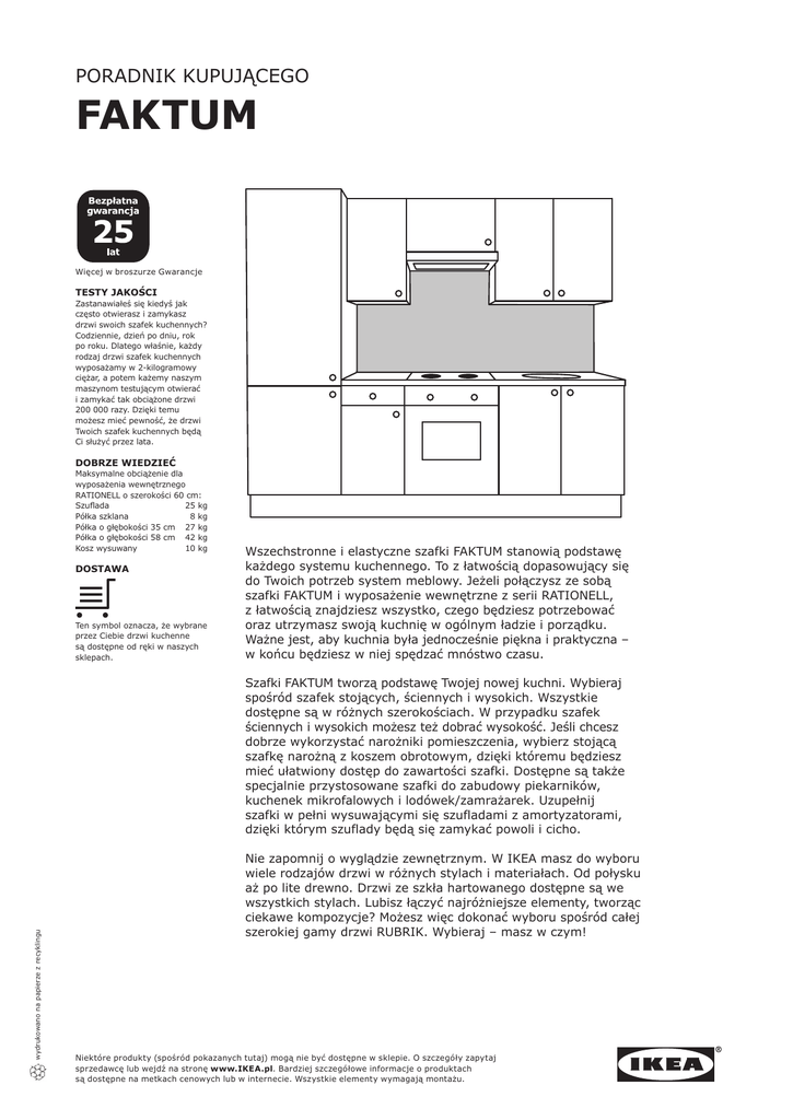 PORADNIK KUPUJĄCEGO FAKTUM Więcej w broszurze Gwarancje TESTY JAKOŚCI Zastanawiałeś się kiedyś jak często otwierasz i zamykasz drzwi swoich szafek kuchennych? Codziennie, dzień po dniu, rok po roku. Dlatego właśnie, każdy rodzaj drzwi szafek kuchennych wyposażamy w 2-kilogramowy ciężar, a potem każemy naszym maszynom testującym otwierać i zamykać tak obciążone drzwi 200 000 razy. Dzięki temu możesz mieć pewność, że drzwi Twoich szafek kuchennych będą Ci służyć przez lata. DOBRZE WIEDZIEĆ Maksymalne obciążenie dla wyposażenia wewnętrznego RATIONELL o szerokości 60 cm: Szuflada 25 kg Półka szklana 8 kg Półka o głębokości 35 cm 27 kg Półka o głębokości 58 cm 42 kg Kosz wysuwany 10 kg DOSTAWA Ten symbol oznacza, że wybrane przez Ciebie drzwi kuchenne są dostępne od ręki w naszych sklepach. Wszechstronne i elastyczne szafki FAKTUM stanowią podstawę każdego systemu kuchennego. To z łatwością dopasowujący się do Twoich potrzeb system meblowy. Jeżeli połączysz ze sobą szafki FAKTUM i wyposażenie wewnętrzne z serii RATIONELL, z łatwością znajdziesz wszystko, czego będziesz potrzebować oraz utrzymasz swoją kuchnię w ogólnym ładzie i porządku. Ważne jest, aby kuchnia była jednocześnie piękna i praktyczna – w końcu będziesz w niej spędzać mnóstwo czasu. wydrukowano na papierze z recyklingu Szafki FAKTUM tworzą podstawę Twojej nowej kuchni. Wybieraj spośród szafek stojących, ściennych i wysokich. Wszystkie dostępne są w różnych szerokościach. W przypadku szafek ściennych i wysokich możesz też dobrać wysokość. Jeśli chcesz dobrze wykorzystać narożniki pomieszczenia, wybierz stojącą szafkę narożną z koszem obrotowym, dzięki któremu będziesz mieć ułatwiony dostęp do zawartości szafki. Dostępne są także specjalnie przystosowane szafki do zabudowy piekarników, kuchenek mikrofalowych i lodówek/zamrażarek. Uzupełnij szafki w pełni wysuwającymi się szufladami z amortyzatorami, dzięki którym szuflady będą się zamykać powoli i cicho. Nie zapomnij o wyglądzie zewnętrznym. W IKEA masz do wyboru wiele rodzajów drzwi w różnych stylach i materiałach. Od połysku aż po lite drewno. Drzwi ze szkła hartowanego dostępne są we wszystkich stylach. Lubisz łączyć najróżniejsze elementy, tworząc ciekawe kompozycje? Możesz więc dokonać wyboru spośród całej szerokiej gamy drzwi RUBRIK. Wybieraj – masz w czym! Niektóre produkty (spośród pokazanych tutaj) mogą nie być dostępne w sklepie. O szczegóły zapytaj sprzedawcę lub wejdź na stronę www.IKEA.pl. Bardziej szczegółowe informacje o produktach są dostępne na metkach cenowych lub w internecie. Wszystkie elementy wymagają montażu. DOBRZE WIEDZIEĆ 7 5 6 2 3 4 1 1. Przyjemniejsze gotowanie Jeśli umieścisz głębokie szuflady RATIONELL blisko swojej kuchenki, będziesz mieć przyprawy, olej, makaron i akcesoria w zasięgu ręki podczas gotowania. Wszystko będzie łatwo przejrzeć, znaleźć i wyciągnąć – nawet rzeczy znajdujące się z tyłu szuflady. 5. Wykorzystaj ściany Potrzebujesz więcej przestrzeni do pracy w swojej kuchni? Zastanów się nad serią akcesoriów ściennych do powieszenia nad blatem kuchennym. Zmieścisz tutaj wszystko; od akcesoriów do mycia naczyń po pojemnik na sztućce i akcesoria kuchenne. Będziesz mieć wszystko w zasięgu ręki – gotowe w razie potrzeby. 2. Łatwy dostęp – z obu stron. Korzyści z posiadania wysokich szafek z wysuwanymi do końca szufladami; dobry przegląd zawartości, możliwość dostania się do nich z obu stron oraz posiadanie produktów, takich jak mąka czy cukier w zasięgu ręki podczas gotowania. 6. Ułatwij sobie nakrywanie do stołu Pojemne, wysuwane do końca szuflady pomieszczą Twoje sztućce, talerze, serwetki oraz miski. Wszystko, czego potrzebujesz, aby nakryć do stołu. Jeśli umieścisz szuflady w stojącej szafce, blisko stołu, nakrywanie stanie się dużo łatwiejsze i przyjemniejsze. 3. Wykorzystaj narożniki Pojemnik obrotowy do szafki narożnej RATIONELL pomoże Ci wykorzystać w pełni przestrzeń narożników. Ponieważ półki są regulowane, idealnie nadają się do przechowywania patelni i garnków, a obrotowa konstrukcja ułatwia dostęp do wszystkich składowanych na półkach akcesoriów. 7. Uporządkuj szafki wiszące Chcesz uporządkować wnętrze swoich szafek wiszących? Przyjrzyj się więc serii do przechowywania VARIERA. Wraz z regulowanymi półkami RATIONELL, pomogą Ci lepiej zorganizować przestrzeń w szafce. 4. Segreguj odpadki pod zlewem Kosze do segregowania odpadów z serii RATIONELL najlepiej umieścić pod zlewem, ponieważ to właśnie tutaj będziesz zmywać naczynia oraz obierać warzywa i owoce. Ułatwisz sobie segregację, jeśli umieścisz kosze na wysuwanej tacy. 2 JAK ZBUDOWAĆ KUCHNIĘ Czego potrzebujesz w swojej kuchni? Wypisz funkcje, jakie wydają Ci się ważne, np. ile powierzchni blatu lub ile miejsca do przechowywania będzie Ci potrzebne. Może zakupy łatwiej jest wyjmować z szuflad umieszczonych na wygodnej wysokości niż z szafek wysokich? Przemyśl to dobrze. W ten sposób ułatwisz sobie wybór odpowiedniego zestawu szafek. Stworzą one podstawę Twojej nowej kuchni. Następnym krokiem będzie dobranie do nich funkcjonalnego wyposażenia wewnętrznego z asortymentu RATIONELL, czyli gładko wysuwających się szuflad, koszy drucianych, regulowanych półek, itp. Jak chcesz, aby wyglądała Twoja nowa kuchnia? Łatwiej i przyjemniej jest samemu stworzyć własną kombinację drzwi, frontów szuflad, blatów, sprzętów AGD, gałek i uchwytów. W IKEA masz naprawdę duży wybór poszczególnych elementów. Większość drzwi dostępna jest także w wersjach szklanych. Możesz nadać swojej kuchni niepowtarzalny charakter, dzięki drzwiom z serii RUBRIK wykonanym z różnych materiałów i w różnych kolorach. Wybierając blat, zastanów się czy wolisz, aby pasował do r