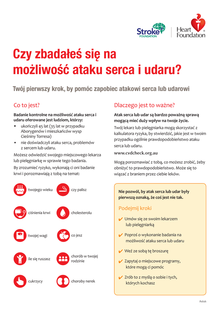 Czy zbadałeś się na możliwość ataku serca i udaru? Twój pierwszy krok, by pomóc zapobiec atakowi serca lub udarowi Co to jest? Dlaczego jest to ważne? Badanie kontrolne na możliwość ataku serca i udaru oferowane jest ludziom, którzy: • ukończyli 45 lat (35 lat w przypadku Aborygenów i mieszkańców wysp Cieśniny Torresa) • nie doświadczyli ataku serca, problemów z sercem lub udaru. Atak serca lub udar są bardzo poważną sprawą mogącą mieć duży wpływ na twoje życie. Możesz odwiedzić swojego miejscowego lekarza lub pielęgniarkę w sprawie tego badania. By zrozumieć ryzyko, wykonają ci oni badanie krwi i porozmawiają z tobą na temat: twojego wieku czy palisz ciśnienia krwi cholesterolu Twój lekarz lub pielęgniarka mogą skorzystać z kalkulatora ryzyka, by stwierdzić, jakie jest w twoim przypadku ogólnie prawdopodobieństwo ataku serca lub udaru. www.cvdcheck.org.au Mogą porozmawiać z tobą, co możesz zrobić, żeby obniżyć to prawdopodobieństwo. Może się to wiązać z braniem przez ciebie leków. Nie pozwól, by atak serca lub udar były pierwszą oznaką, że coś jest nie tak. Podejmij kroki ✔ Umów się ze swoim lekarzem lub pielęgniarką twojej wagi ile się ruszasz co jesz ✔ Poproś o wykonanie badania na możliwość ataku serca lub udaru chorób w twojej rodzinie ✔ Weź ze sobą tę broszurę ✔ Zapytaj o miejscowe programy, które mogą ci pomóc cukrzycy choroby nerek ✔ Zrób to z myślą o sobie i tych, których kochasz Polish Jak zachować zdrowe serce Skorzystaj z pomocy, by rzucić palenie ✔ Zażywaj więcej ruchu ✔ Zdrowo się odżywiaj ✔ Ogranicz spożycie alkoholu ✔ Utrzymaj ciśnienie krwi i cholesterol na zdrowym poziomie Po informację na temat zdrowia serca Zadzwoń pod numer 1300 36 27 87 by porozmawiać z pracownikiem medycznym. Heart Foundation’s Health Information Service służy informacją na temat zdrowia serca i usług pomocy. Po informację na temat udaru Zadzwoń pod numer 1800 STROKE (1800 787 653). Pracownicy medyczni StrokeLine służą informacją i poradą na temat zapobieżenia udarowi, leczenia i powrotu do zdrowia. ✔ Kontroluj swoją cukrzycę ✔ Zwróć się o pomoc społeczną Po tłumacza Zadzwoń pod numer 131 450 jeśli potrzebujesz tłumacza i poproś o połączenie z Heart Foundation or Stroke Foundation. © 2016 National Heart Foundation of Australia, ABN 98 008 419 761 Niniejsza informacja opiera się na CON-155.v2, Znaj czynniki ryzyka. Warunki korzystania: Materiał ten został opracowany jedynie dla ogólnej informacji i w celach edukacyjnych. Nie stanowi on porady medycznej. Prosimy skontaktować się ze swoim usługodawcą zdrowotnym, jeżeli masz, lub podejrzewasz, że masz, problem zdrowotny. Podane tu informacje zdrowotne zostały opracowane przez Heart Foundation i opierają się na niezależnych badaniach i dostępnych dowodach naukowych w chwili ich napisania. Informacje te zostały otrzymane z wielu źródeł, włącznie, choć nie tylko, we współpracy ze stronami trzecimi i informacjami osób trzecich za ich zgodą. Nie lansują one żadnej organizacji, produktu lub usługi. O ile materiał ten został przygotowany z uwagą, National Heart Foundation of Australia, jej pracownicy i związane z nimi strony nie mogą przyjąć odpowiedzialności włącznie z odpowiedzialnością za straty i szkody wynikłe z oparcia się na jego treści, za jego dokładność, powszechność użycia i kompletność. Materiał ten można znaleźć w programach lub materiałach stron trzecich, (włącznie, ale nie tylko, z torebkami i pakietami reklamowymi). Nie oznacza to poparcia lub rekomendacji przez National Heart Foundation of Australia dla organizacji takich stron trzecich, produktów lub usług, włącznie z ich materiałami lub informacjami. Jakiekolwiek wykorzystanie materiałów lub informacji National Heart Foundation of Australia przez inną osobę lub organizację jest na własne ryzyko użytkownika. Cała treść tego materiału podlega ochronie praw autorskich. Pytania dotyczące zezwoleń należy kierować do [email protected] CON-181-POL
