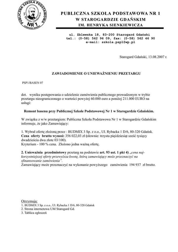 PUBLICZNA SZKOŁA PODSTAWOWA NR 1 W STAROGARDZIE GDAŃSKIM IM. HENRYKA SIENKIEWICZA ul. Zblewska 18, 83-200 Starogard Gdański tel.: (0-58) 562 96 09, fax: (0-58) 562 46 90 e-mail: [email protected] Starogard Gdański, 13.08.2007 r. ZAWIADOMIENIE O UNIEWAŻNIENIU PRZETARGU PSP1/BASEN 07 dot. wyniku postępowania o udzielenie zamówienia publicznego prowadzonym w trybie przetargu nieograniczonego o wartości powyżej 60.000 euro a poniżej 211.000 EURO na usługi: Remont basenu przy Publicznej Szkole Podstawowej Nr 1 w Starogardzie Gdańskim. W związku z w/w przetargiem: Publiczna Szkoła Podstawowa Nr 1 w Starogardzie Gdańskim informuje, że jako Zamawiający: 1. Wybrał ofertę złożoną przez : BUDMIX 3 Sp. z o.o., Ul. Rybacka 1 D/6, 80-320 Gdańsk. Cena oferty brutto wynosi: 356 022,03 zł (słownie: trzysta pięćdziesiąt sześć tysięcy dwadzieścia dwa złote 03/100). Kryterium - 100 % cena. Złożono jedna ważną ofertę. 2. Unieważnia przedmiotowy przetarg na podstawie art. 93 ust. 1 pkt 4) „cena najkorzystniejszej oferty przewyższa kwotę, którą zamawiający może przeznaczyć na sfinansowanie zamówienia”. Zamawiający może przeznaczyć na wykonanie powyższego zamówienia 194 937 zł brutto. Otrzymują: 1. BUDMIX 3 Sp. z o.o., Ul. Rybacka 1 D/6, 80-320 Gdańsk 2. Strona internetowa UM Starogard Gd. 3. Tablica ogłoszeń