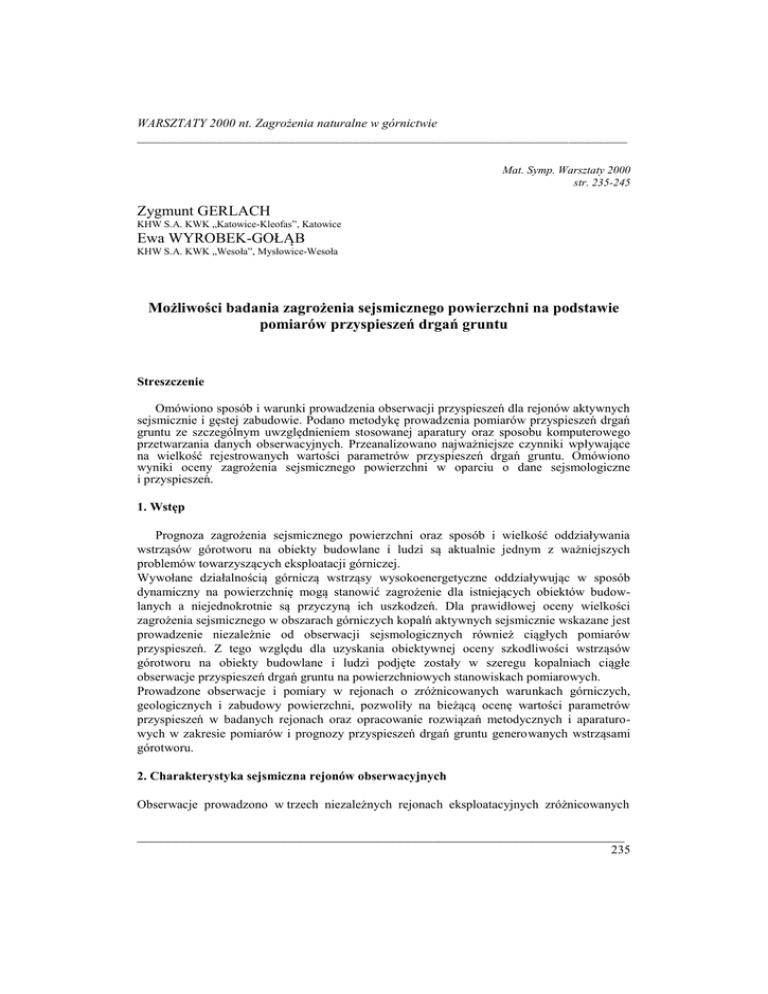 WARSZTATY 2000 nt. Zagrożenia naturalne w górnictwie ____________________________________________________________________________ Mat. Symp. Warsztaty 2000 str. 235-245 Zygmunt GERLACH KHW S.A. KWK „Katowice-Kleofas”, Katowice Ewa WYROBEK-GOŁĄB KHW S.A. KWK „Wesoła”, Mysłowice-Wesoła Możliwości badania zagrożenia sejsmicznego powierzchni na podstawie pomiarów przyspieszeń drgań gruntu Streszczenie Omówiono sposób i warunki prowadzenia obserwacji przyspieszeń dla rejonów aktywnych sejsmicznie i gęstej zabudowie. Podano metodykę prowadzenia pomiarów przyspieszeń drgań gruntu ze szczególnym uwzględnieniem stosowanej aparatury oraz sposobu komputerowego przetwarzania danych obserwacyjnych. Przeanalizowano najważniejsze czynniki wpływające na wielkość rejestrowanych wartości parametrów przyspieszeń drgań gruntu. Omówiono wyniki oceny zagrożenia sejsmicznego powierzchni w oparciu o dane sejsmologiczne i przyspieszeń. 1. Wstęp Prognoza zagrożenia sejsmicznego powierzchni oraz sposób i wielkość oddziaływania wstrząsów górotworu na obiekty budowlane i ludzi są aktualnie jednym z ważniejszych problemów towarzyszących eksploatacji górniczej. Wywołane działalnością górniczą wstrząsy wysokoenergetyczne oddziaływując w sposób dynamiczny na powierzchnię mogą stanowić zagrożenie dla istniejących obiektów budowlanych a niejednokrotnie są przyczyną ich uszkodzeń. Dla prawidłowej oceny wielkości zagrożenia sejsmicznego w obszarach górniczych kopalń aktywnych sejsmicznie wskazane jest prowadzenie niezależnie od obserwacji sejsmologicznych również ciągłych pomiarów przyspieszeń. Z tego względu dla uzyskania obiektywnej oceny szkodliwości wstrząsów górotworu na obiekty budowlane i ludzi podjęte zostały w szeregu kopalniach ciągłe obserwacje przyspieszeń drgań gruntu na powierzchniowych stanowiskach pomiarowych. Prowadzone obserwacje i pomiary w rejonach o zróżnicowanych warunkach górniczych, geologicznych i zabudowy powierzchni, pozwoliły na bieżącą ocenę wartości parametrów przyspieszeń w badanych rejonach oraz opracowanie rozwiązań metodycznych i aparaturowych w zakresie pomiarów i prognozy przyspieszeń drgań gruntu generowanych wstrząsami górotworu. 2. Charakterystyka sejsmiczna rejonów obserwacyjnych Obserwacje prowadzono w trzech niezależnych rejonach eksploatacyjnych zróżnicowanych _______________________________________________________________ 235 Z. GERLACH, E. WYROBEK-GOŁĄB - Możliwości badania zagrożenia sejsmicznego.... ____________________________________________________________________________ pod względem warunków górniczych (system eksploatacji, czynniki zagrożenia: krawędzie, resztki, zbliżanie się do chodników, zrobów) i geologicznych (warstwy siodłowe, brzeżne, głębokość zalegania eksploatowanych pokładów, uskoki itp.) oraz rodzaju zabudowy powierzchni (obiekty wysokie i niskie o różnych rozwiązaniach konstrukcyjnych).W szczególności badaniami objęte były następujące rejony eksploatacyjne: A - Rejon eksploatacji pokładu 510/I pod Osiedlem Paderewskiego KWK „Katowice-Kleofas”, B - Rejon eksploatacji pokładu 703/1-2-703/1-2-705/1 w dzielnicach Niedobczce-Radlin KWK „Marcel”, C - Rejon eksploatacji pokładu 507 w filarze ochronnym szybu LOMPA KWK „Rozbark”. Przedmiotowe rejony charakteryzowały się zwiększoną emisją sejsmiczną, która w poszczególnych latach przedstawiała się następująco: A. Rejon Osiedla Paderewskiego W okresie prowadzonej od 1.08.1994-31.07.1999r. eksploatacji pokładu 510 zanotowano łącznie 6430 wstrząsów o energii w przedziale od 10 3-106 J. Uzyskany ilościowy i energetyczny rozkład wstrząsów górotworu w analizowanych latach przedstawiono w tabeli 2.1. Tabela 2.1 Ilościowy i energetyczny rozkład wstrząsów górotworu w KWK „Katowice-Kleofas” rejon Osiedla Paderewskiego w okresie 1.08.1994 - 31.07.1999 r. Rok od 01.08.1994 1995 1996 1997 1998 do 31.07.1999 Razem 103 383 1371 2335 1103 425 374 5991 Ilość wstrząsów w klasach 104 105 106 30 116 4 1 196 4 1 64 1 14 8 428 9 2 107 - N 102-106 733 2690 4172 2160 961 882 11598 E x105 J 21,44 108,99 157,89 49,00 19,36 12,61 369,29 E/N x103 J 2,92 4,05 3,78 2,27 2,01 1,43 3,18 Emax 9x4 3x6 2x6 2x5 8x4 4x4 3x6 B. Rejon Dzielnicy Niedobczyce-Radlin W okresie prowadzonej od 1.01.1990-31.12.1999r. eksploatacji zanotowano łącznie 10266 wstrząsów o energii w przedziale od 103-106 J. Uzyskany ilościowy i energetyczny rozkład wstrząsów górotworu w analizowanych latach przedstawiono w tabeli 2.2. Tabela 2.2 Rozkład ilościowy i energetyczny wstrząsów w KWK "Marcel" w latach 19901999 Rok 1990 1991 1992 1993 1994 1995 1996 1997 1998 1999 103 J 713 310 273 314 742 1028 802 741 1584 817 7324 Ilość wstrząsów (N) 104 J 105 J 101 20 27 1 45 11 98 4 384 9 420 10 168 22 361 37 731 71 372 30 2707 215 106 J 1 1 10 5 3 20 N 102-106 2898 1837 1081 944 1970 2450 1995 2977 4892 2171 23215 E [J] x 107 1.32 0.39 0.50 0.59 1.90 2.50 2.50 6.64 8.82 4.08 29.24 Emax 2,8x5 1,4x6 4,2x5 8,2x5 5,2x5 3,5x6 8,6x5 8,7x6 6,4x6 4.4x6 8.7x6 _______________________________________________________________ 236 WARSZTATY 2000 nt. Zagrożenia naturalne w górnictwie ____________________________________________________________________________ C. Rejon filara ochronnego szybu LOMPA W okresie prowadzonej od 1.10.1996-31.12.1999r. eksploatacji pokładu 507 zanotowano łącznie 2202 wstrząsy o energii w przedziale od 10 3-105 J. Uzyskany ilościowy i energetyczny rozkład wstrząsów górotworu w analizowanych latach przedstawiono w tabeli 2.3. Tabela 2.3 Rozkład ilościowy i energetyczny wstrząsów w KWK "Rozbark" rejon LOMPA w latach 19961999 Ilość wstrząsów (N) Rok 1996 1997 1998 1999 N E [J] E/N Emax 103 J 104 J 105 J 106 J 102-106 x 105 x 103 J [J] 84 288 637 438 1447 14 97 137 248 1 1 - 89 499 906 708 2202 2,19 9,26 43,43 51,85 113,70 2,46 1,86 4,79 7,32 4,97 8,